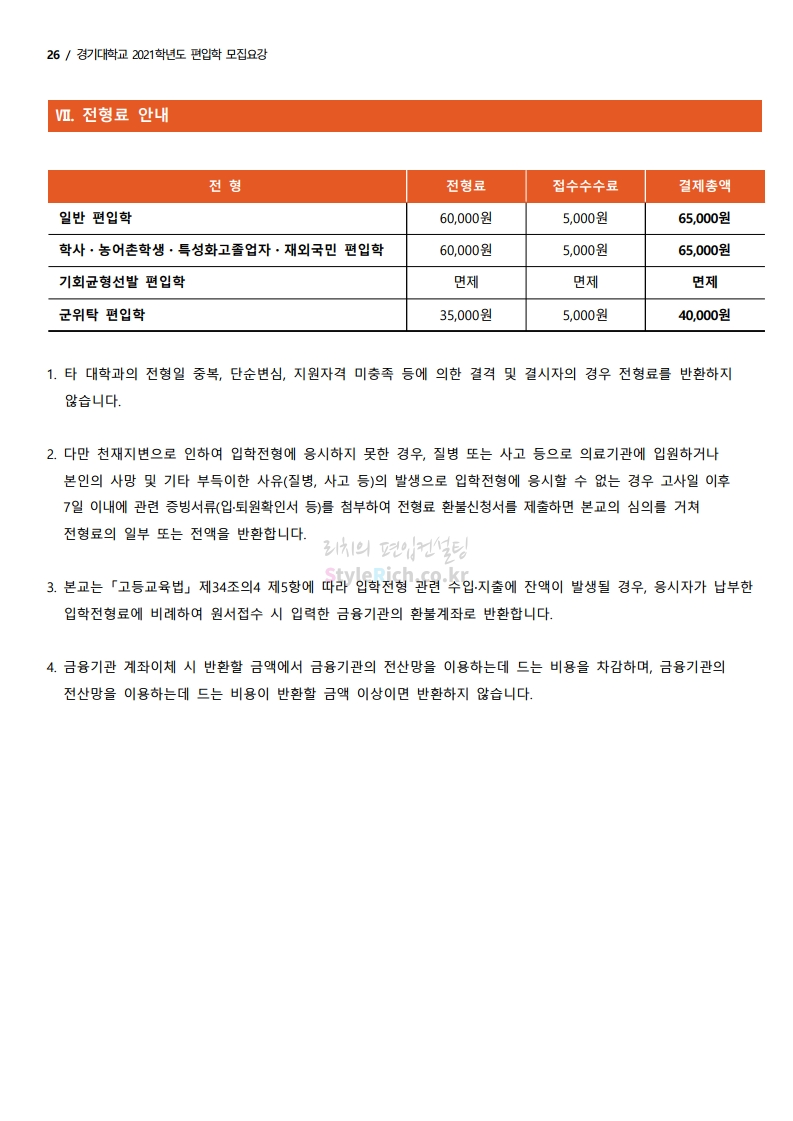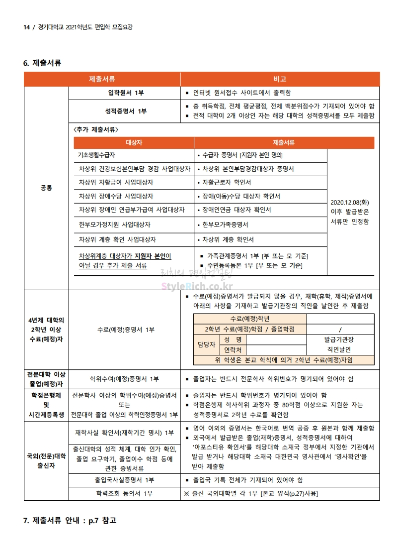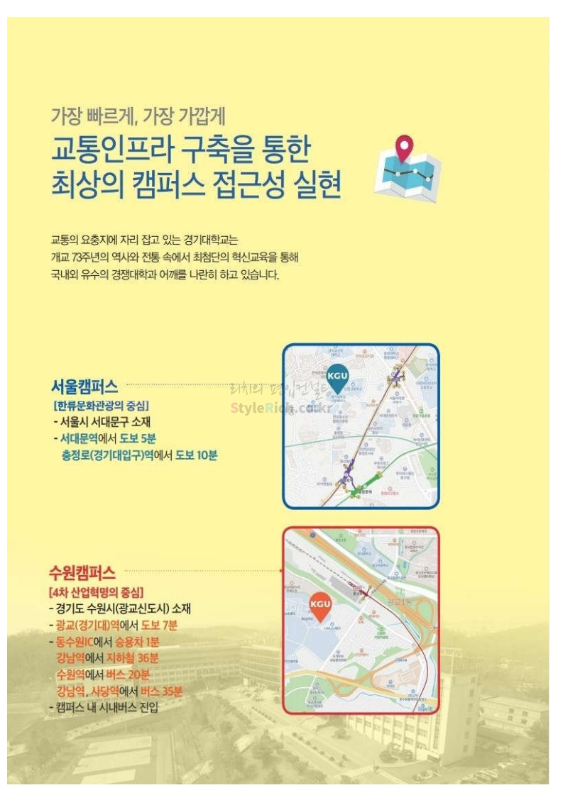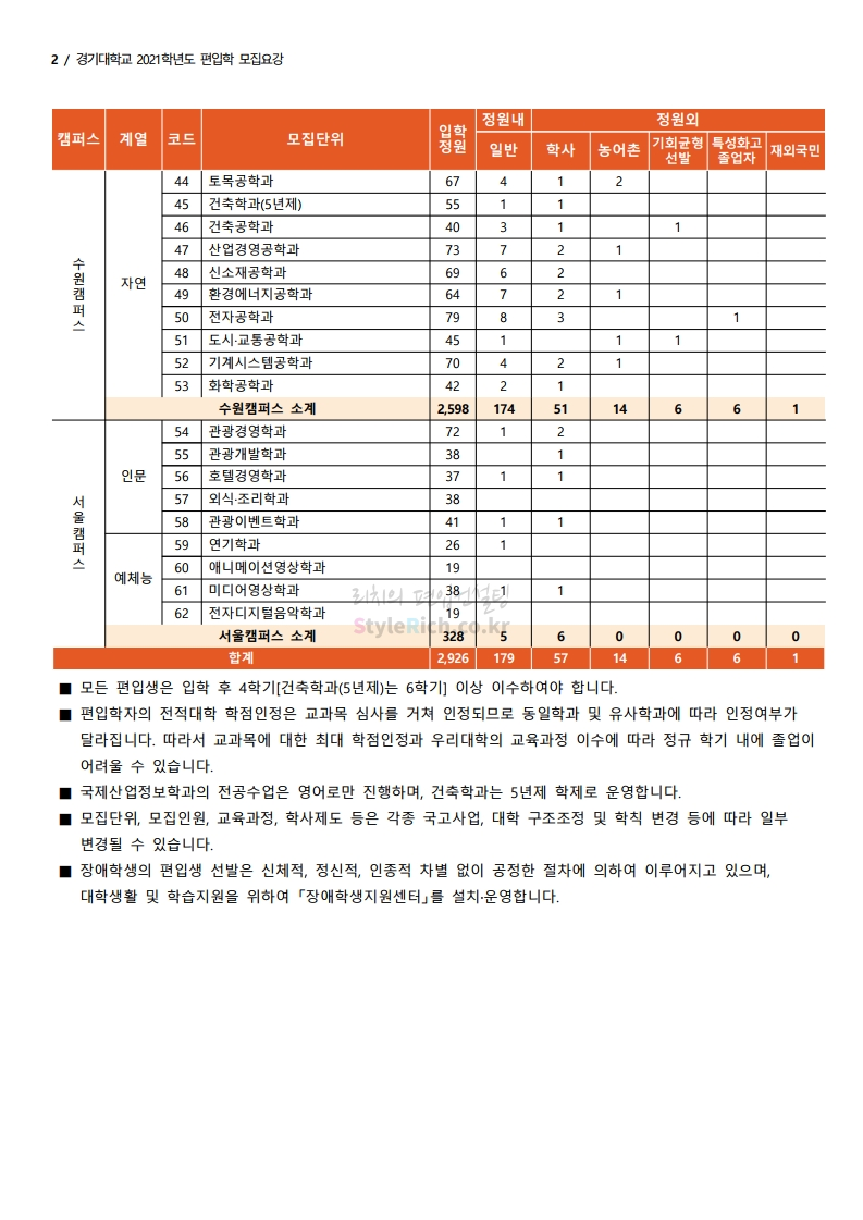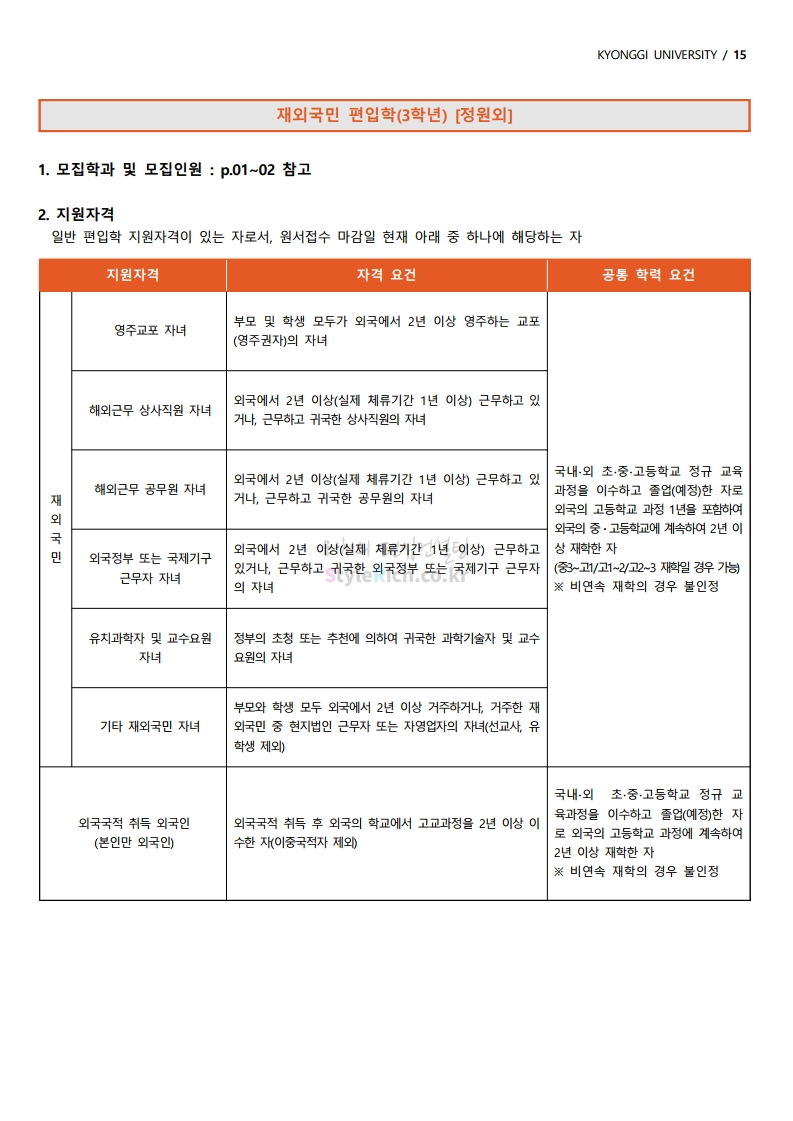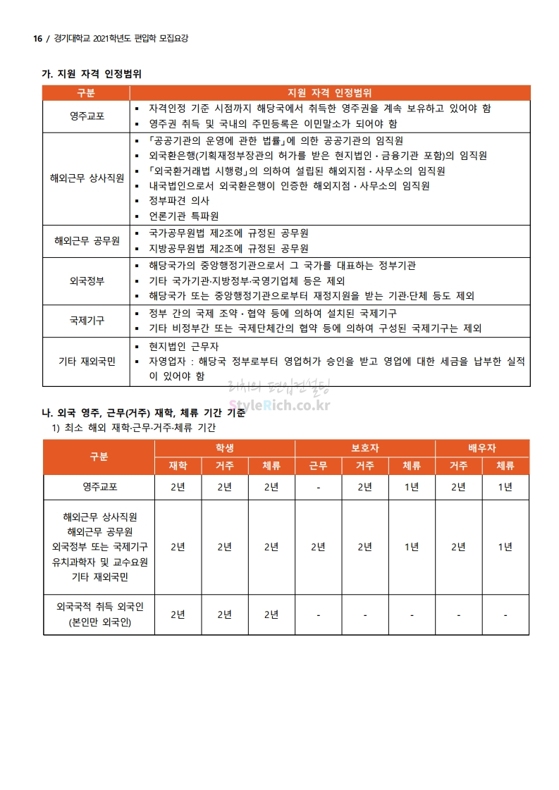 경기대 편입 2021학년도 모집요강 간편하게 보자! 2020.12.06 23:46 편입 모집요강/2021학년도 모집요강 2021학년도 경기대 편입 모집요강(2020.12.02 기준)을 간편하게 확인하세요. PC나 모바일에서 이미지를 클릭(터치) 후 이미지의 좌우측을 클릭(터치)하면 모집요강의 순서를 앞뒤로 넘길 수 있습니다. 좌측 클릭(터치)는 이전 페이지, 우측 클릭(터치)는 다음 페이지입니다. * 최종 모집요강 발표 이후에도 내용의 일부가 변경될 수 있으니 지원 전 반드시 경기대 입학처의 모집요강을 확인 바랍니다. 2021학년도 경기대 편입 모집요강 다운받기 2021학년도 편입학_모집요강.pdf 1.11MB <출처: 경기대> 경기대 웹드라마 [새내기학개론] 2화 공유하기 게시글 관리 리치의 편입컨설팅 저작자표시 비영리 변경금지 (새창열림) '편입 모집요강 > 2021학년도 모집요강' 카테고리의 다른 글 서울시립대 편입 2021학년도 모집요강 간편하게 보자! (0) 2020.12.08 서울과학기술대 편입 2021학년도 모집요강 간편하게 보자! (0) 2020.12.08 가톨릭대 편입 2021학년도 모집요강 간편하게 보자! (0) 2020.12.06 한국외대 편입 2021학년도 모집요강 간편하게 보자! (0) 2020.12.06 한국산업기술대 편입 2021학년도 모집요강 간편하게 보자! (0) 2020.12.06 댓글 공유하기 다른 글 댓글 이 글 공유하기 구독하기 구독하기 카카오톡 카카오톡 라인 라인 트위터 트위터 Facebook Facebook 카카오스토리 카카오스토리 밴드 밴드 네이버 블로그 네이버 블로그 Pocket Pocket Evernote Evernote 다른 글 서울시립대 편입 2021학년도 모집요강 간편하게 보자! 서울시립대 편입 2021학년도 모집요강 간편하게 보자! 2020.12.08 서울과학기술대 편입 2021학년도 모집요강 간편하게 보자! 서울과학기술대 편입 2021학년도 모집요강 간편하게 보자! 2020.12.08 가톨릭대 편입 2021학년도 모집요강 간편하게 보자! 가톨릭대 편입 2021학년도 모집요강 간편하게 보자! 2020.12.06 한국외대 편입 2021학년도 모집요강 간편하게 보자! 한국외대 편입 2021학년도 모집요강 간편하게 보자! 2020.12.06 다른 글 더 둘러보기