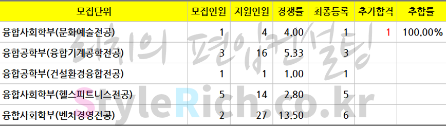* 전형방법에 따라 공인영어+대학수학, 공인영어, 공인영어+실기로 분류하여 추가합격이 많은 순으로 정렬하였습니다.