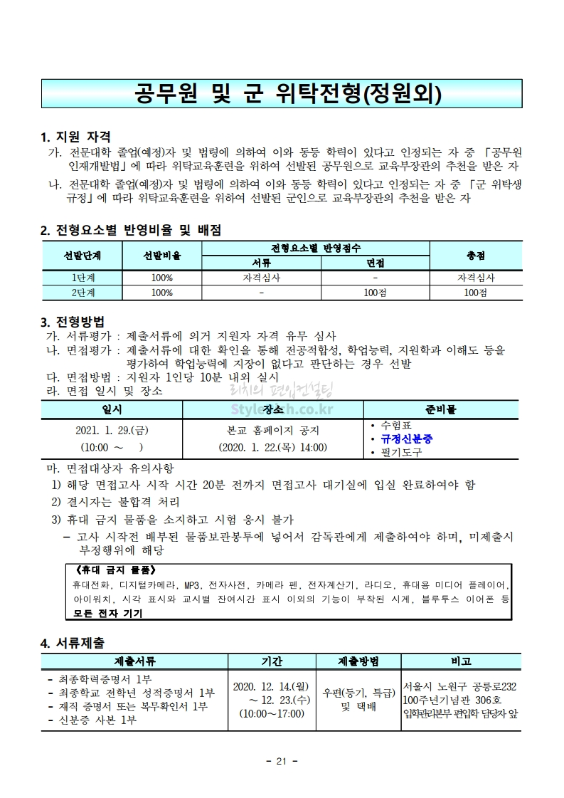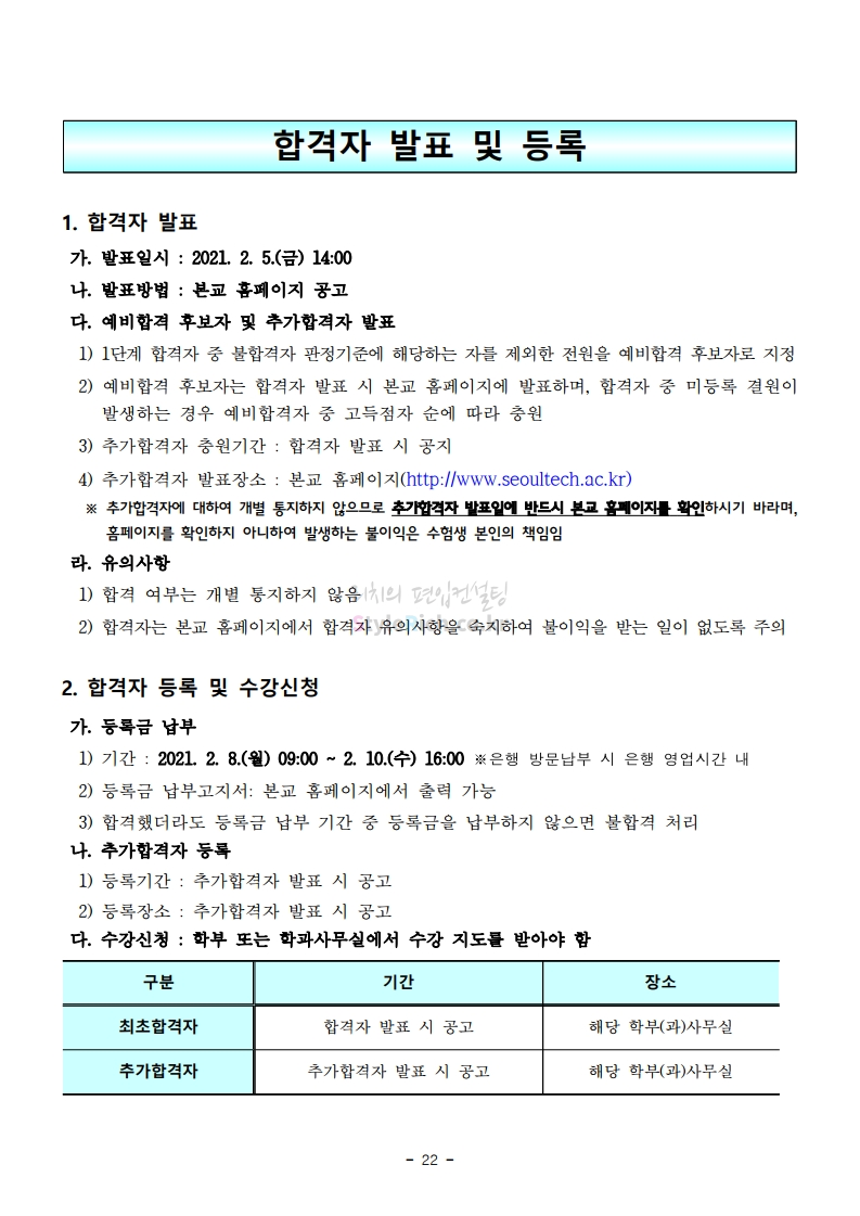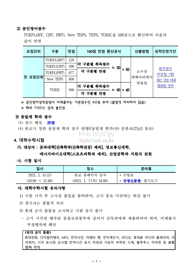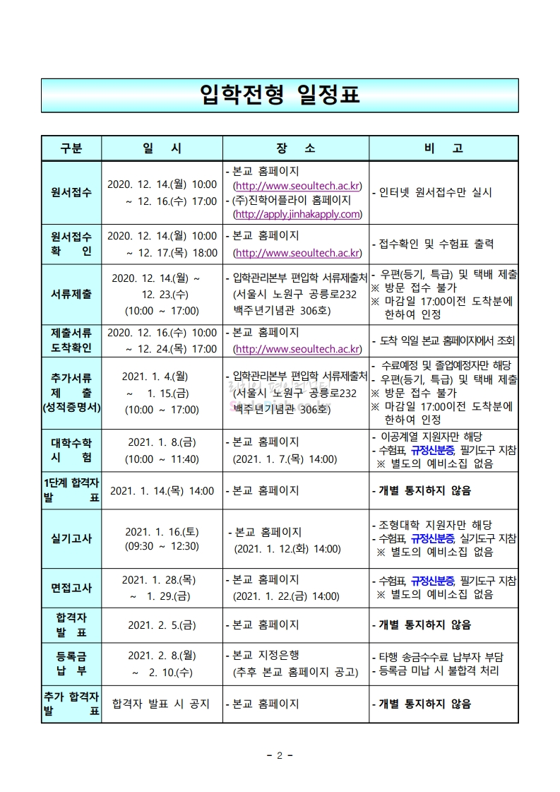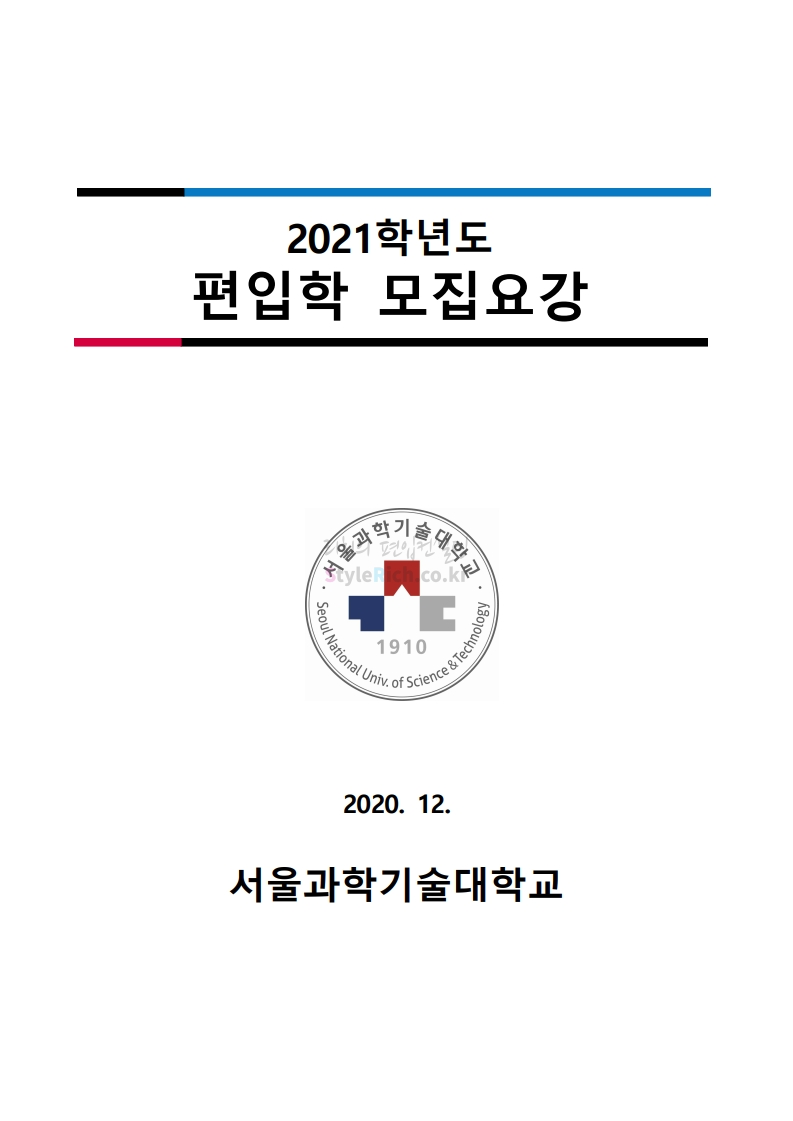 서울과학기술대 편입 2021학년도 모집요강 간편하게 보자! 2020.12.08 00:47 편입 모집요강/2021학년도 모집요강 2021학년도 서울과학기술대 편입 모집요강(2020.12.04 기준)을 간편하게 확인하세요. PC나 모바일에서 이미지를 클릭(터치) 후 이미지의 좌우측을 클릭(터치)하면 모집요강의 순서를 앞뒤로 넘길 수 있습니다. 좌측 클릭(터치)는 이전 페이지, 우측 클릭(터치)는 다음 페이지입니다. * 최종 모집요강 발표 이후에도 내용의 일부가 변경될 수 있으니 지원 전 반드시 서울과학기술대 입학처의 모집요강을 확인바랍니다. 2021학년도 서울과학기술대 편입 모집요강 다운받기 (붙임)2021학년도 편입학 모집요강.pdf 0.69MB <출처: 서울과학기술대> 서울과학기술대학교 캠퍼스대탐험 공유하기 게시글 관리 리치의 편입컨설팅 저작자표시 비영리 변경금지 (새창열림) '편입 모집요강 > 2021학년도 모집요강' 카테고리의 다른 글 수원대 편입 2021학년도 모집요강 간편하게 보자! (0) 2020.12.08 서울시립대 편입 2021학년도 모집요강 간편하게 보자! (0) 2020.12.08 경기대 편입 2021학년도 모집요강 간편하게 보자! (0) 2020.12.06 가톨릭대 편입 2021학년도 모집요강 간편하게 보자! (0) 2020.12.06 한국외대 편입 2021학년도 모집요강 간편하게 보자! (0) 2020.12.06 댓글 공유하기 다른 글 댓글 이 글 공유하기 구독하기 구독하기 카카오톡 카카오톡 라인 라인 트위터 트위터 Facebook Facebook 카카오스토리 카카오스토리 밴드 밴드 네이버 블로그 네이버 블로그 Pocket Pocket Evernote Evernote 다른 글 수원대 편입 2021학년도 모집요강 간편하게 보자! 수원대 편입 2021학년도 모집요강 간편하게 보자! 2020.12.08 서울시립대 편입 2021학년도 모집요강 간편하게 보자! 서울시립대 편입 2021학년도 모집요강 간편하게 보자! 2020.12.08 경기대 편입 2021학년도 모집요강 간편하게 보자! 경기대 편입 2021학년도 모집요강 간편하게 보자! 2020.12.06 가톨릭대 편입 2021학년도 모집요강 간편하게 보자! 가톨릭대 편입 2021학년도 모집요강 간편하게 보자! 2020.12.06 다른 글 더 둘러보기