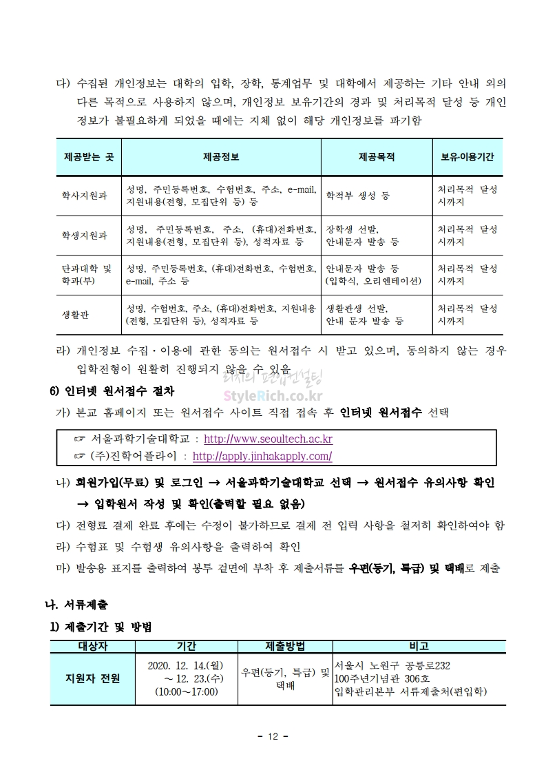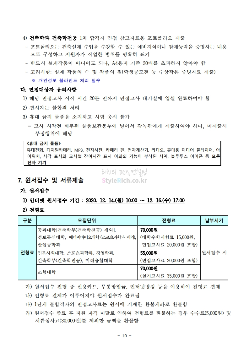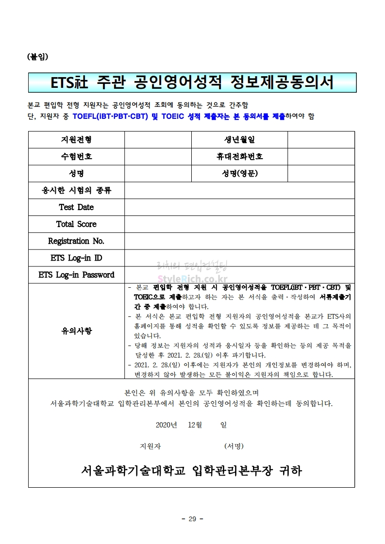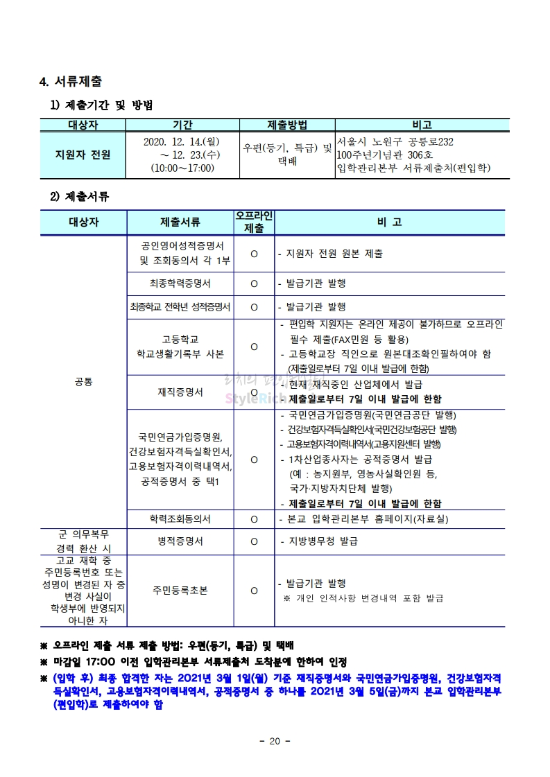 서울과학기술대 편입 2021학년도 모집요강 간편하게 보자! 2020.12.08 00:47 편입 모집요강/2021학년도 모집요강 2021학년도 서울과학기술대 편입 모집요강(2020.12.04 기준)을 간편하게 확인하세요. PC나 모바일에서 이미지를 클릭(터치) 후 이미지의 좌우측을 클릭(터치)하면 모집요강의 순서를 앞뒤로 넘길 수 있습니다. 좌측 클릭(터치)는 이전 페이지, 우측 클릭(터치)는 다음 페이지입니다. * 최종 모집요강 발표 이후에도 내용의 일부가 변경될 수 있으니 지원 전 반드시 서울과학기술대 입학처의 모집요강을 확인바랍니다. 2021학년도 서울과학기술대 편입 모집요강 다운받기 (붙임)2021학년도 편입학 모집요강.pdf 0.69MB <출처: 서울과학기술대> 서울과학기술대학교 캠퍼스대탐험 공유하기 게시글 관리 리치의 편입컨설팅 저작자표시 비영리 변경금지 (새창열림) '편입 모집요강 > 2021학년도 모집요강' 카테고리의 다른 글 수원대 편입 2021학년도 모집요강 간편하게 보자! (0) 2020.12.08 서울시립대 편입 2021학년도 모집요강 간편하게 보자! (0) 2020.12.08 경기대 편입 2021학년도 모집요강 간편하게 보자! (0) 2020.12.06 가톨릭대 편입 2021학년도 모집요강 간편하게 보자! (0) 2020.12.06 한국외대 편입 2021학년도 모집요강 간편하게 보자! (0) 2020.12.06 댓글 공유하기 다른 글 댓글 이 글 공유하기 구독하기 구독하기 카카오톡 카카오톡 라인 라인 트위터 트위터 Facebook Facebook 카카오스토리 카카오스토리 밴드 밴드 네이버 블로그 네이버 블로그 Pocket Pocket Evernote Evernote 다른 글 수원대 편입 2021학년도 모집요강 간편하게 보자! 수원대 편입 2021학년도 모집요강 간편하게 보자! 2020.12.08 서울시립대 편입 2021학년도 모집요강 간편하게 보자! 서울시립대 편입 2021학년도 모집요강 간편하게 보자! 2020.12.08 경기대 편입 2021학년도 모집요강 간편하게 보자! 경기대 편입 2021학년도 모집요강 간편하게 보자! 2020.12.06 가톨릭대 편입 2021학년도 모집요강 간편하게 보자! 가톨릭대 편입 2021학년도 모집요강 간편하게 보자! 2020.12.06 다른 글 더 둘러보기