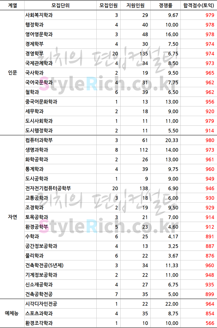 * 모집단위별 1단계 합격자의 공인영어(토익) 평균성적입니다.