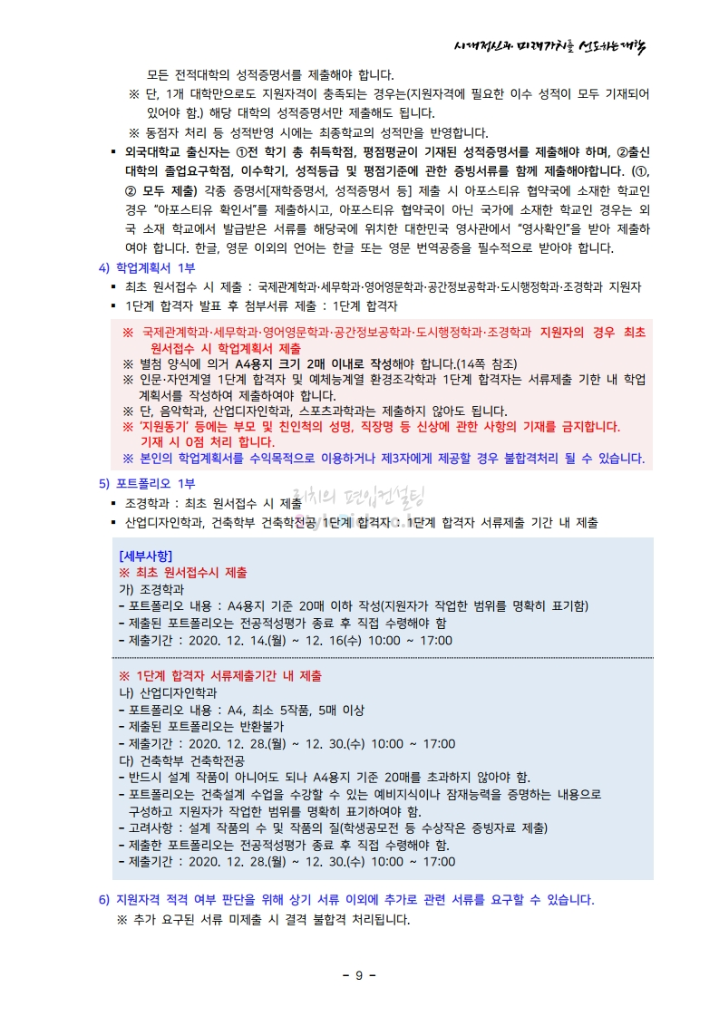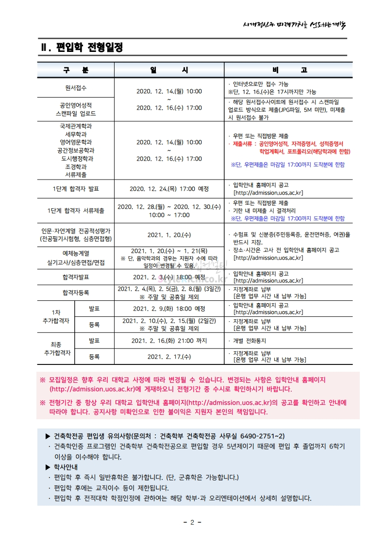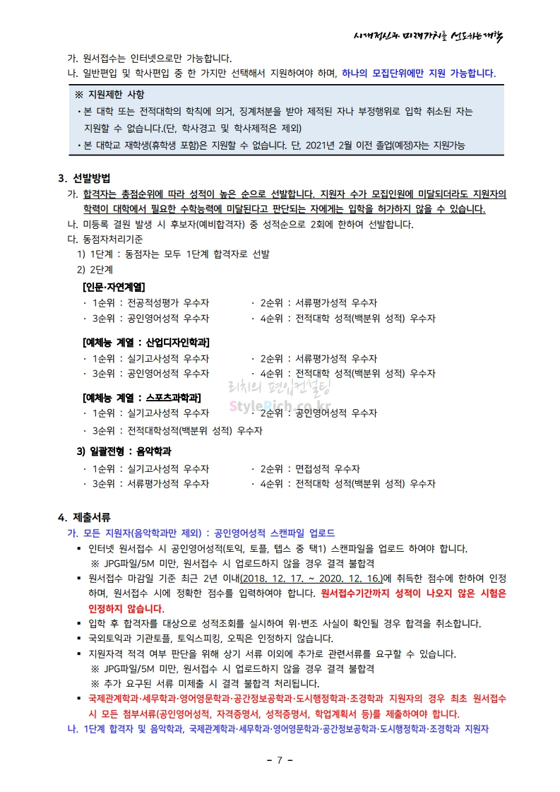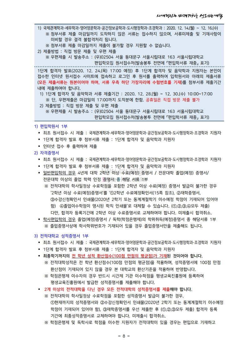 서울시립대 편입 2021학년도 모집요강 간편하게 보자! 2020.12.08 22:28 편입 모집요강/2021학년도 모집요강 2021학년도 서울시립대 편입 모집요강(2020.12.04 기준)을 간편하게 확인하세요. PC나 모바일에서 이미지를 클릭(터치) 후 이미지의 좌우측을 클릭(터치)하면 모집요강의 순서를 앞뒤로 넘길 수 있습니다. 좌측 클릭(터치)는 이전 페이지, 우측 클릭(터치)는 다음 페이지입니다. * 최종 모집요강 발표 이후에도 내용의 일부가 변경될 수 있으니 지원 전 반드시 서울시립대 입학처의 모집요강을 확인바랍니다. 2021학년도 서울시립대 편입 모집요강 다운받기 2021_pyunib_201204.pdf 1.01MB <출처: 서울시립대> 0:08 / 4:49 [스카우터] 서울시립대 시험기간 브이로그! 공유하기 게시글 관리 리치의 편입컨설팅 저작자표시 비영리 변경금지 (새창열림) '편입 모집요강 > 2021학년도 모집요강' 카테고리의 다른 글 숭실대 편입 2021학년도 모집요강 간편하게 보자! (0) 2020.12.08 수원대 편입 2021학년도 모집요강 간편하게 보자! (0) 2020.12.08 서울과학기술대 편입 2021학년도 모집요강 간편하게 보자! (0) 2020.12.08 경기대 편입 2021학년도 모집요강 간편하게 보자! (0) 2020.12.06 가톨릭대 편입 2021학년도 모집요강 간편하게 보자! (0) 2020.12.06 댓글 공유하기 다른 글 댓글 이 글 공유하기 구독하기 구독하기 카카오톡 카카오톡 라인 라인 트위터 트위터 Facebook Facebook 카카오스토리 카카오스토리 밴드 밴드 네이버 블로그 네이버 블로그 Pocket Pocket Evernote Evernote 다른 글 숭실대 편입 2021학년도 모집요강 간편하게 보자! 숭실대 편입 2021학년도 모집요강 간편하게 보자! 2020.12.08 수원대 편입 2021학년도 모집요강 간편하게 보자! 수원대 편입 2021학년도 모집요강 간편하게 보자! 2020.12.08 서울과학기술대 편입 2021학년도 모집요강 간편하게 보자! 서울과학기술대 편입 2021학년도 모집요강 간편하게 보자! 2020.12.08 경기대 편입 2021학년도 모집요강 간편하게 보자! 경기대 편입 2021학년도 모집요강 간편하게 보자! 2020.12.06 다른 글 더 둘러보기
