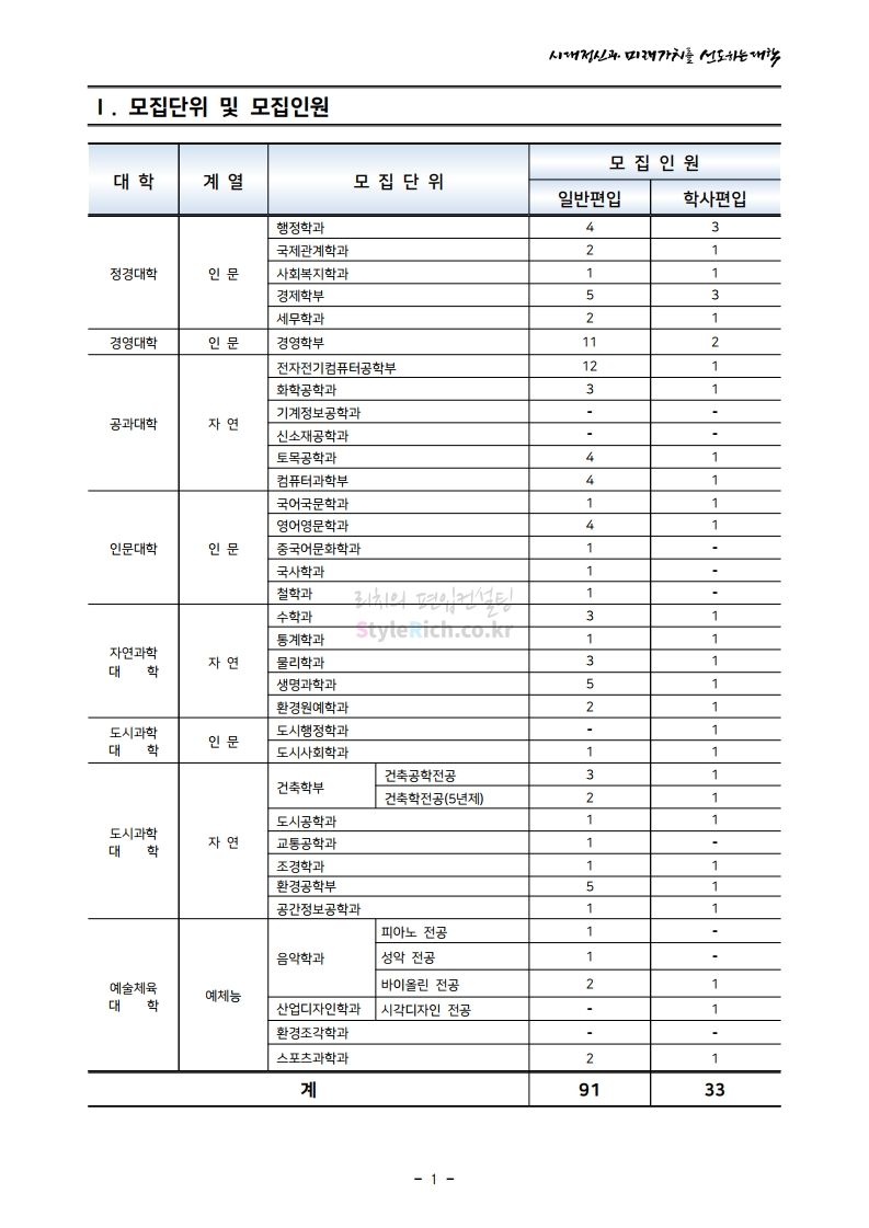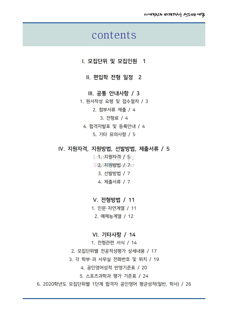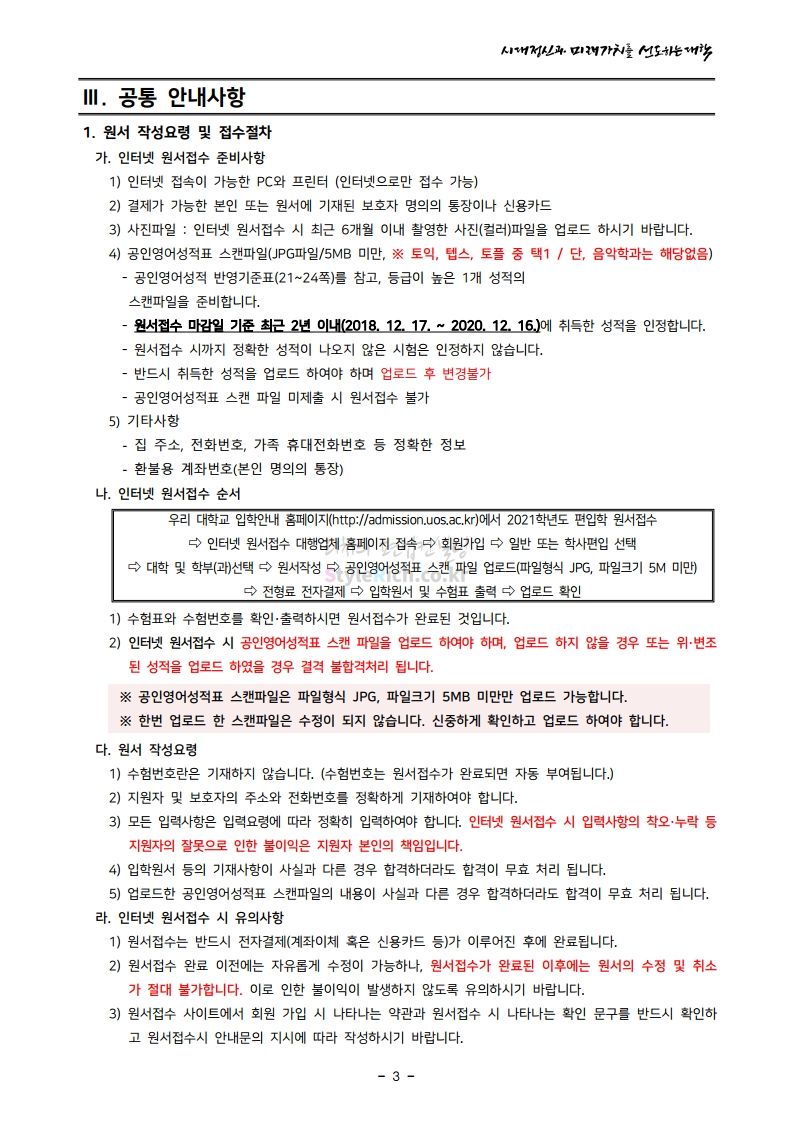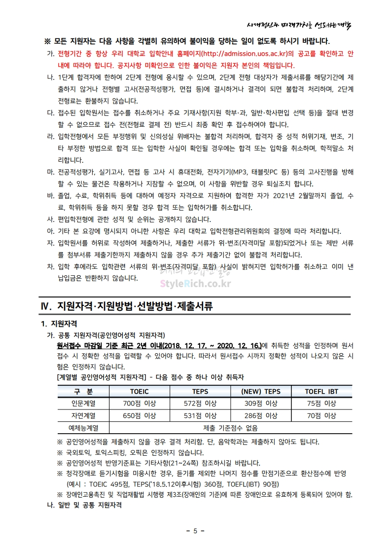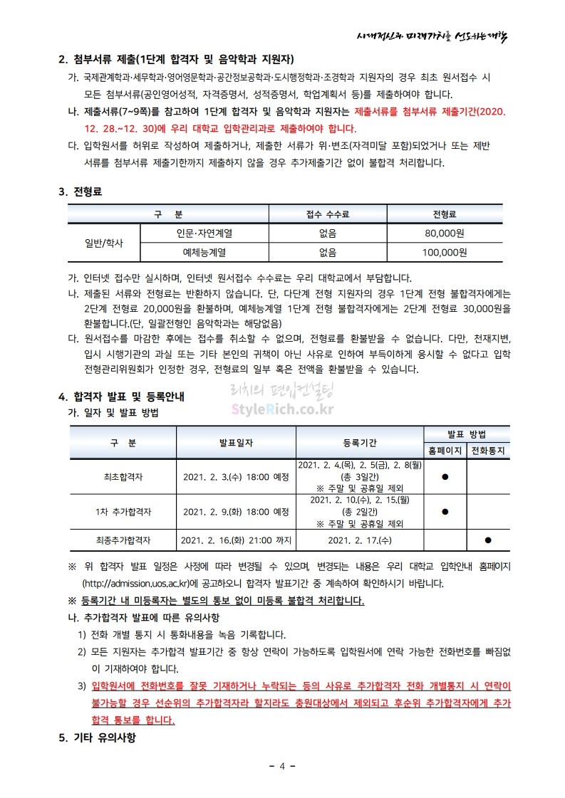 서울시립대 편입 2021학년도 모집요강 간편하게 보자! 2020.12.08 22:28 편입 모집요강/2021학년도 모집요강 2021학년도 서울시립대 편입 모집요강(2020.12.04 기준)을 간편하게 확인하세요. PC나 모바일에서 이미지를 클릭(터치) 후 이미지의 좌우측을 클릭(터치)하면 모집요강의 순서를 앞뒤로 넘길 수 있습니다. 좌측 클릭(터치)는 이전 페이지, 우측 클릭(터치)는 다음 페이지입니다. * 최종 모집요강 발표 이후에도 내용의 일부가 변경될 수 있으니 지원 전 반드시 서울시립대 입학처의 모집요강을 확인바랍니다. 2021학년도 서울시립대 편입 모집요강 다운받기 2021_pyunib_201204.pdf 1.01MB <출처: 서울시립대> 0:08 / 4:49 [스카우터] 서울시립대 시험기간 브이로그! 공유하기 게시글 관리 리치의 편입컨설팅 저작자표시 비영리 변경금지 (새창열림) '편입 모집요강 > 2021학년도 모집요강' 카테고리의 다른 글 숭실대 편입 2021학년도 모집요강 간편하게 보자! (0) 2020.12.08 수원대 편입 2021학년도 모집요강 간편하게 보자! (0) 2020.12.08 서울과학기술대 편입 2021학년도 모집요강 간편하게 보자! (0) 2020.12.08 경기대 편입 2021학년도 모집요강 간편하게 보자! (0) 2020.12.06 가톨릭대 편입 2021학년도 모집요강 간편하게 보자! (0) 2020.12.06 댓글 공유하기 다른 글 댓글 이 글 공유하기 구독하기 구독하기 카카오톡 카카오톡 라인 라인 트위터 트위터 Facebook Facebook 카카오스토리 카카오스토리 밴드 밴드 네이버 블로그 네이버 블로그 Pocket Pocket Evernote Evernote 다른 글 숭실대 편입 2021학년도 모집요강 간편하게 보자! 숭실대 편입 2021학년도 모집요강 간편하게 보자! 2020.12.08 수원대 편입 2021학년도 모집요강 간편하게 보자! 수원대 편입 2021학년도 모집요강 간편하게 보자! 2020.12.08 서울과학기술대 편입 2021학년도 모집요강 간편하게 보자! 서울과학기술대 편입 2021학년도 모집요강 간편하게 보자! 2020.12.08 경기대 편입 2021학년도 모집요강 간편하게 보자! 경기대 편입 2021학년도 모집요강 간편하게 보자! 2020.12.06 다른 글 더 둘러보기