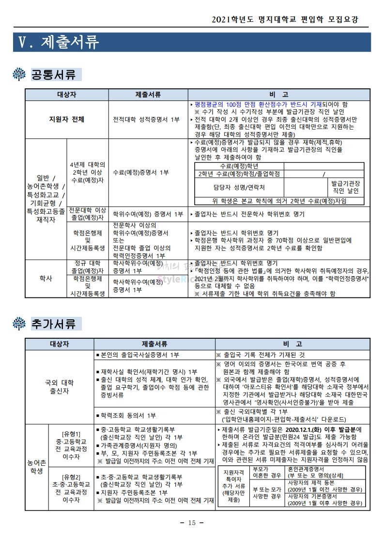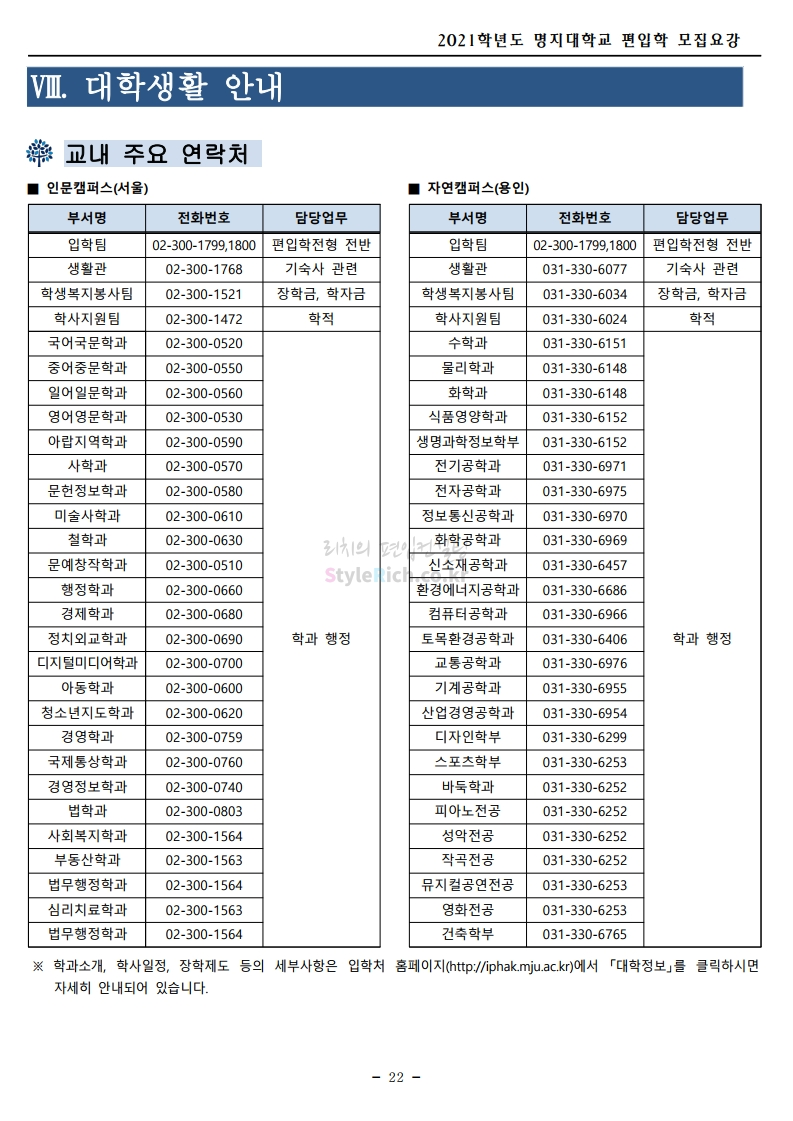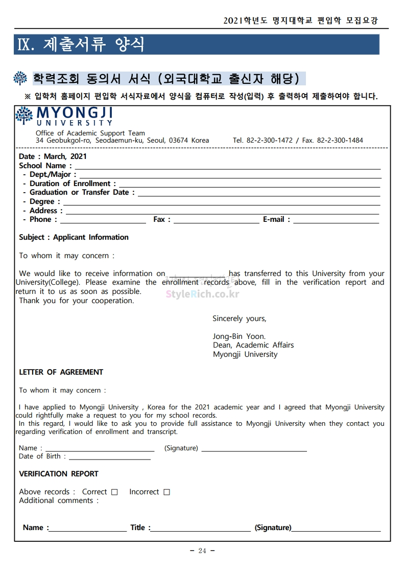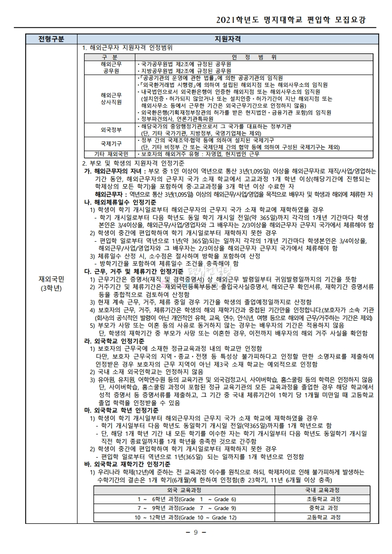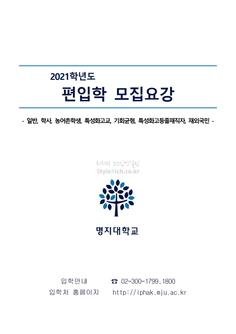 명지대 편입 2021학년도 모집요강 간편하게 보자! 2020.12.09 23:47 편입 모집요강/2021학년도 모집요강 2021학년도 명지대 편입 모집요강(2020.12.08 기준)을 간편하게 확인하세요. PC나 모바일에서 이미지를 클릭(터치) 후 이미지의 좌우측을 클릭(터치)하면 모집요강의 순서를 앞뒤로 넘길 수 있습니다. 좌측 클릭(터치)는 이전 페이지, 우측 클릭(터치)는 다음 페이지입니다. * 최종 모집요강 발표 이후에도 내용의 일부가 변경될 수 있으니 지원 전 반드시 명지대 입학처의 모집요강을 확인바랍니다. 2021학년도 명지대 편입 모집요강 다운받기 2021_편입학 모집요강_입학홈페이지 공지.pdf 0.69MB <출처: 명지대> 명지대학교 자연캠퍼스 도서관 '대학생활의 첫걸음 도서관 활용법' - 청각장애인을 위한 자막 Ver. 공유하기 게시글 관리 리치의 편입컨설팅 저작자표시 비영리 변경금지 (새창열림) '편입 모집요강 > 2021학년도 모집요강' 카테고리의 다른 글 세종대 편입 2021학년도 모집요강 간편하게 보자! (0) 2020.12.11 서강대 편입 2021학년도 모집요강 간편하게 보자! (0) 2020.12.10 동국대 편입 2021학년도 모집요강 간편하게 보자! (0) 2020.12.09 광운대 편입 2021학년도 모집요강 간편하게 보자! (0) 2020.12.09 고려대 편입 2021학년도 모집요강 간편하게 보자!(2020.12.16 수정) (0) 2020.12.09 댓글 공유하기 다른 글 댓글 이 글 공유하기 구독하기 구독하기 카카오톡 카카오톡 라인 라인 트위터 트위터 Facebook Facebook 카카오스토리 카카오스토리 밴드 밴드 네이버 블로그 네이버 블로그 Pocket Pocket Evernote Evernote 다른 글 세종대 편입 2021학년도 모집요강 간편하게 보자! 세종대 편입 2021학년도 모집요강 간편하게 보자! 2020.12.11 서강대 편입 2021학년도 모집요강 간편하게 보자! 서강대 편입 2021학년도 모집요강 간편하게 보자! 2020.12.10 동국대 편입 2021학년도 모집요강 간편하게 보자! 동국대 편입 2021학년도 모집요강 간편하게 보자! 2020.12.09 광운대 편입 2021학년도 모집요강 간편하게 보자! 광운대 편입 2021학년도 모집요강 간편하게 보자! 2020.12.09 다른 글 더 둘러보기