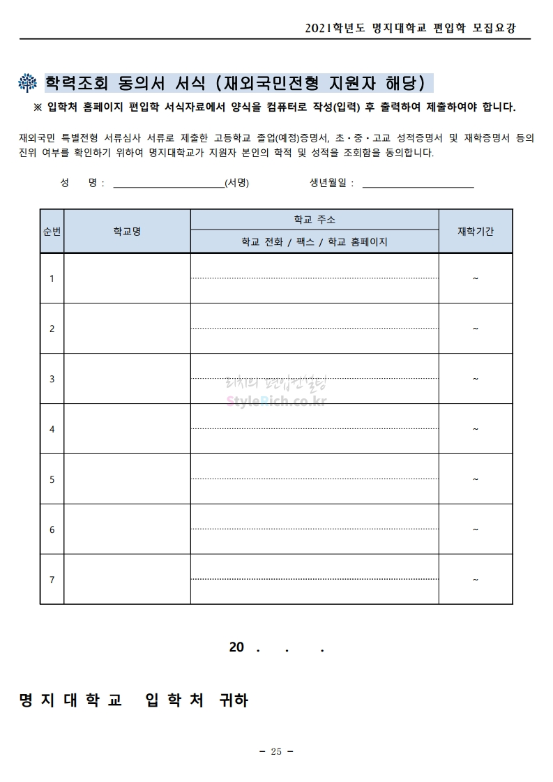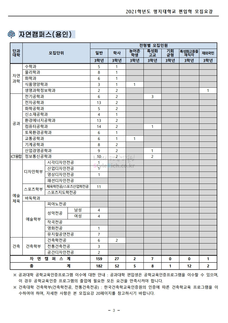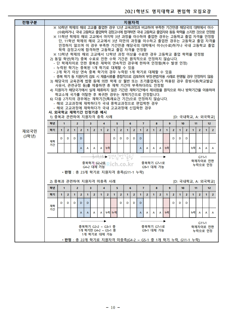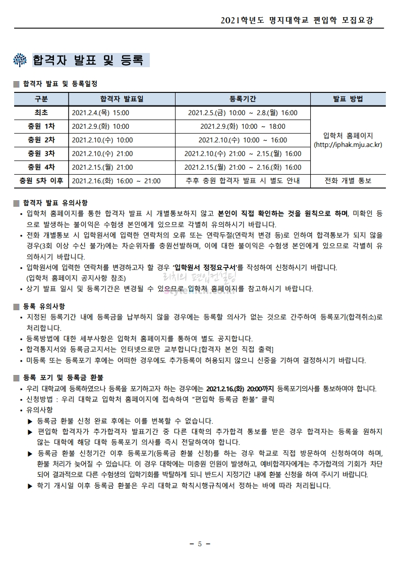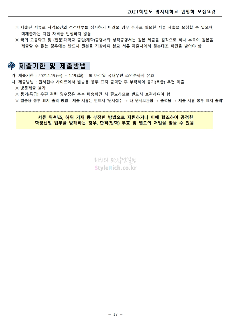 명지대 편입 2021학년도 모집요강 간편하게 보자! 2020.12.09 23:47 편입 모집요강/2021학년도 모집요강 2021학년도 명지대 편입 모집요강(2020.12.08 기준)을 간편하게 확인하세요. PC나 모바일에서 이미지를 클릭(터치) 후 이미지의 좌우측을 클릭(터치)하면 모집요강의 순서를 앞뒤로 넘길 수 있습니다. 좌측 클릭(터치)는 이전 페이지, 우측 클릭(터치)는 다음 페이지입니다. * 최종 모집요강 발표 이후에도 내용의 일부가 변경될 수 있으니 지원 전 반드시 명지대 입학처의 모집요강을 확인바랍니다. 2021학년도 명지대 편입 모집요강 다운받기 2021_편입학 모집요강_입학홈페이지 공지.pdf 0.69MB <출처: 명지대> 명지대학교 자연캠퍼스 도서관 '대학생활의 첫걸음 도서관 활용법' - 청각장애인을 위한 자막 Ver. 공유하기 게시글 관리 리치의 편입컨설팅 저작자표시 비영리 변경금지 (새창열림) '편입 모집요강 > 2021학년도 모집요강' 카테고리의 다른 글 세종대 편입 2021학년도 모집요강 간편하게 보자! (0) 2020.12.11 서강대 편입 2021학년도 모집요강 간편하게 보자! (0) 2020.12.10 동국대 편입 2021학년도 모집요강 간편하게 보자! (0) 2020.12.09 광운대 편입 2021학년도 모집요강 간편하게 보자! (0) 2020.12.09 고려대 편입 2021학년도 모집요강 간편하게 보자!(2020.12.16 수정) (0) 2020.12.09 댓글 공유하기 다른 글 댓글 이 글 공유하기 구독하기 구독하기 카카오톡 카카오톡 라인 라인 트위터 트위터 Facebook Facebook 카카오스토리 카카오스토리 밴드 밴드 네이버 블로그 네이버 블로그 Pocket Pocket Evernote Evernote 다른 글 세종대 편입 2021학년도 모집요강 간편하게 보자! 세종대 편입 2021학년도 모집요강 간편하게 보자! 2020.12.11 서강대 편입 2021학년도 모집요강 간편하게 보자! 서강대 편입 2021학년도 모집요강 간편하게 보자! 2020.12.10 동국대 편입 2021학년도 모집요강 간편하게 보자! 동국대 편입 2021학년도 모집요강 간편하게 보자! 2020.12.09 광운대 편입 2021학년도 모집요강 간편하게 보자! 광운대 편입 2021학년도 모집요강 간편하게 보자! 2020.12.09 다른 글 더 둘러보기