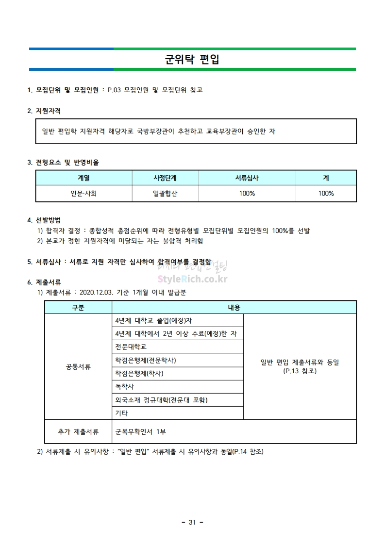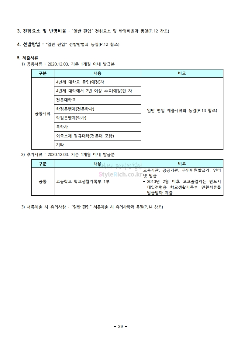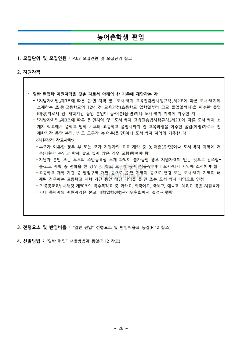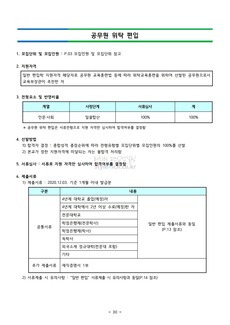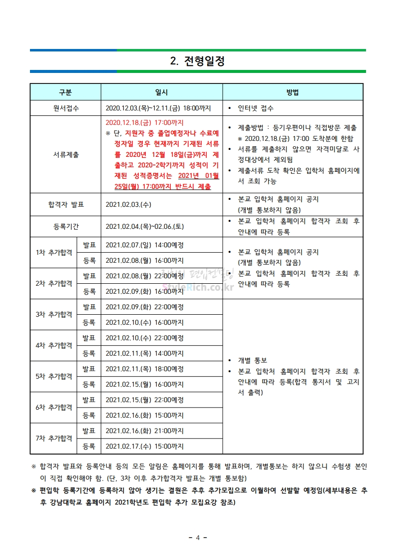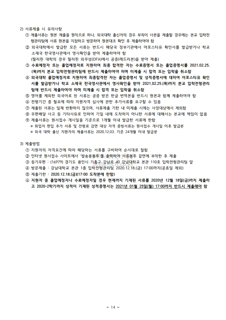 강남대 편입 2021학년도 모집요강 간편하게 보자! 2020.12.11 01:18 편입 모집요강/2021학년도 모집요강 2021학년도 강남대 편입 모집요강(2020.11.27 기준)을 간편하게 확인하세요. PC나 모바일에서 이미지를 클릭(터치) 후 이미지의 좌우측을 클릭(터치)하면 모집요강의 순서를 앞뒤로 넘길 수 있습니다. 좌측 클릭(터치)는 이전 페이지, 우측 클릭(터치)는 다음 페이지입니다. * 최종 모집요강 발표 이후에도 내용의 일부가 변경될 수 있으니 지원 전 반드시 강남대 입학처의 모집요강을 확인바랍니다. 2021학년도 강남대 편입 모집요강 다운받기 2021학년도 편입학 모집요강_[게시용].pdf 0.87MB <출처: 강남대> 2020년 국제청소년리더 교류지원사업 결과 영상 공유하기 게시글 관리 리치의 편입컨설팅 저작자표시 비영리 변경금지 (새창열림) '편입 모집요강 > 2021학년도 모집요강' 카테고리의 다른 글 상명대 편입 2021학년도 모집요강 간편하게 보자! (0) 2020.12.16 상명대(천안) 편입 2021학년도 모집요강 간편하게 보자! (0) 2020.12.16 세종대 편입 2021학년도 모집요강 간편하게 보자! (0) 2020.12.11 서강대 편입 2021학년도 모집요강 간편하게 보자! (0) 2020.12.10 명지대 편입 2021학년도 모집요강 간편하게 보자! (0) 2020.12.09 댓글 공유하기 다른 글 댓글 이 글 공유하기 구독하기 구독하기 카카오톡 카카오톡 라인 라인 트위터 트위터 Facebook Facebook 카카오스토리 카카오스토리 밴드 밴드 네이버 블로그 네이버 블로그 Pocket Pocket Evernote Evernote 다른 글 상명대 편입 2021학년도 모집요강 간편하게 보자! 상명대 편입 2021학년도 모집요강 간편하게 보자! 2020.12.16 상명대(천안) 편입 2021학년도 모집요강 간편하게 보자! 상명대(천안) 편입 2021학년도 모집요강 간편하게 보자! 2020.12.16 세종대 편입 2021학년도 모집요강 간편하게 보자! 세종대 편입 2021학년도 모집요강 간편하게 보자! 2020.12.11 서강대 편입 2021학년도 모집요강 간편하게 보자! 서강대 편입 2021학년도 모집요강 간편하게 보자! 2020.12.10 다른 글 더 둘러보기