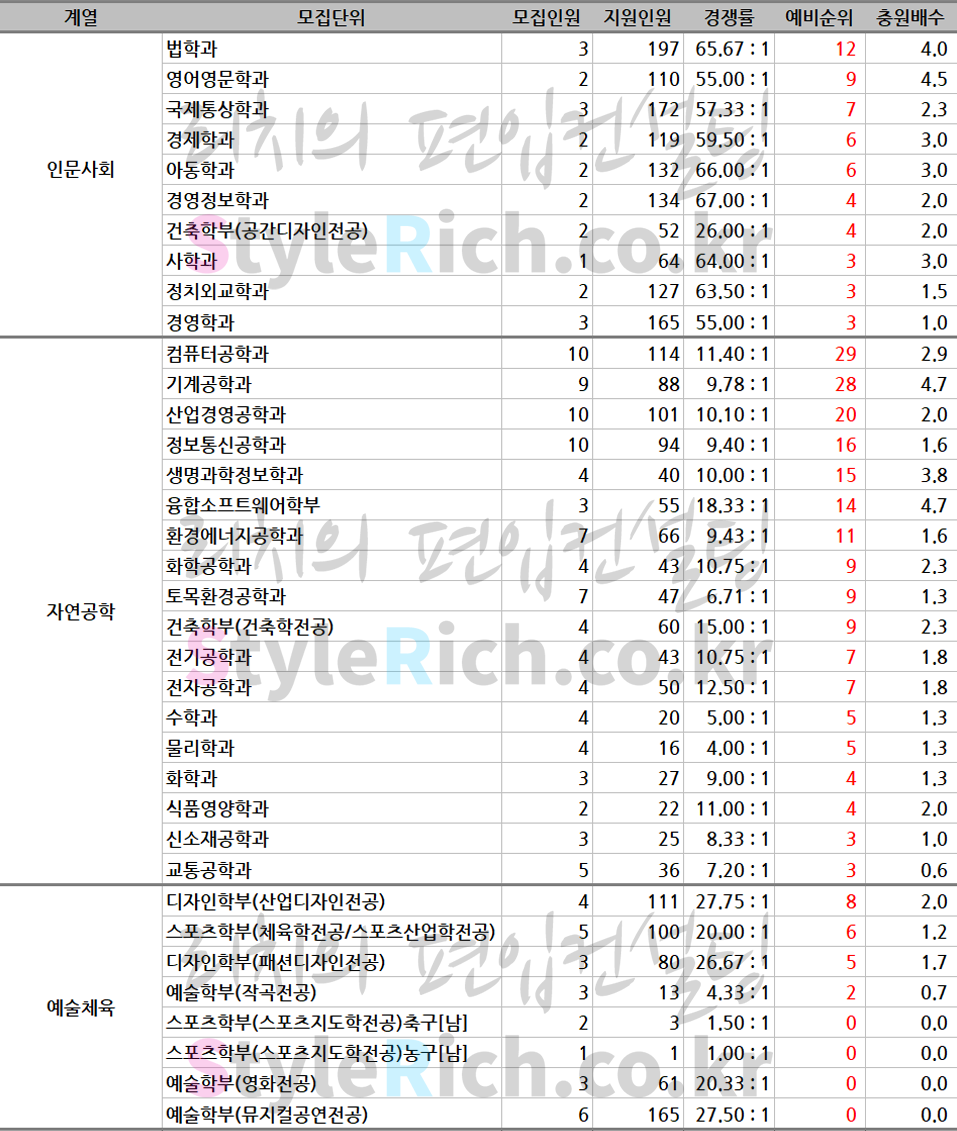 * 인문사회계열: 인문대학, 사회과학대학, 경영대학, 법과대학, 건축대학(공간디자인전공)
