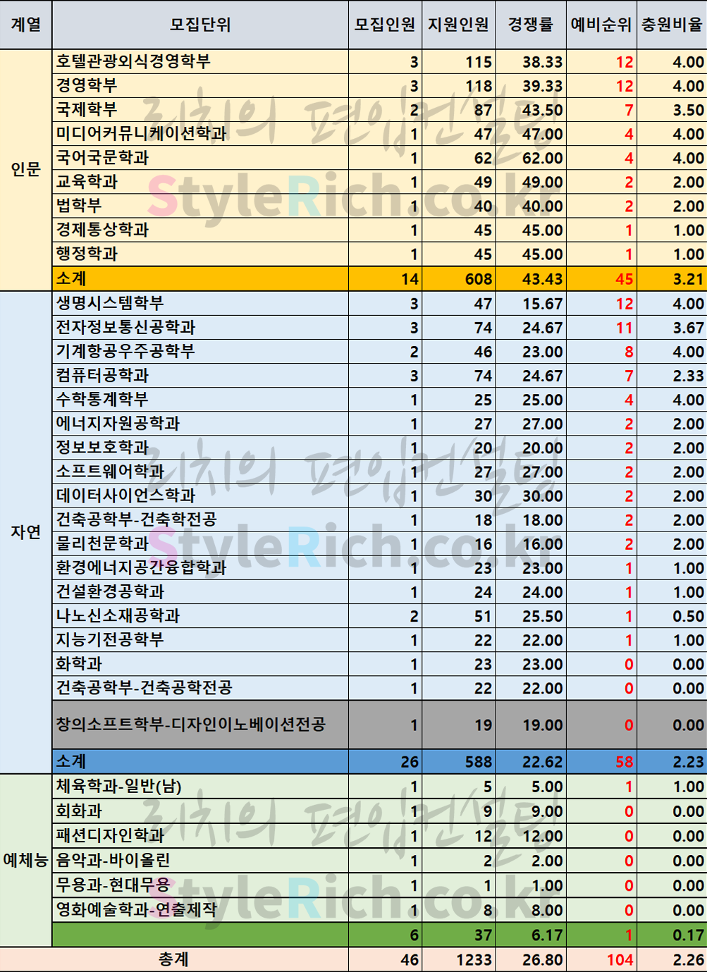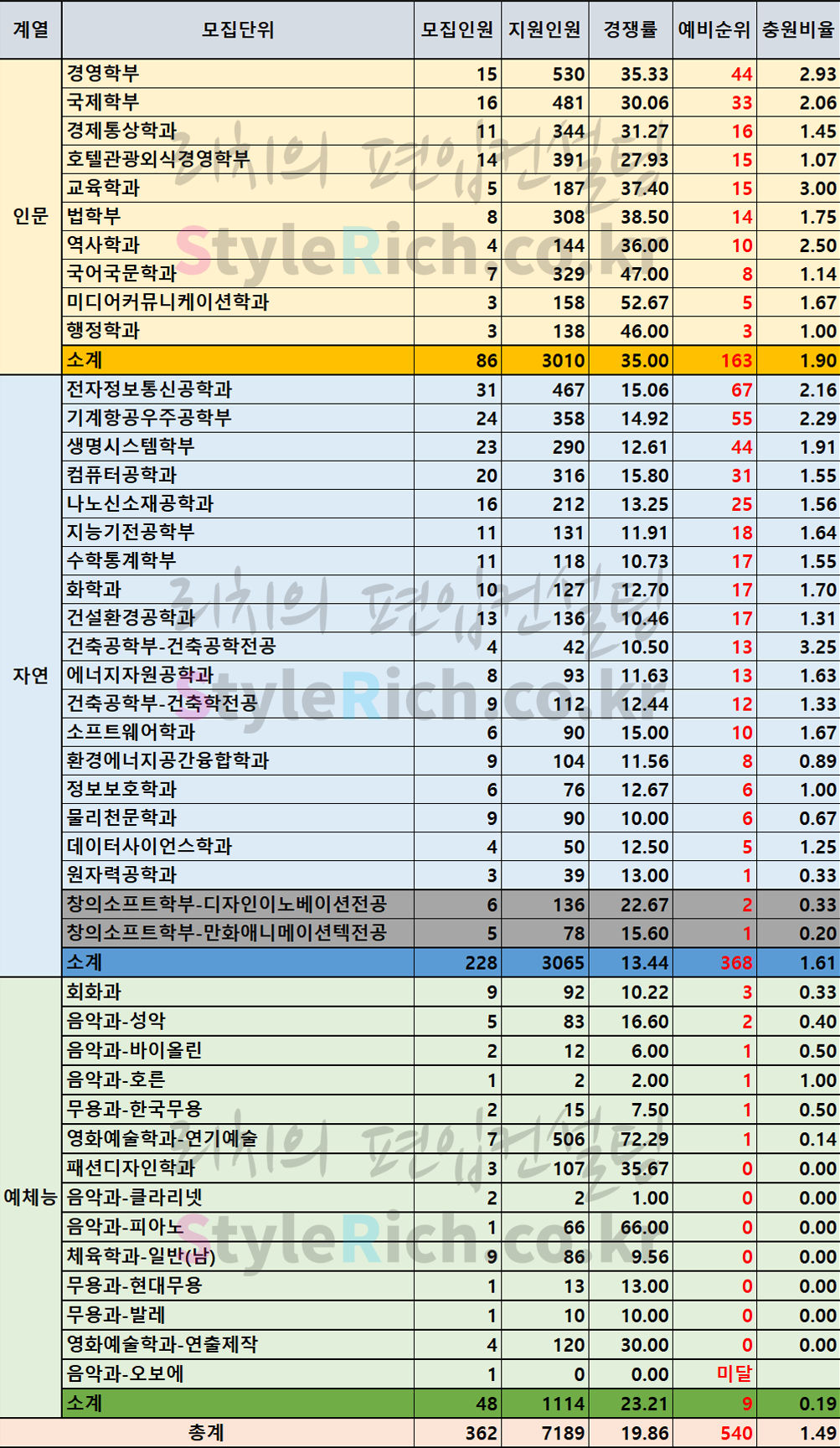 * 모집단위는 인문, 자연(창의소프트학부 별도 분류), 예체능으로 분류 후 추가합격에 많은 순으로 정렬