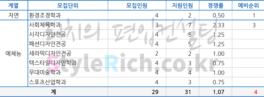 * 일반편입, 학사편입의 최대모집 가능인원의 경우 대학 홈페이지에서 공개한 모집요강과 경쟁률이 서로 다르며, 추가모집을 하면서 경쟁률 게재의 변화가 있었던 것으로 보임
