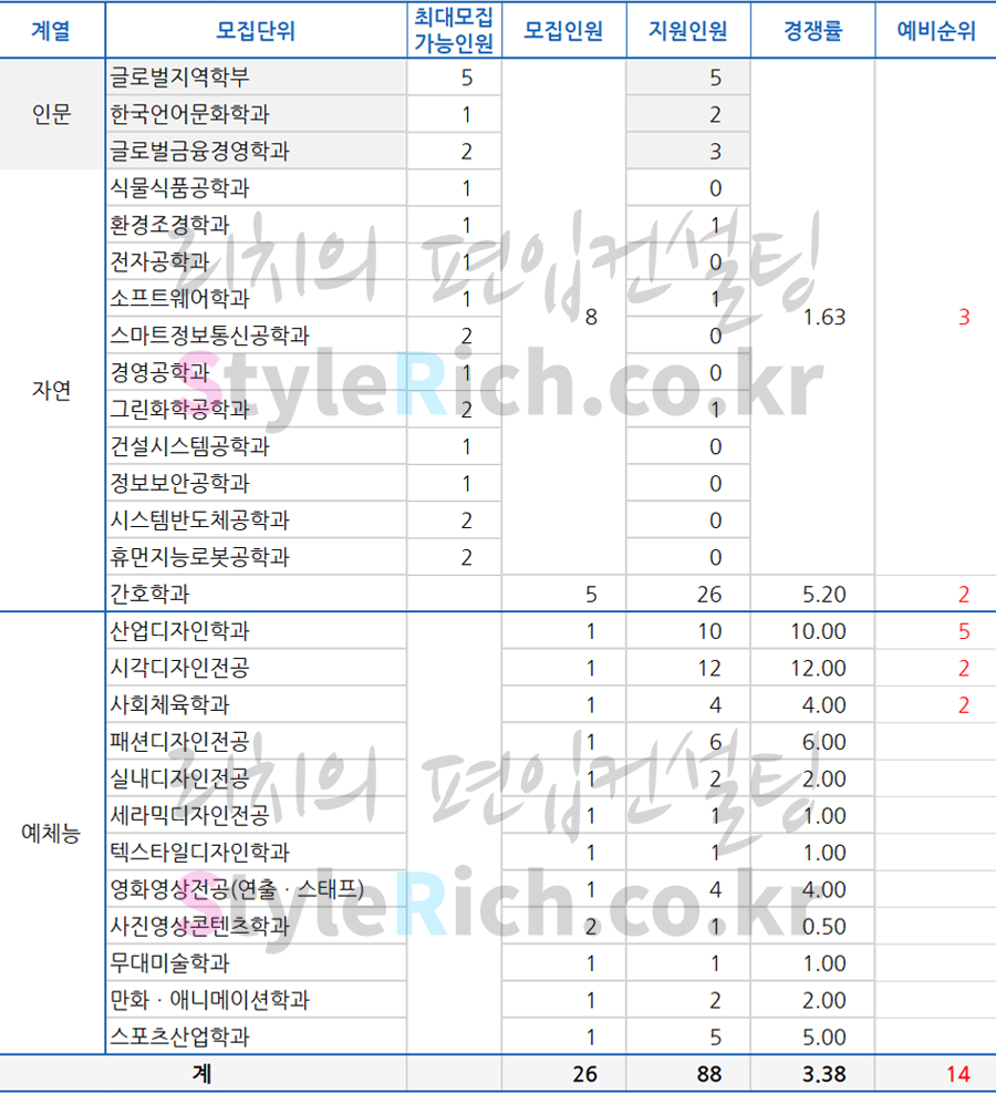* 모집단위는 인문, 자연, 예체능으로 분류 후 추가합격이 많은 순으로 정렬