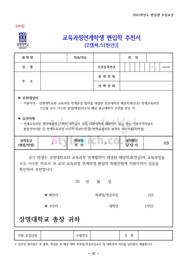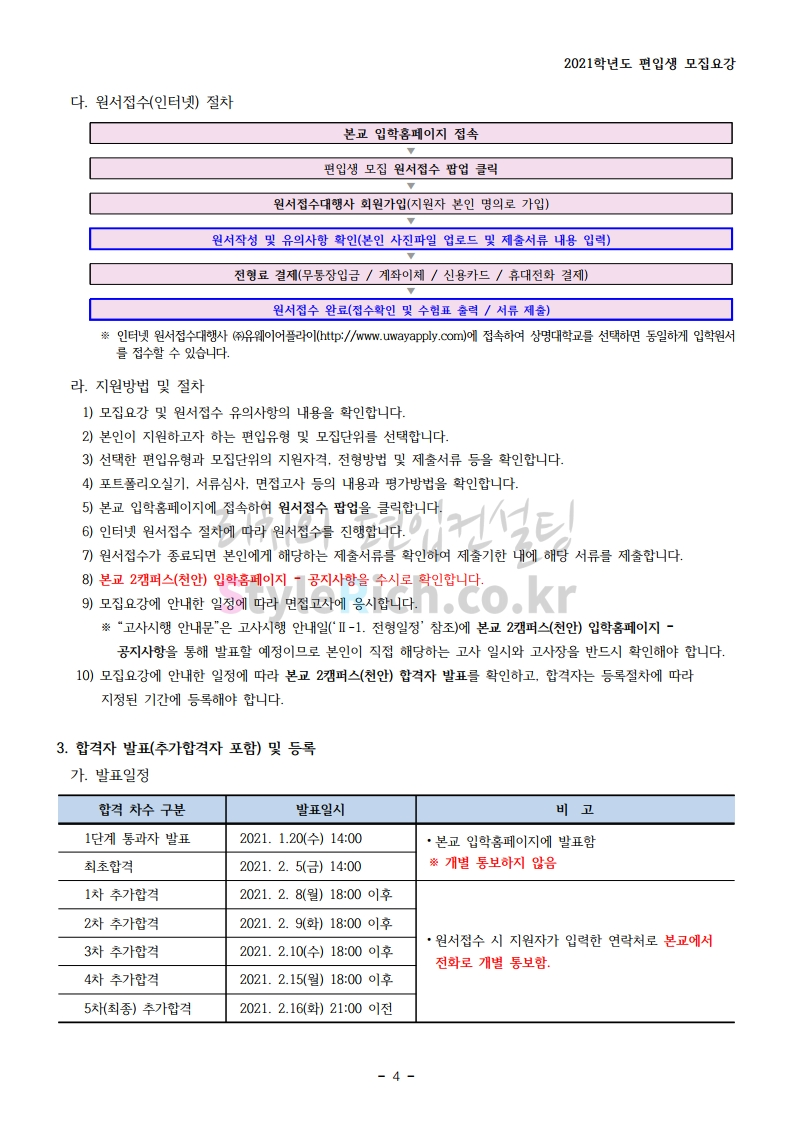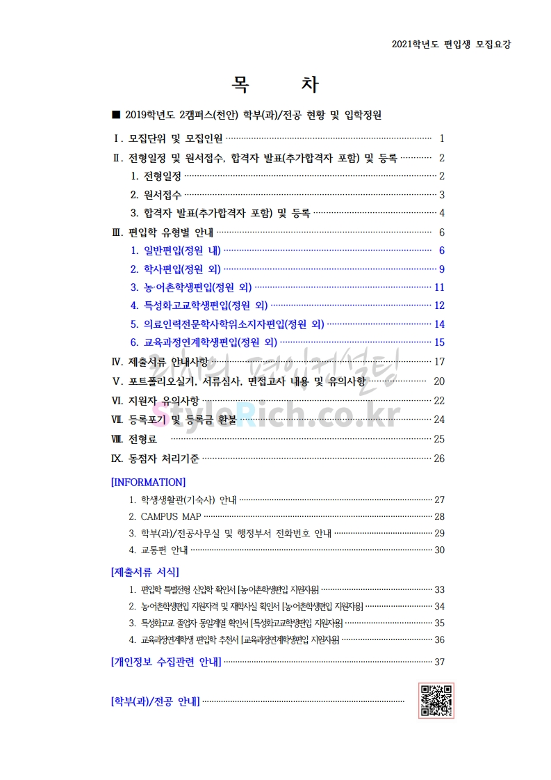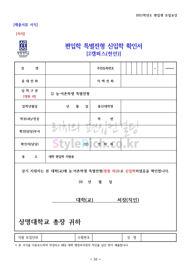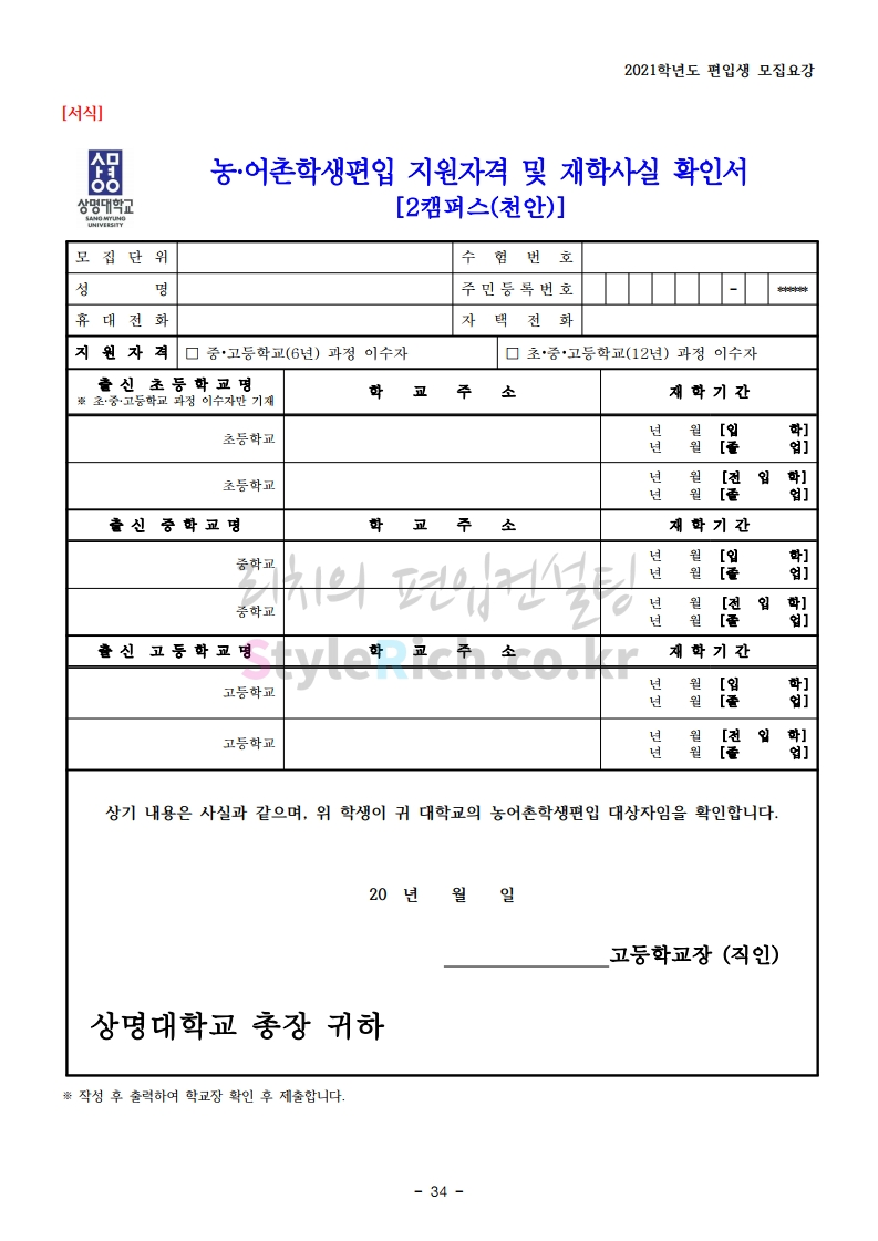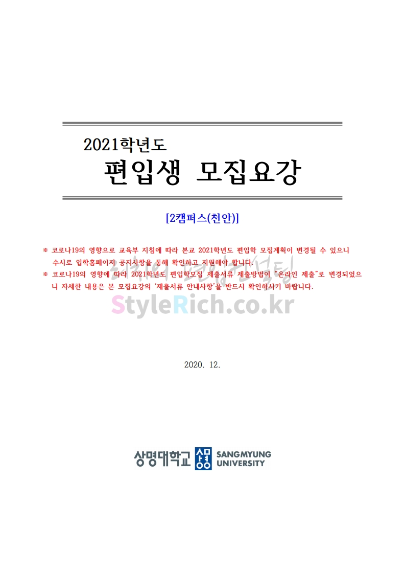상명대(천안) 편입 2021학년도 모집요강 간편하게 보자! 2020.12.16 00:29 편입 모집요강/2021학년도 모집요강 2021학년도 상명대(천안) 편입 모집요강(2020.12.10 기준)을 간편하게 확인하세요. PC나 모바일에서 이미지를 클릭(터치) 후 이미지의 좌우측을 클릭(터치)하면 모집요강의 순서를 앞뒤로 넘길 수 있습니다. 좌측 클릭(터치)는 이전 페이지, 우측 클릭(터치)는 다음 페이지입니다. * 최종 모집요강 발표 이후에도 내용의 일부가 변경될 수 있으니 지원 전 반드시 상명대(천안) 입학처의 모집요강을 확인 바랍니다. 2021학년도 상명대(천안) 편입 모집요강 다운받기 [요강]2021학년도 편입학 모집요강(홈페이지 공지용).pdf 0.87MB <출처: 상명대> [천안캠퍼스 투어영상] 공유하기 게시글 관리 리치의 편입컨설팅 저작자표시 비영리 변경금지 (새창열림) '편입 모집요강 > 2021학년도 모집요강' 카테고리의 다른 글 아주대 편입 2021학년도 모집요강 간편하게 보자! (0) 2020.12.16 상명대 편입 2021학년도 모집요강 간편하게 보자! (0) 2020.12.16 강남대 편입 2021학년도 모집요강 간편하게 보자! (0) 2020.12.11 세종대 편입 2021학년도 모집요강 간편하게 보자! (0) 2020.12.11 서강대 편입 2021학년도 모집요강 간편하게 보자! (0) 2020.12.10 댓글 공유하기 다른 글 댓글 이 글 공유하기 구독하기 구독하기 카카오톡 카카오톡 라인 라인 트위터 트위터 Facebook Facebook 카카오스토리 카카오스토리 밴드 밴드 네이버 블로그 네이버 블로그 Pocket Pocket Evernote Evernote 다른 글 아주대 편입 2021학년도 모집요강 간편하게 보자! 아주대 편입 2021학년도 모집요강 간편하게 보자! 2020.12.16 상명대 편입 2021학년도 모집요강 간편하게 보자! 상명대 편입 2021학년도 모집요강 간편하게 보자! 2020.12.16 강남대 편입 2021학년도 모집요강 간편하게 보자! 강남대 편입 2021학년도 모집요강 간편하게 보자! 2020.12.11 세종대 편입 2021학년도 모집요강 간편하게 보자! 세종대 편입 2021학년도 모집요강 간편하게 보자! 2020.12.11 다른 글 더 둘러보기