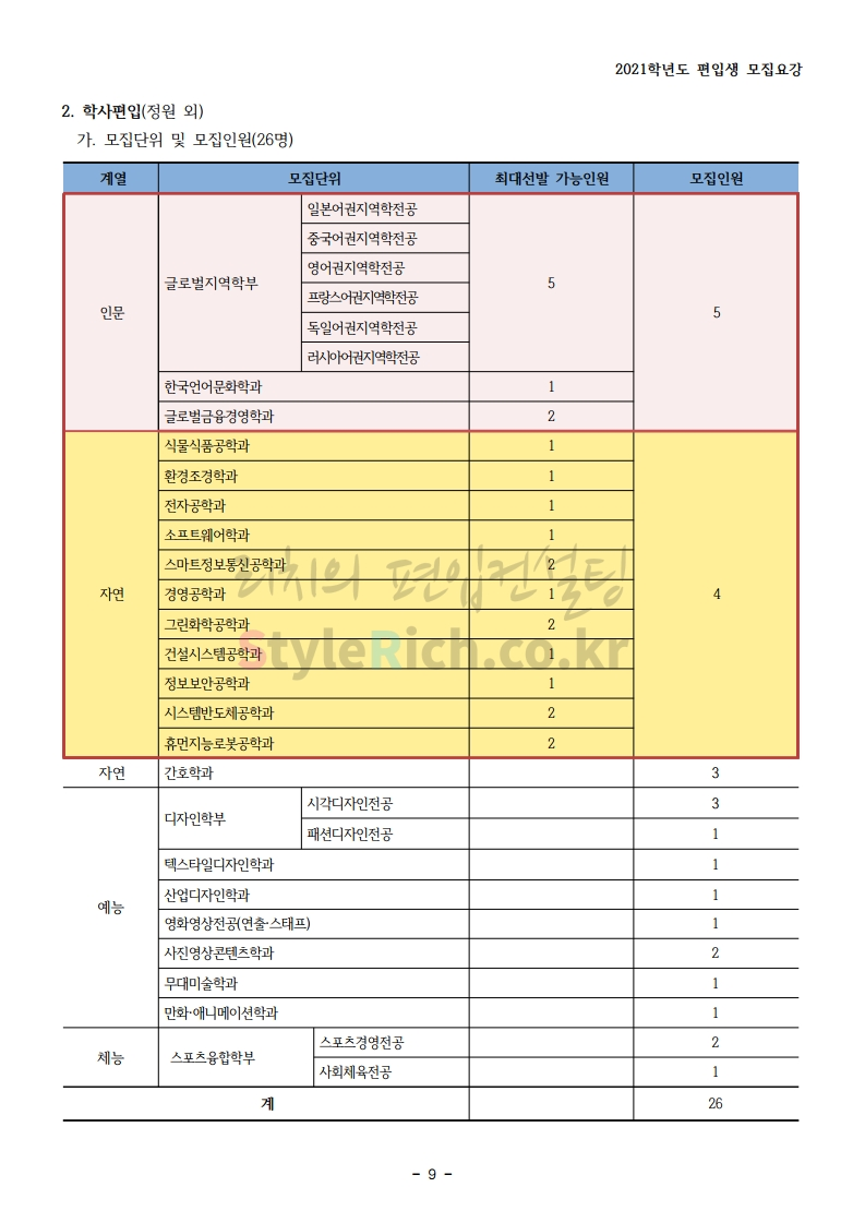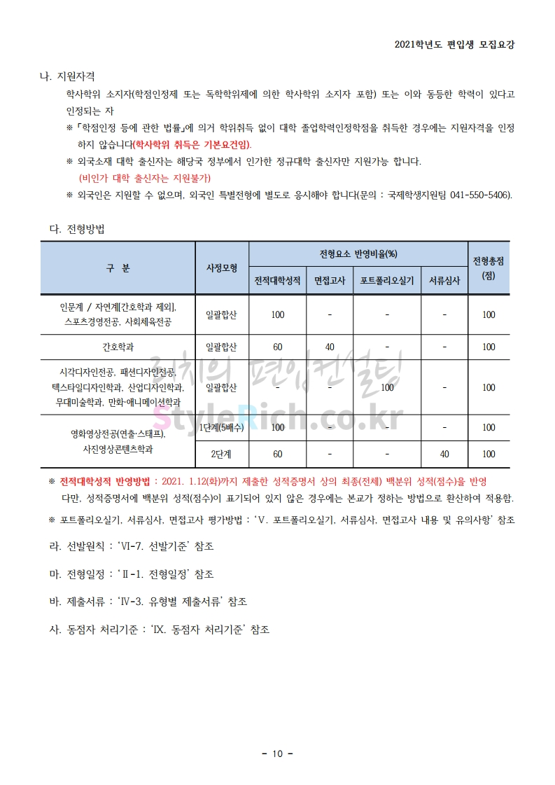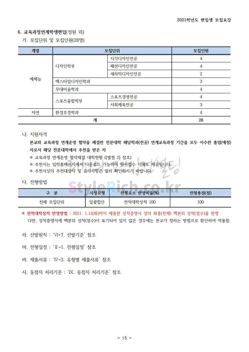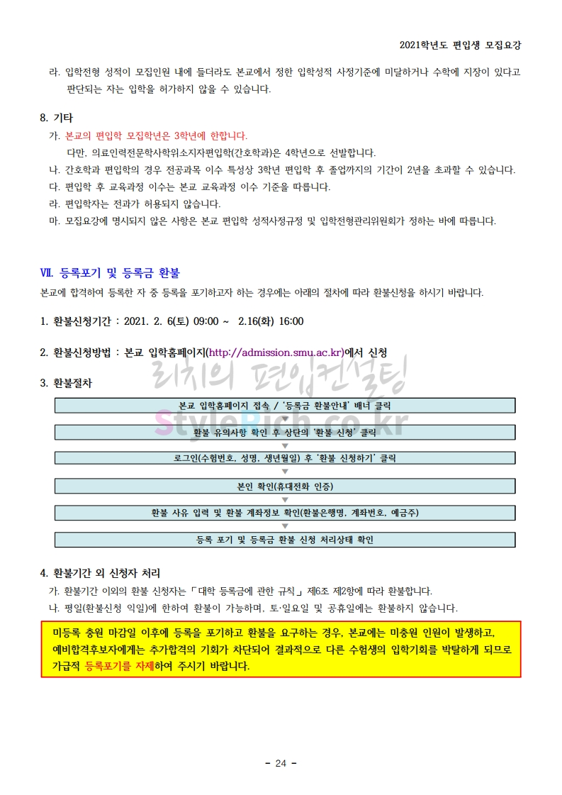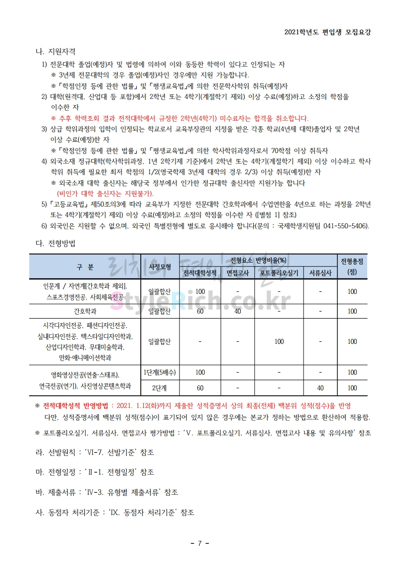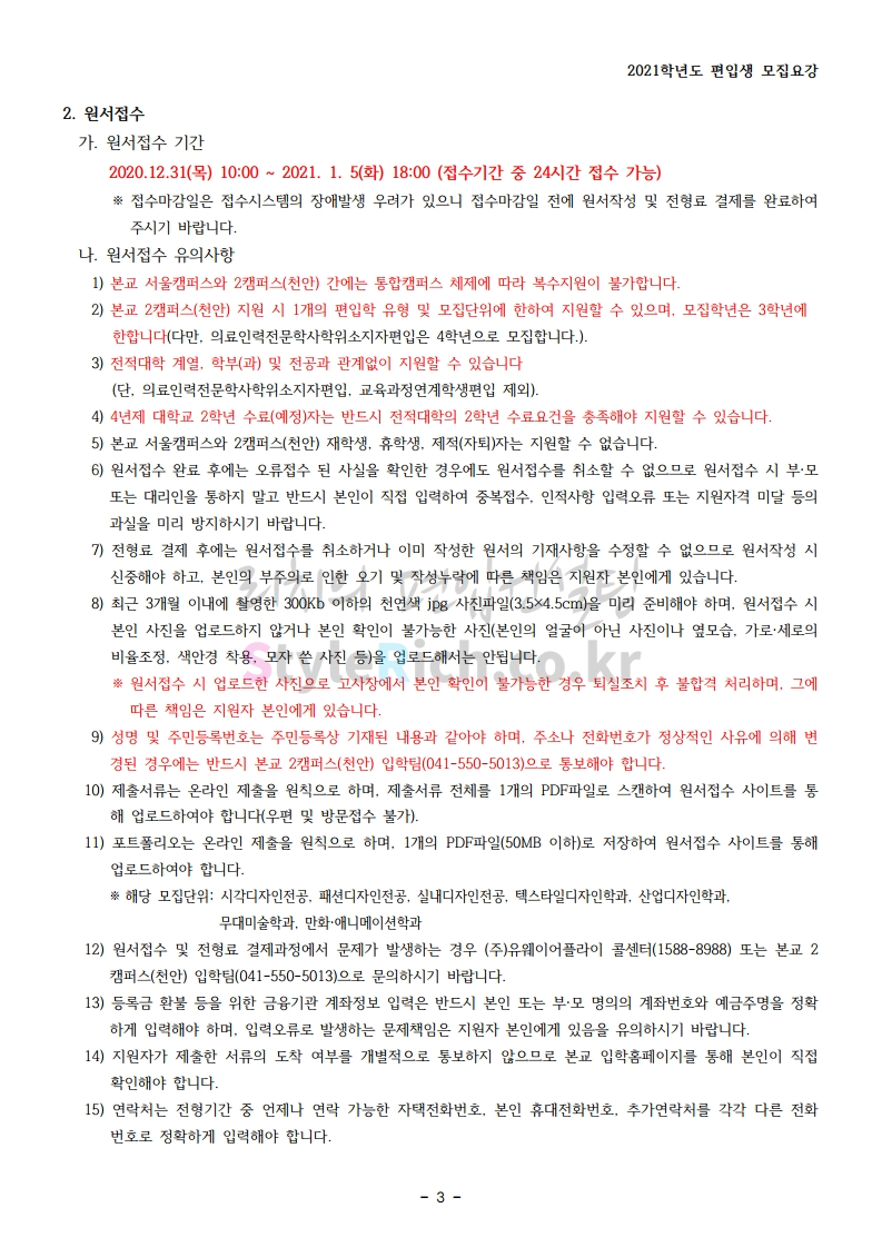 상명대(천안) 편입 2021학년도 모집요강 간편하게 보자! 2020.12.16 00:29 편입 모집요강/2021학년도 모집요강 2021학년도 상명대(천안) 편입 모집요강(2020.12.10 기준)을 간편하게 확인하세요. PC나 모바일에서 이미지를 클릭(터치) 후 이미지의 좌우측을 클릭(터치)하면 모집요강의 순서를 앞뒤로 넘길 수 있습니다. 좌측 클릭(터치)는 이전 페이지, 우측 클릭(터치)는 다음 페이지입니다. * 최종 모집요강 발표 이후에도 내용의 일부가 변경될 수 있으니 지원 전 반드시 상명대(천안) 입학처의 모집요강을 확인 바랍니다. 2021학년도 상명대(천안) 편입 모집요강 다운받기 [요강]2021학년도 편입학 모집요강(홈페이지 공지용).pdf 0.87MB <출처: 상명대> [천안캠퍼스 투어영상] 공유하기 게시글 관리 리치의 편입컨설팅 저작자표시 비영리 변경금지 (새창열림) '편입 모집요강 > 2021학년도 모집요강' 카테고리의 다른 글 아주대 편입 2021학년도 모집요강 간편하게 보자! (0) 2020.12.16 상명대 편입 2021학년도 모집요강 간편하게 보자! (0) 2020.12.16 강남대 편입 2021학년도 모집요강 간편하게 보자! (0) 2020.12.11 세종대 편입 2021학년도 모집요강 간편하게 보자! (0) 2020.12.11 서강대 편입 2021학년도 모집요강 간편하게 보자! (0) 2020.12.10 댓글 공유하기 다른 글 댓글 이 글 공유하기 구독하기 구독하기 카카오톡 카카오톡 라인 라인 트위터 트위터 Facebook Facebook 카카오스토리 카카오스토리 밴드 밴드 네이버 블로그 네이버 블로그 Pocket Pocket Evernote Evernote 다른 글 아주대 편입 2021학년도 모집요강 간편하게 보자! 아주대 편입 2021학년도 모집요강 간편하게 보자! 2020.12.16 상명대 편입 2021학년도 모집요강 간편하게 보자! 상명대 편입 2021학년도 모집요강 간편하게 보자! 2020.12.16 강남대 편입 2021학년도 모집요강 간편하게 보자! 강남대 편입 2021학년도 모집요강 간편하게 보자! 2020.12.11 세종대 편입 2021학년도 모집요강 간편하게 보자! 세종대 편입 2021학년도 모집요강 간편하게 보자! 2020.12.11 다른 글 더 둘러보기