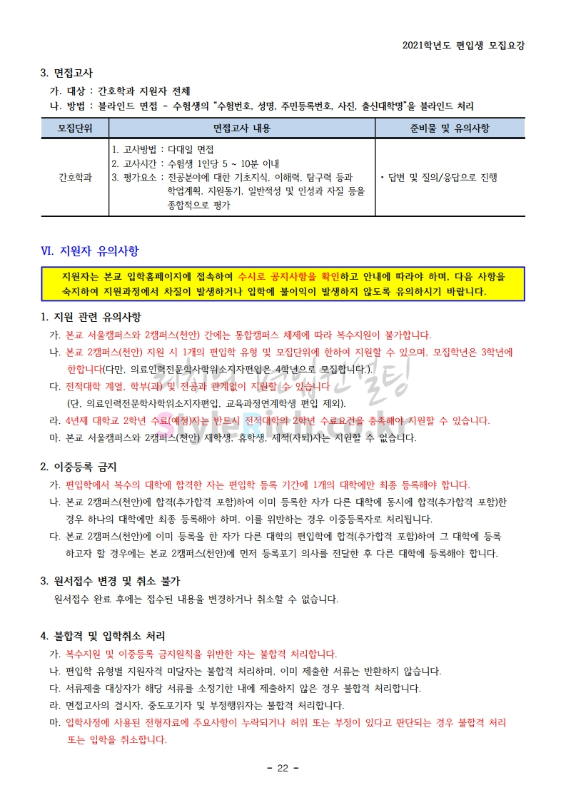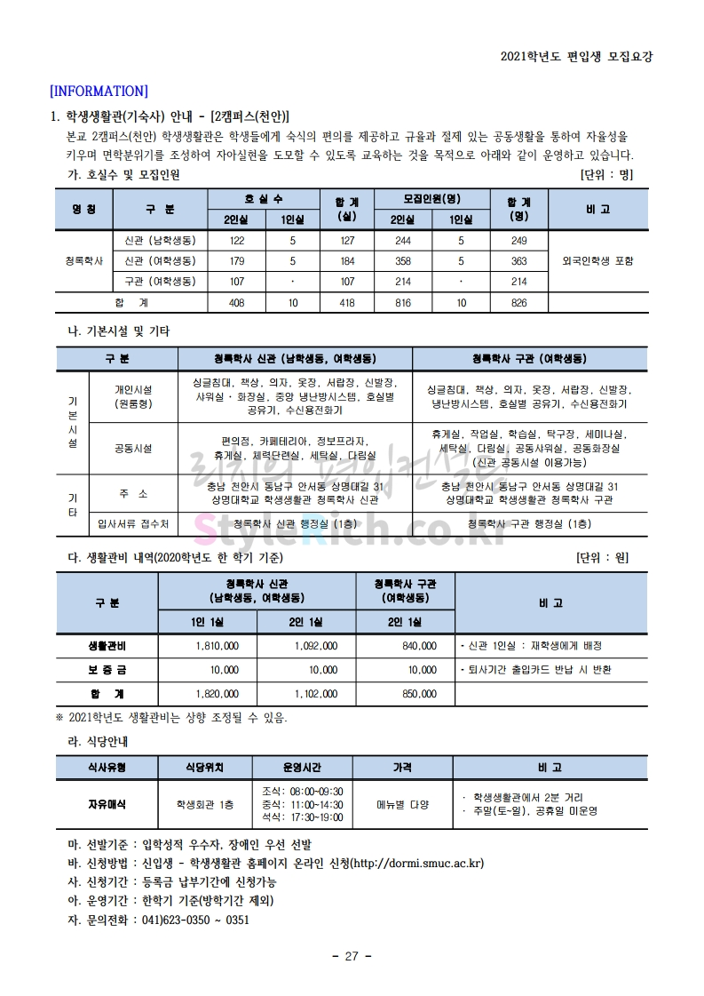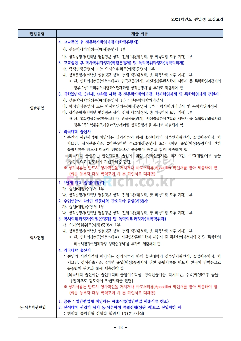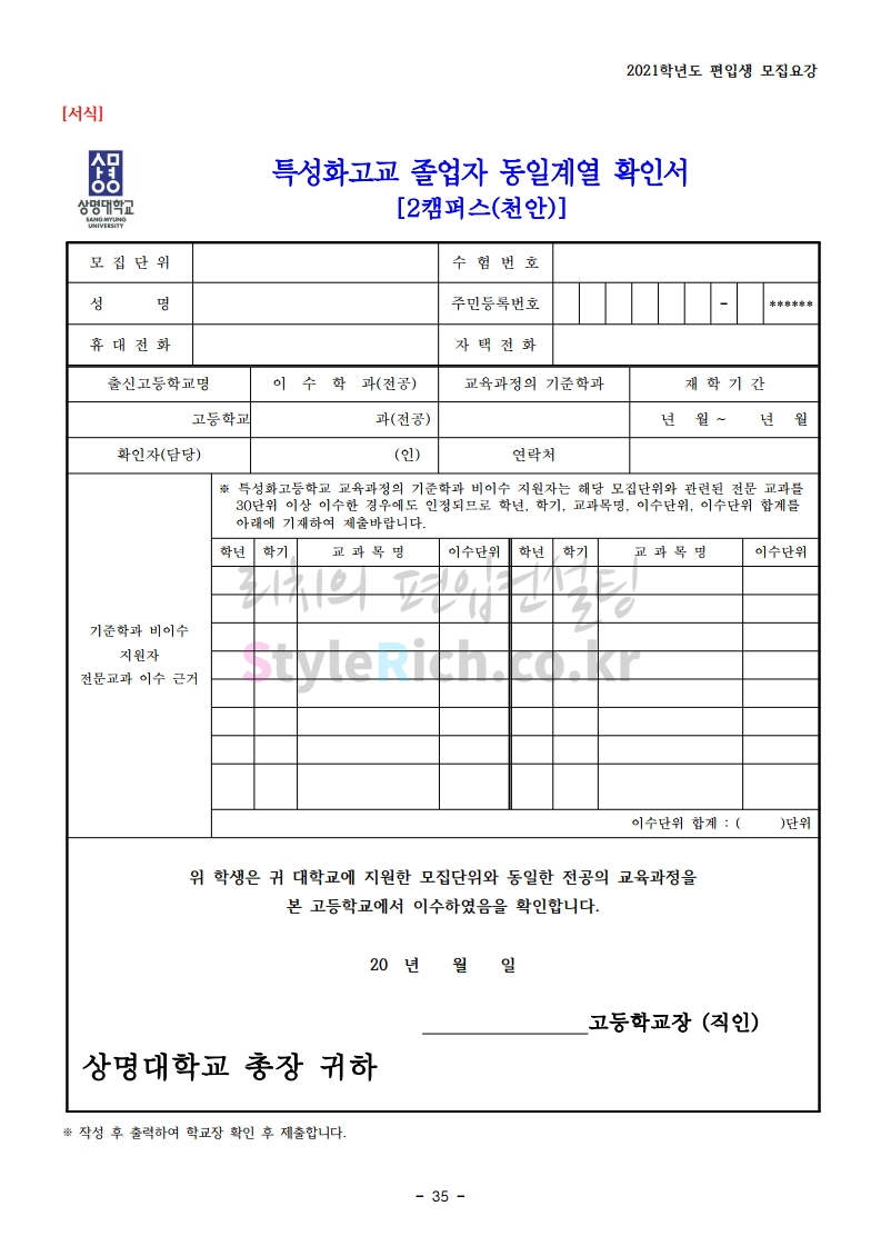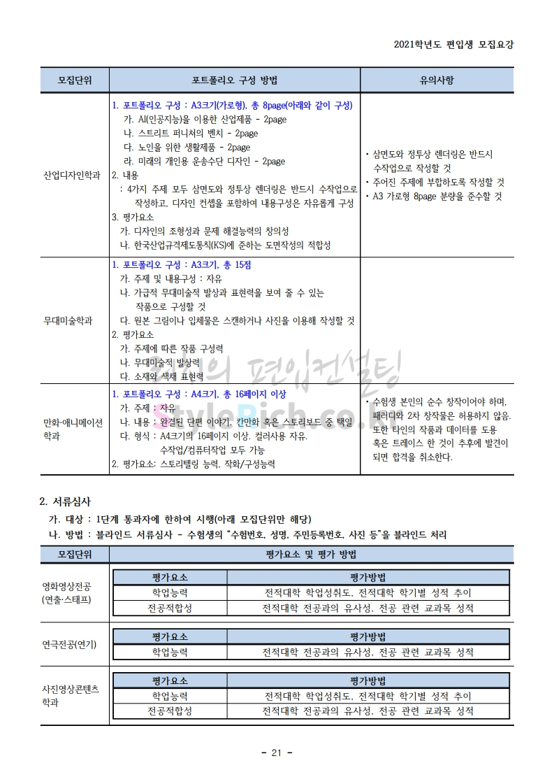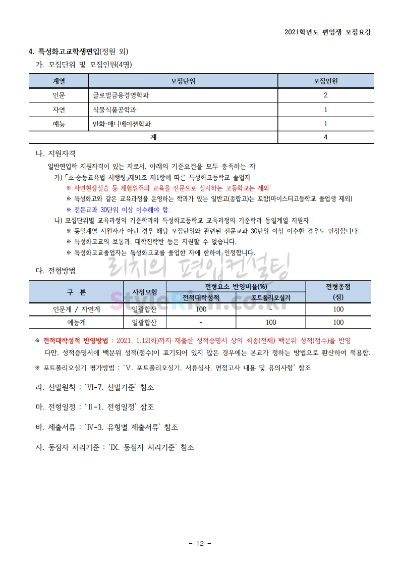 상명대(천안) 편입 2021학년도 모집요강 간편하게 보자! 2020.12.16 00:29 편입 모집요강/2021학년도 모집요강 2021학년도 상명대(천안) 편입 모집요강(2020.12.10 기준)을 간편하게 확인하세요. PC나 모바일에서 이미지를 클릭(터치) 후 이미지의 좌우측을 클릭(터치)하면 모집요강의 순서를 앞뒤로 넘길 수 있습니다. 좌측 클릭(터치)는 이전 페이지, 우측 클릭(터치)는 다음 페이지입니다. * 최종 모집요강 발표 이후에도 내용의 일부가 변경될 수 있으니 지원 전 반드시 상명대(천안) 입학처의 모집요강을 확인 바랍니다. 2021학년도 상명대(천안) 편입 모집요강 다운받기 [요강]2021학년도 편입학 모집요강(홈페이지 공지용).pdf 0.87MB <출처: 상명대> [천안캠퍼스 투어영상] 공유하기 게시글 관리 리치의 편입컨설팅 저작자표시 비영리 변경금지 (새창열림) '편입 모집요강 > 2021학년도 모집요강' 카테고리의 다른 글 아주대 편입 2021학년도 모집요강 간편하게 보자! (0) 2020.12.16 상명대 편입 2021학년도 모집요강 간편하게 보자! (0) 2020.12.16 강남대 편입 2021학년도 모집요강 간편하게 보자! (0) 2020.12.11 세종대 편입 2021학년도 모집요강 간편하게 보자! (0) 2020.12.11 서강대 편입 2021학년도 모집요강 간편하게 보자! (0) 2020.12.10 댓글 공유하기 다른 글 댓글 이 글 공유하기 구독하기 구독하기 카카오톡 카카오톡 라인 라인 트위터 트위터 Facebook Facebook 카카오스토리 카카오스토리 밴드 밴드 네이버 블로그 네이버 블로그 Pocket Pocket Evernote Evernote 다른 글 아주대 편입 2021학년도 모집요강 간편하게 보자! 아주대 편입 2021학년도 모집요강 간편하게 보자! 2020.12.16 상명대 편입 2021학년도 모집요강 간편하게 보자! 상명대 편입 2021학년도 모집요강 간편하게 보자! 2020.12.16 강남대 편입 2021학년도 모집요강 간편하게 보자! 강남대 편입 2021학년도 모집요강 간편하게 보자! 2020.12.11 세종대 편입 2021학년도 모집요강 간편하게 보자! 세종대 편입 2021학년도 모집요강 간편하게 보자! 2020.12.11 다른 글 더 둘러보기