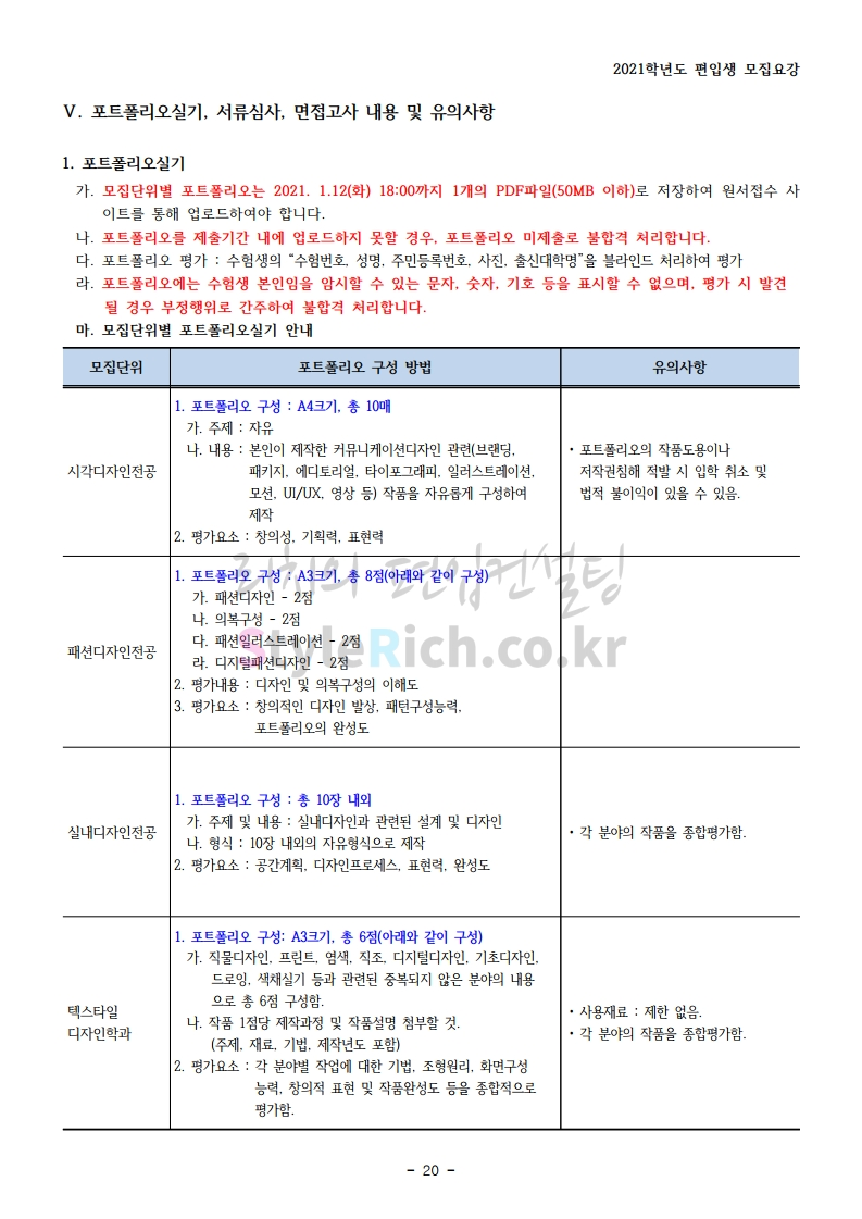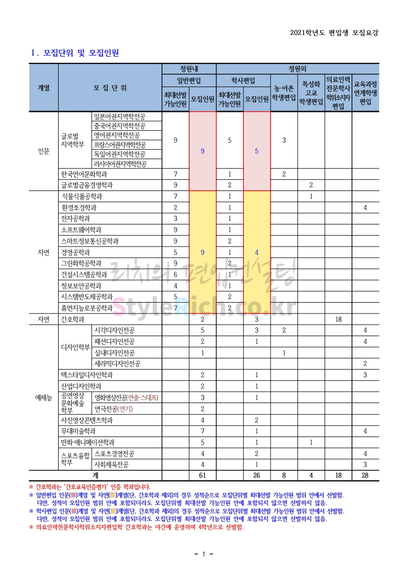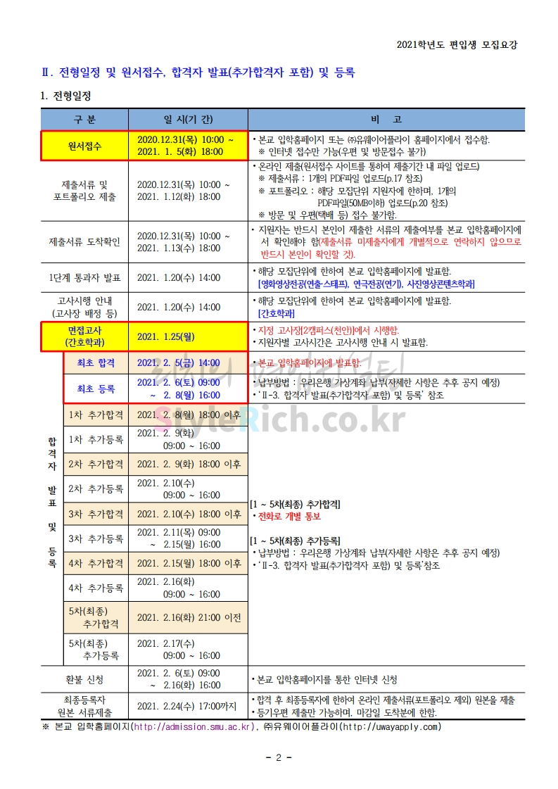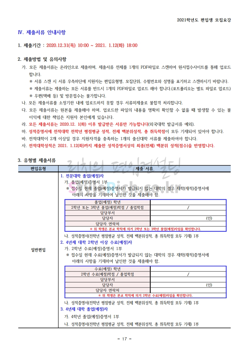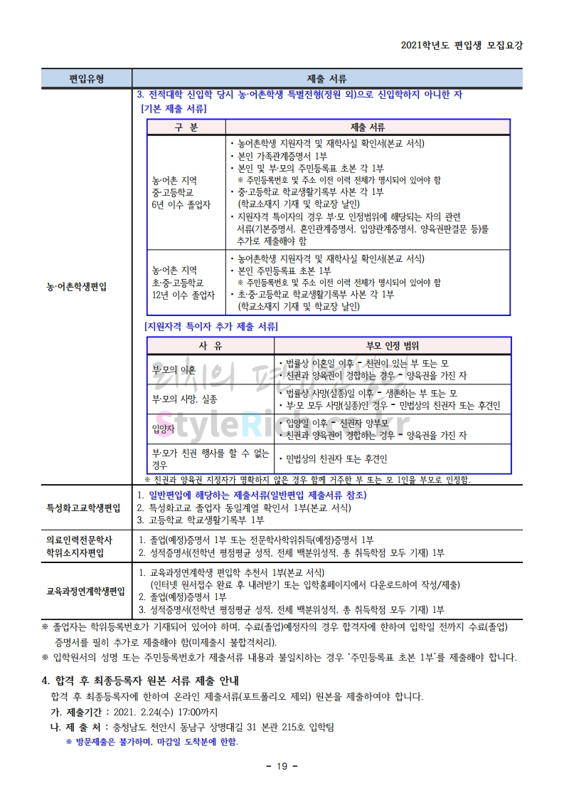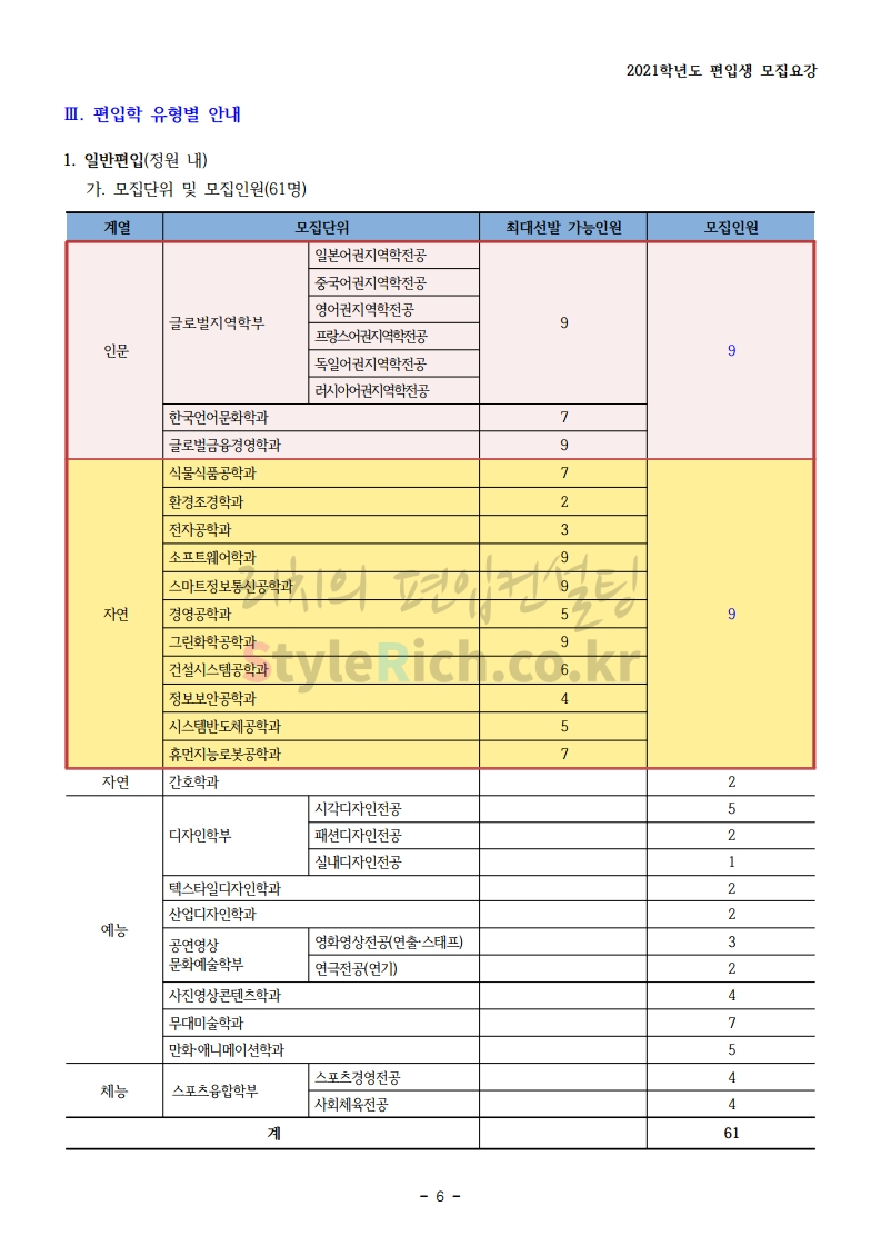 상명대(천안) 편입 2021학년도 모집요강 간편하게 보자! 2020.12.16 00:29 편입 모집요강/2021학년도 모집요강 2021학년도 상명대(천안) 편입 모집요강(2020.12.10 기준)을 간편하게 확인하세요. PC나 모바일에서 이미지를 클릭(터치) 후 이미지의 좌우측을 클릭(터치)하면 모집요강의 순서를 앞뒤로 넘길 수 있습니다. 좌측 클릭(터치)는 이전 페이지, 우측 클릭(터치)는 다음 페이지입니다. * 최종 모집요강 발표 이후에도 내용의 일부가 변경될 수 있으니 지원 전 반드시 상명대(천안) 입학처의 모집요강을 확인 바랍니다. 2021학년도 상명대(천안) 편입 모집요강 다운받기 [요강]2021학년도 편입학 모집요강(홈페이지 공지용).pdf 0.87MB <출처: 상명대> [천안캠퍼스 투어영상] 공유하기 게시글 관리 리치의 편입컨설팅 저작자표시 비영리 변경금지 (새창열림) '편입 모집요강 > 2021학년도 모집요강' 카테고리의 다른 글 아주대 편입 2021학년도 모집요강 간편하게 보자! (0) 2020.12.16 상명대 편입 2021학년도 모집요강 간편하게 보자! (0) 2020.12.16 강남대 편입 2021학년도 모집요강 간편하게 보자! (0) 2020.12.11 세종대 편입 2021학년도 모집요강 간편하게 보자! (0) 2020.12.11 서강대 편입 2021학년도 모집요강 간편하게 보자! (0) 2020.12.10 댓글 공유하기 다른 글 댓글 이 글 공유하기 구독하기 구독하기 카카오톡 카카오톡 라인 라인 트위터 트위터 Facebook Facebook 카카오스토리 카카오스토리 밴드 밴드 네이버 블로그 네이버 블로그 Pocket Pocket Evernote Evernote 다른 글 아주대 편입 2021학년도 모집요강 간편하게 보자! 아주대 편입 2021학년도 모집요강 간편하게 보자! 2020.12.16 상명대 편입 2021학년도 모집요강 간편하게 보자! 상명대 편입 2021학년도 모집요강 간편하게 보자! 2020.12.16 강남대 편입 2021학년도 모집요강 간편하게 보자! 강남대 편입 2021학년도 모집요강 간편하게 보자! 2020.12.11 세종대 편입 2021학년도 모집요강 간편하게 보자! 세종대 편입 2021학년도 모집요강 간편하게 보자! 2020.12.11 다른 글 더 둘러보기