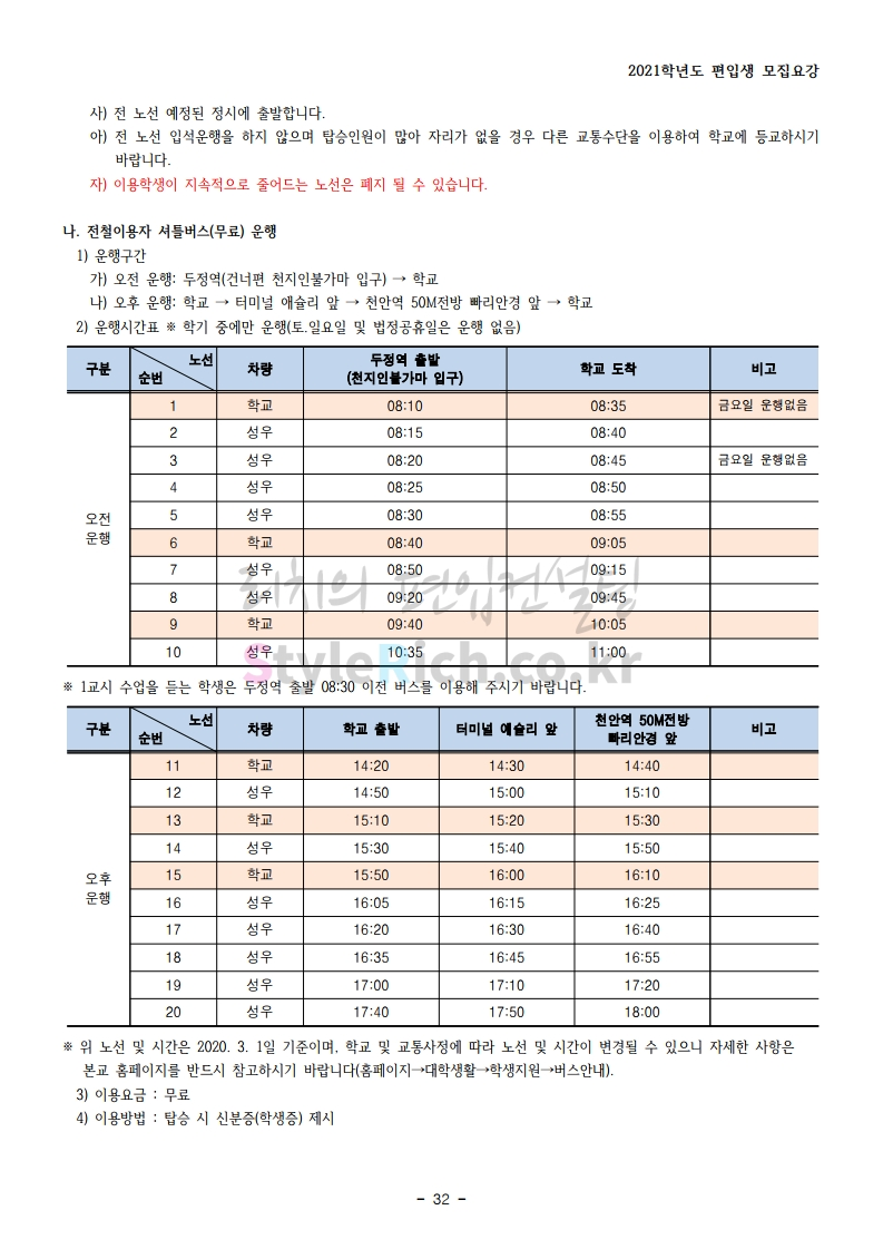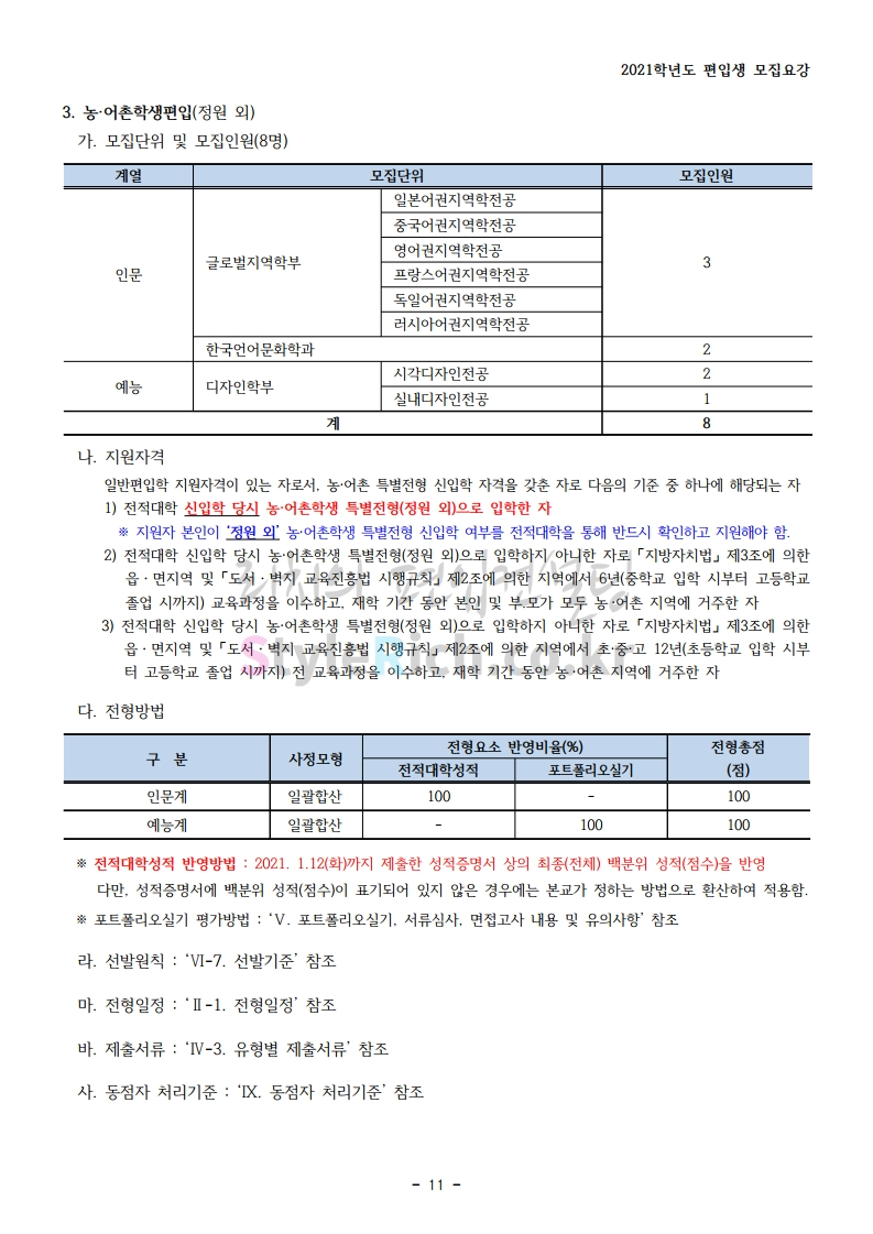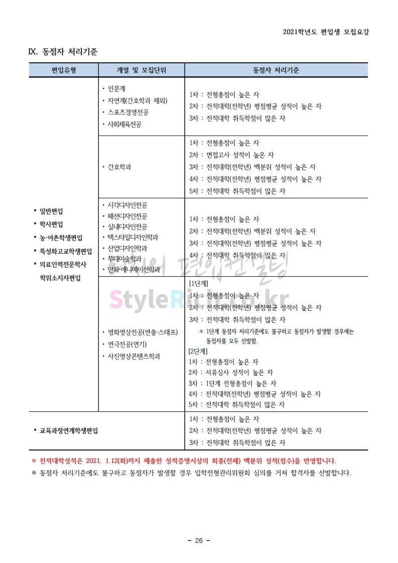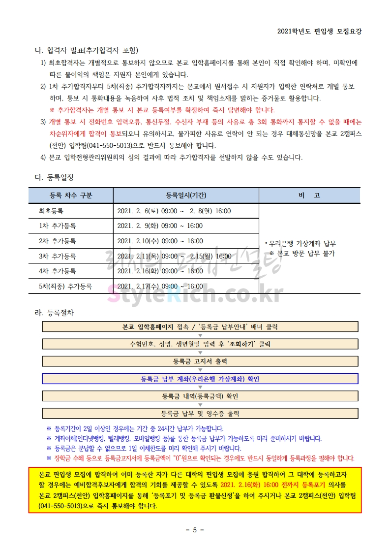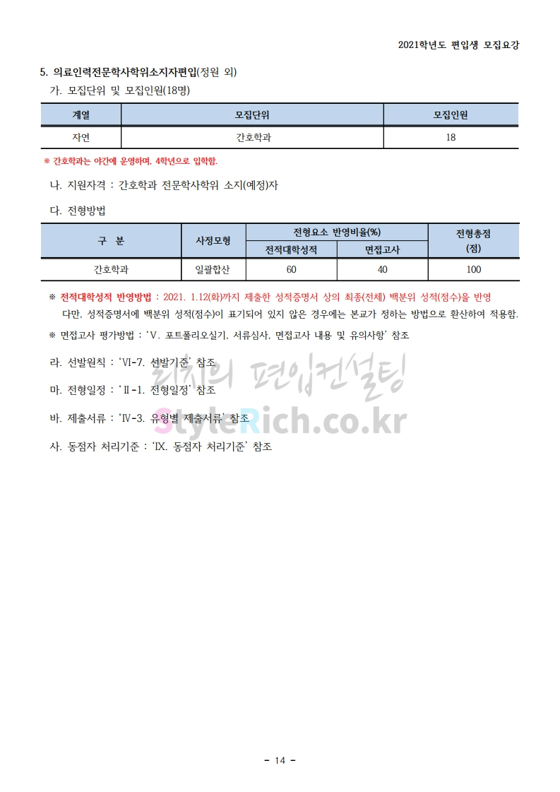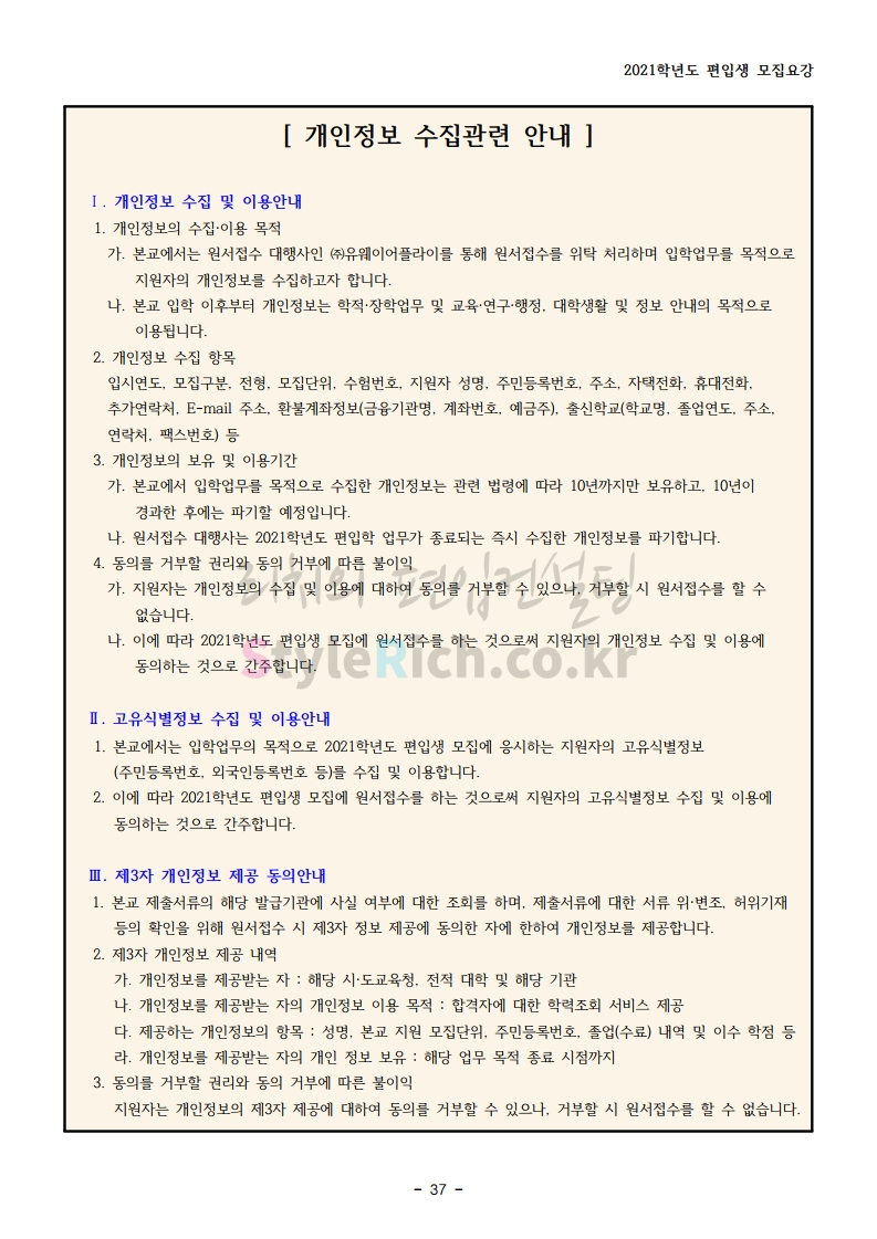 상명대(천안) 편입 2021학년도 모집요강 간편하게 보자! 2020.12.16 00:29 편입 모집요강/2021학년도 모집요강 2021학년도 상명대(천안) 편입 모집요강(2020.12.10 기준)을 간편하게 확인하세요. PC나 모바일에서 이미지를 클릭(터치) 후 이미지의 좌우측을 클릭(터치)하면 모집요강의 순서를 앞뒤로 넘길 수 있습니다. 좌측 클릭(터치)는 이전 페이지, 우측 클릭(터치)는 다음 페이지입니다. * 최종 모집요강 발표 이후에도 내용의 일부가 변경될 수 있으니 지원 전 반드시 상명대(천안) 입학처의 모집요강을 확인 바랍니다. 2021학년도 상명대(천안) 편입 모집요강 다운받기 [요강]2021학년도 편입학 모집요강(홈페이지 공지용).pdf 0.87MB <출처: 상명대> [천안캠퍼스 투어영상] 공유하기 게시글 관리 리치의 편입컨설팅 저작자표시 비영리 변경금지 (새창열림) '편입 모집요강 > 2021학년도 모집요강' 카테고리의 다른 글 아주대 편입 2021학년도 모집요강 간편하게 보자! (0) 2020.12.16 상명대 편입 2021학년도 모집요강 간편하게 보자! (0) 2020.12.16 강남대 편입 2021학년도 모집요강 간편하게 보자! (0) 2020.12.11 세종대 편입 2021학년도 모집요강 간편하게 보자! (0) 2020.12.11 서강대 편입 2021학년도 모집요강 간편하게 보자! (0) 2020.12.10 댓글 공유하기 다른 글 댓글 이 글 공유하기 구독하기 구독하기 카카오톡 카카오톡 라인 라인 트위터 트위터 Facebook Facebook 카카오스토리 카카오스토리 밴드 밴드 네이버 블로그 네이버 블로그 Pocket Pocket Evernote Evernote 다른 글 아주대 편입 2021학년도 모집요강 간편하게 보자! 아주대 편입 2021학년도 모집요강 간편하게 보자! 2020.12.16 상명대 편입 2021학년도 모집요강 간편하게 보자! 상명대 편입 2021학년도 모집요강 간편하게 보자! 2020.12.16 강남대 편입 2021학년도 모집요강 간편하게 보자! 강남대 편입 2021학년도 모집요강 간편하게 보자! 2020.12.11 세종대 편입 2021학년도 모집요강 간편하게 보자! 세종대 편입 2021학년도 모집요강 간편하게 보자! 2020.12.11 다른 글 더 둘러보기