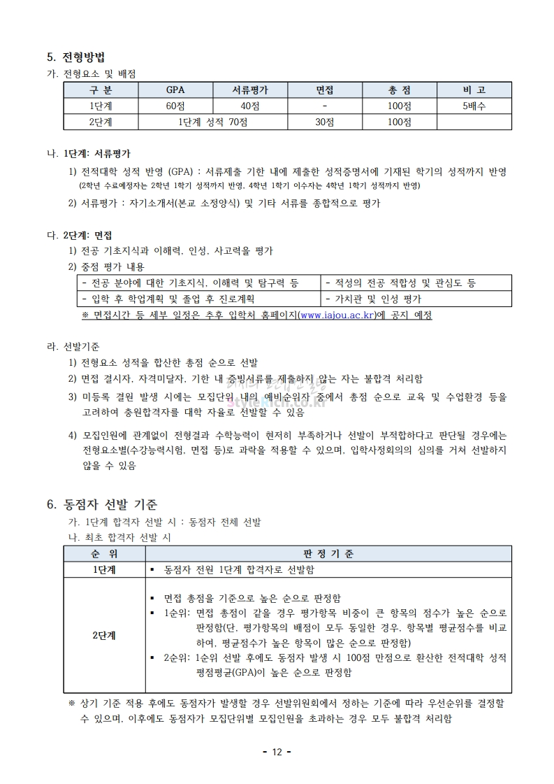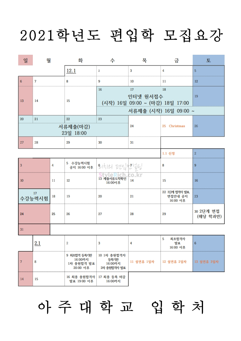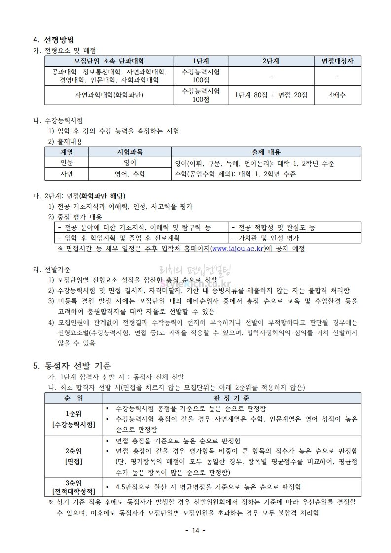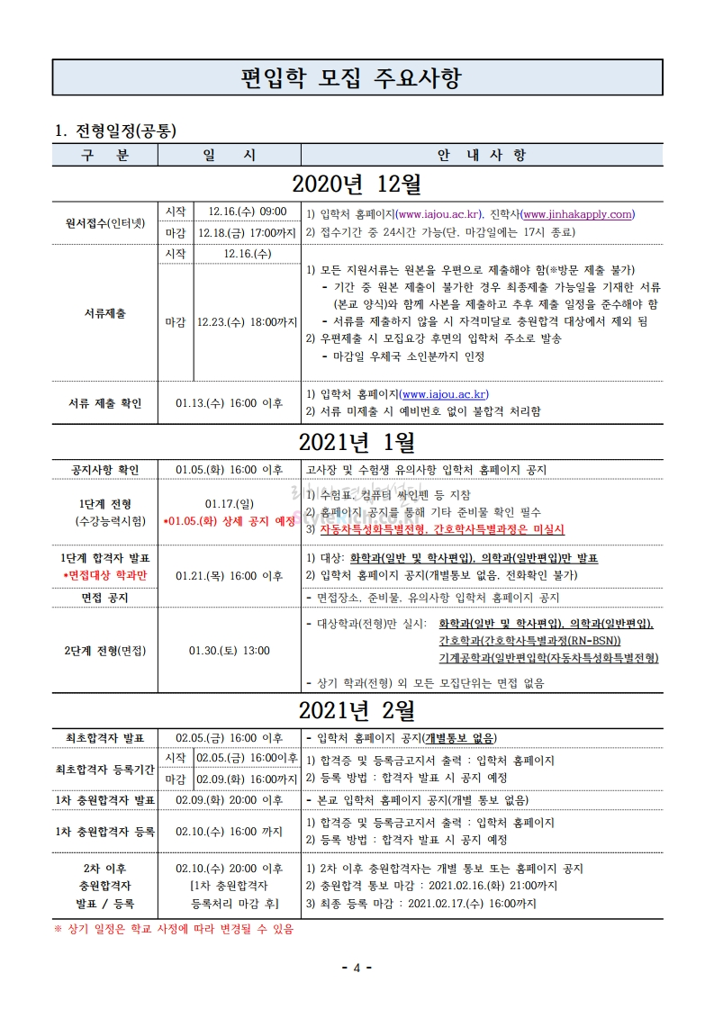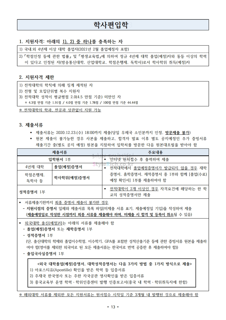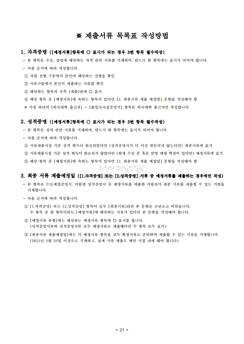 아주대 편입 2021학년도 모집요강 간편하게 보자! 2020.12.16 02:31 편입 모집요강/2021학년도 모집요강 2021학년도 아주대 편입 모집요강(2020.12.10 기준)을 간편하게 확인하세요. PC나 모바일에서 이미지를 클릭(터치) 후 이미지의 좌우측을 클릭(터치)하면 모집요강의 순서를 앞뒤로 넘길 수 있습니다. 좌측 클릭(터치)는 이전 페이지, 우측 클릭(터치)는 다음 페이지입니다. * 최종 모집요강 발표 이후에도 내용의 일부가 변경될 수 있으니 지원 전 반드시 아주대 입학처의 모집요강을 확인바랍니다. 2021학년도 아주대 편입 모집요강 다운받기 2021학년도_편입학_모집요강.pdf 0.66MB <출처: 아주대> 2020 아주대 캠퍼스가 '스마트'해집니다-! 공유하기 게시글 관리 리치의 편입컨설팅 저작자표시 비영리 변경금지 (새창열림) '편입 모집요강 > 2021학년도 모집요강' 카테고리의 다른 글 한양대 편입 2021학년도 모집요강 간편하게 보자! (0) 2020.12.16 홍익대 편입 2021학년도 모집요강 간편하게 보자! (0) 2020.12.16 상명대 편입 2021학년도 모집요강 간편하게 보자! (0) 2020.12.16 상명대(천안) 편입 2021학년도 모집요강 간편하게 보자! (0) 2020.12.16 강남대 편입 2021학년도 모집요강 간편하게 보자! (0) 2020.12.11 댓글 공유하기 다른 글 댓글 이 글 공유하기 구독하기 구독하기 카카오톡 카카오톡 라인 라인 트위터 트위터 Facebook Facebook 카카오스토리 카카오스토리 밴드 밴드 네이버 블로그 네이버 블로그 Pocket Pocket Evernote Evernote 다른 글 한양대 편입 2021학년도 모집요강 간편하게 보자! 한양대 편입 2021학년도 모집요강 간편하게 보자! 2020.12.16 홍익대 편입 2021학년도 모집요강 간편하게 보자! 홍익대 편입 2021학년도 모집요강 간편하게 보자! 2020.12.16 상명대 편입 2021학년도 모집요강 간편하게 보자! 상명대 편입 2021학년도 모집요강 간편하게 보자! 2020.12.16 상명대(천안) 편입 2021학년도 모집요강 간편하게 보자! 상명대(천안) 편입 2021학년도 모집요강 간편하게 보자! 2020.12.16 다른 글 더 둘러보기