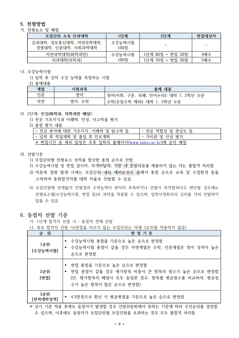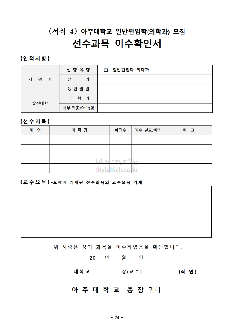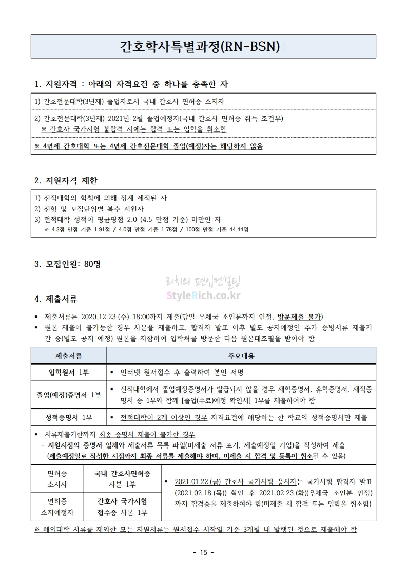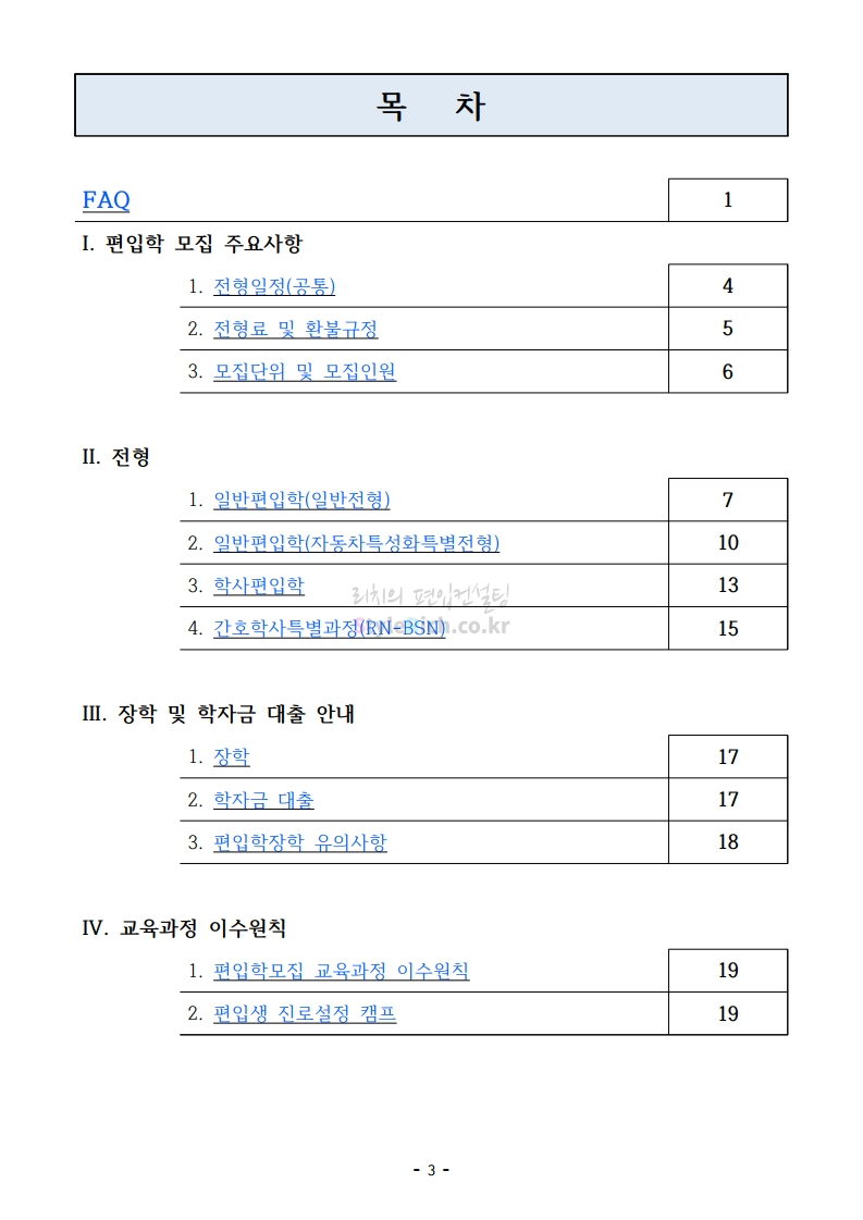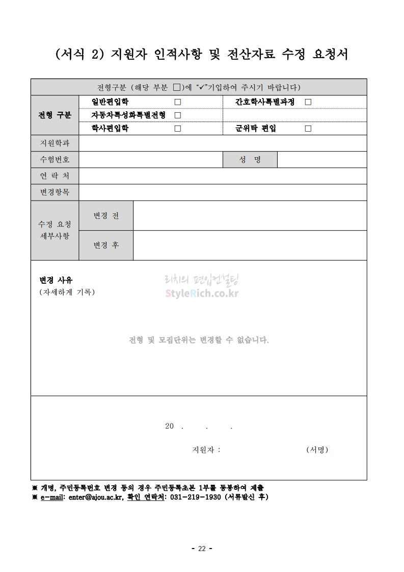 아주대 편입 2021학년도 모집요강 간편하게 보자! 2020.12.16 02:31 편입 모집요강/2021학년도 모집요강 2021학년도 아주대 편입 모집요강(2020.12.10 기준)을 간편하게 확인하세요. PC나 모바일에서 이미지를 클릭(터치) 후 이미지의 좌우측을 클릭(터치)하면 모집요강의 순서를 앞뒤로 넘길 수 있습니다. 좌측 클릭(터치)는 이전 페이지, 우측 클릭(터치)는 다음 페이지입니다. * 최종 모집요강 발표 이후에도 내용의 일부가 변경될 수 있으니 지원 전 반드시 아주대 입학처의 모집요강을 확인바랍니다. 2021학년도 아주대 편입 모집요강 다운받기 2021학년도_편입학_모집요강.pdf 0.66MB <출처: 아주대> 2020 아주대 캠퍼스가 '스마트'해집니다-! 공유하기 게시글 관리 리치의 편입컨설팅 저작자표시 비영리 변경금지 (새창열림) '편입 모집요강 > 2021학년도 모집요강' 카테고리의 다른 글 한양대 편입 2021학년도 모집요강 간편하게 보자! (0) 2020.12.16 홍익대 편입 2021학년도 모집요강 간편하게 보자! (0) 2020.12.16 상명대 편입 2021학년도 모집요강 간편하게 보자! (0) 2020.12.16 상명대(천안) 편입 2021학년도 모집요강 간편하게 보자! (0) 2020.12.16 강남대 편입 2021학년도 모집요강 간편하게 보자! (0) 2020.12.11 댓글 공유하기 다른 글 댓글 이 글 공유하기 구독하기 구독하기 카카오톡 카카오톡 라인 라인 트위터 트위터 Facebook Facebook 카카오스토리 카카오스토리 밴드 밴드 네이버 블로그 네이버 블로그 Pocket Pocket Evernote Evernote 다른 글 한양대 편입 2021학년도 모집요강 간편하게 보자! 한양대 편입 2021학년도 모집요강 간편하게 보자! 2020.12.16 홍익대 편입 2021학년도 모집요강 간편하게 보자! 홍익대 편입 2021학년도 모집요강 간편하게 보자! 2020.12.16 상명대 편입 2021학년도 모집요강 간편하게 보자! 상명대 편입 2021학년도 모집요강 간편하게 보자! 2020.12.16 상명대(천안) 편입 2021학년도 모집요강 간편하게 보자! 상명대(천안) 편입 2021학년도 모집요강 간편하게 보자! 2020.12.16 다른 글 더 둘러보기
