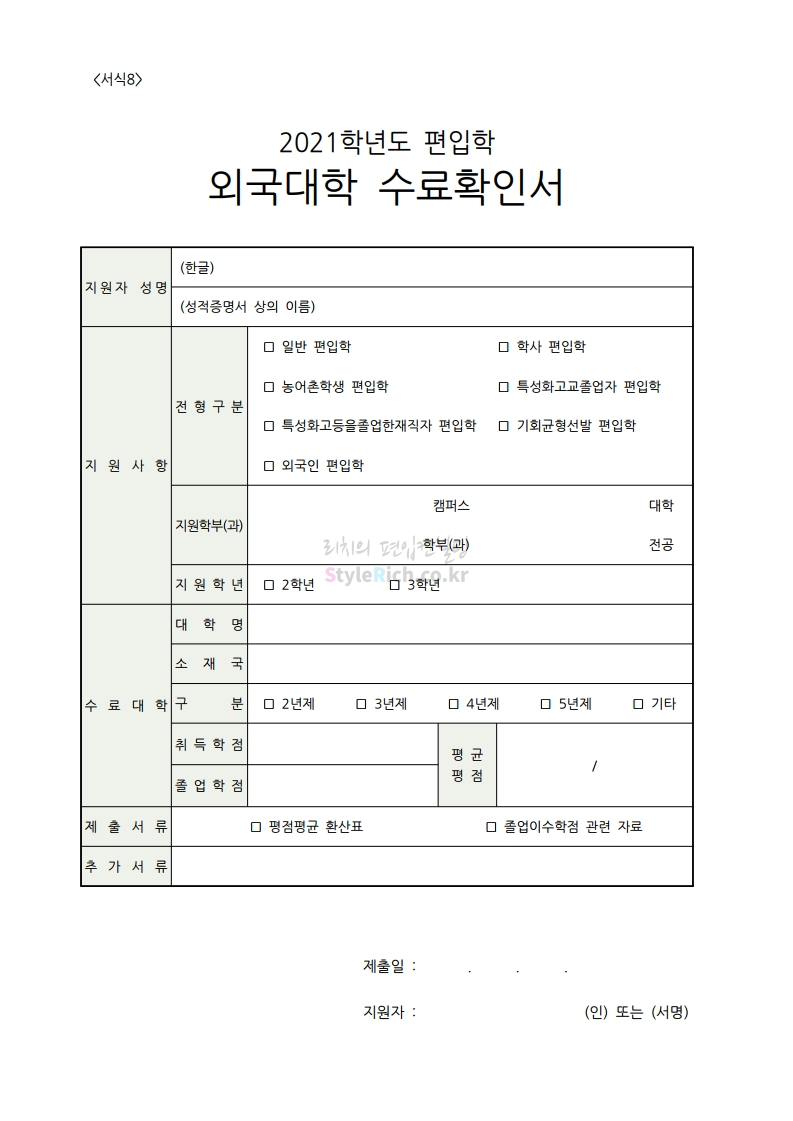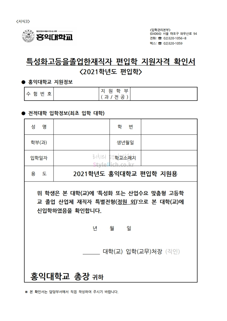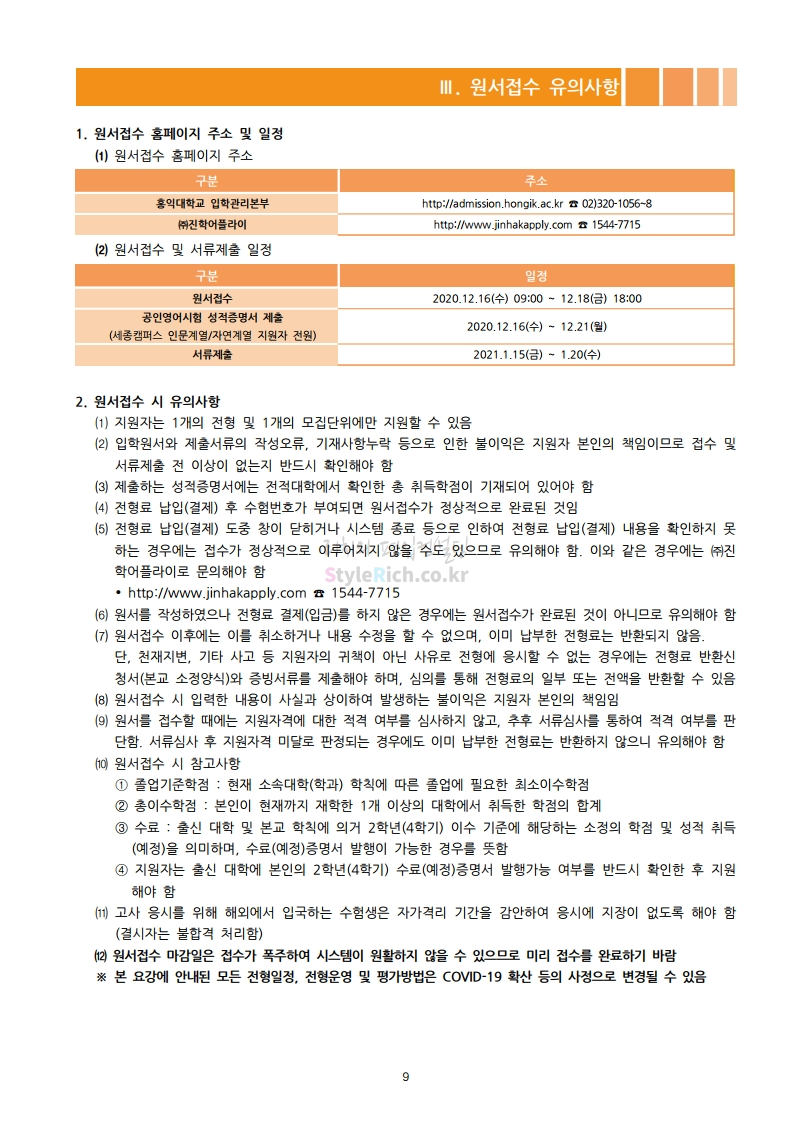 홍익대 편입 2021학년도 모집요강 간편하게 보자! 2020.12.16 02:46 편입 모집요강/2021학년도 모집요강 2021학년도 홍익대 편입 모집요강(2020.12.09 기준)을 간편하게 확인하세요. PC나 모바일에서 이미지를 클릭(터치) 후 이미지의 좌우측을 클릭(터치)하면 모집요강의 순서를 앞뒤로 넘길 수 있습니다. 좌측 클릭(터치)는 이전 페이지, 우측 클릭(터치)는 다음 페이지입니다. * 최종 모집요강 발표 이후에도 내용의 일부가 변경될 수 잇으니 지원 전 반드시 홍익대 입학처의 모집요강을 확인바랍니다. 2021학년도 홍익대 편입 모집요강 다운받기 2021_홍익대_편입학_모집요강.pdf 7.07MB <출처: 홍익대> 홍익대학교 홍보동영상 공유하기 게시글 관리 리치의 편입컨설팅 저작자표시 비영리 변경금지 (새창열림) '편입 모집요강 > 2021학년도 모집요강' 카테고리의 다른 글 동덕여대 편입 2021학년도 모집요강 간편하게 보자! (0) 2020.12.17 한양대 편입 2021학년도 모집요강 간편하게 보자! (0) 2020.12.16 아주대 편입 2021학년도 모집요강 간편하게 보자! (0) 2020.12.16 상명대 편입 2021학년도 모집요강 간편하게 보자! (0) 2020.12.16 상명대(천안) 편입 2021학년도 모집요강 간편하게 보자! (0) 2020.12.16 댓글 공유하기 다른 글 댓글 이 글 공유하기 구독하기 구독하기 카카오톡 카카오톡 라인 라인 트위터 트위터 Facebook Facebook 카카오스토리 카카오스토리 밴드 밴드 네이버 블로그 네이버 블로그 Pocket Pocket Evernote Evernote 다른 글 동덕여대 편입 2021학년도 모집요강 간편하게 보자! 동덕여대 편입 2021학년도 모집요강 간편하게 보자! 2020.12.17 한양대 편입 2021학년도 모집요강 간편하게 보자! 한양대 편입 2021학년도 모집요강 간편하게 보자! 2020.12.16 아주대 편입 2021학년도 모집요강 간편하게 보자! 아주대 편입 2021학년도 모집요강 간편하게 보자! 2020.12.16 상명대 편입 2021학년도 모집요강 간편하게 보자! 상명대 편입 2021학년도 모집요강 간편하게 보자! 2020.12.16 다른 글 더 둘러보기