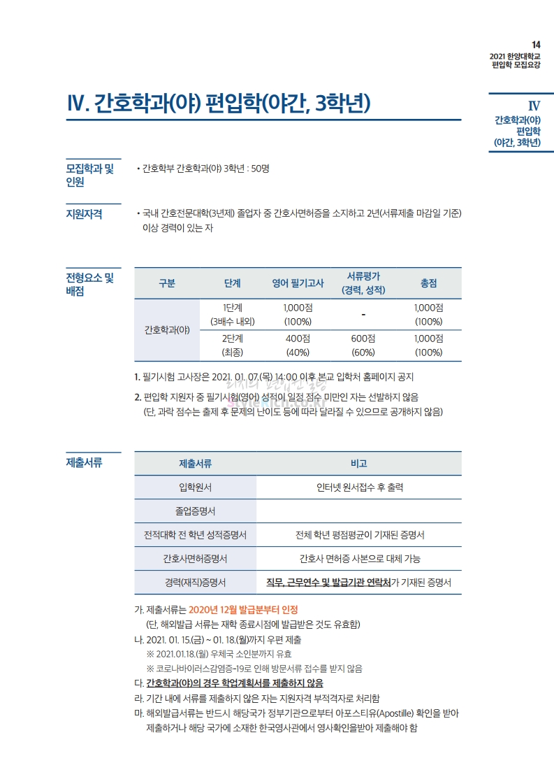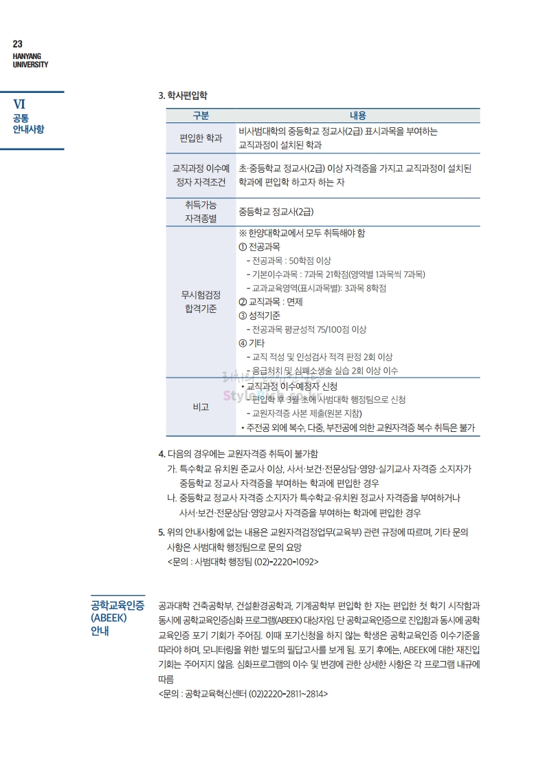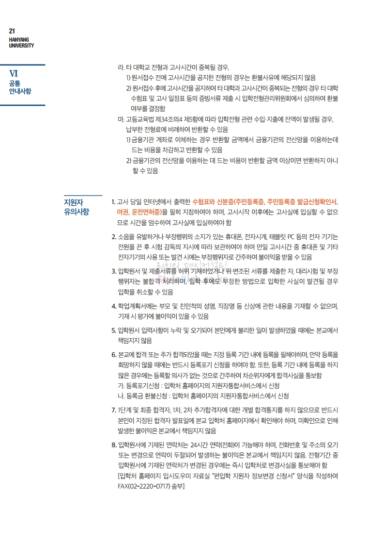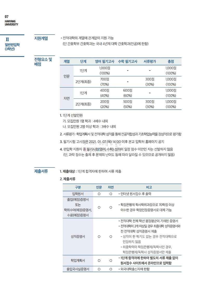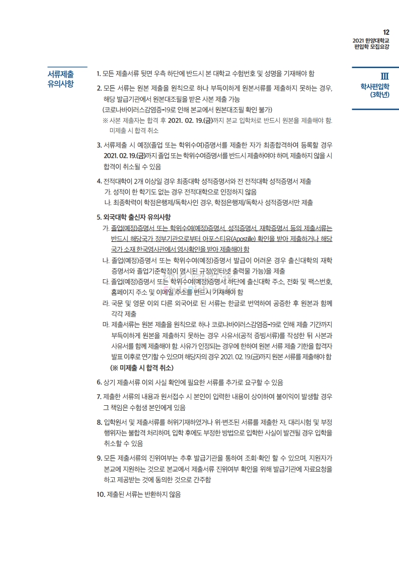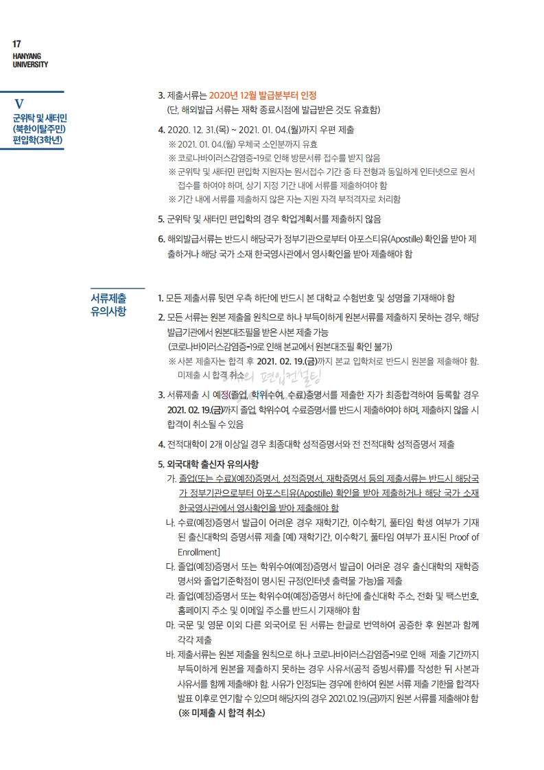 한양대 편입 2021학년도 모집요강 간편하게 보자! 2020.12.16 22:22 편입 모집요강/2021학년도 모집요강 2021학년도 한양대 편입 모집요강(2020.12.31 수정기준)을 간편하게 확인하세요. PC나 모바일에서 이미지를 클릭(터치) 후 이미지의 좌우측을 클릭(터치)하면 모집요강의 순서를 앞뒤로 넘길 수 있습니다. 좌측 클릭(터치)는 이전 페이지, 우측 클릭(터치)는 다음 페이지입니다. * 최종 모집요강 발표 이후에도 내용의 일부가 변경될 수 있으니 지원 전 반드시 한양대 입학처의 모집요강을 확인바랍니다. 2021학년도 한양대 편입 모집요강 다운받기 2021학년도 편입학 전형 모집요강(수정)_20201231.pdf 3.96MB <출처: 한양대> 코로나 전 축제🎆의 한양 (Feat 2018 Hanyang Festival|대동제 라치오스 비상) 공유하기 게시글 관리 리치의 편입컨설팅 저작자표시 비영리 변경금지 (새창열림) '편입 모집요강 > 2021학년도 모집요강' 카테고리의 다른 글 성균관대 편입 2021학년도 모집요강 간편하게 보자! (0) 2020.12.18 동덕여대 편입 2021학년도 모집요강 간편하게 보자! (0) 2020.12.17 홍익대 편입 2021학년도 모집요강 간편하게 보자! (0) 2020.12.16 아주대 편입 2021학년도 모집요강 간편하게 보자! (0) 2020.12.16 상명대 편입 2021학년도 모집요강 간편하게 보자! (0) 2020.12.16 댓글 공유하기 다른 글 댓글 이 글 공유하기 구독하기 구독하기 카카오톡 카카오톡 라인 라인 트위터 트위터 Facebook Facebook 카카오스토리 카카오스토리 밴드 밴드 네이버 블로그 네이버 블로그 Pocket Pocket Evernote Evernote 다른 글 성균관대 편입 2021학년도 모집요강 간편하게 보자! 성균관대 편입 2021학년도 모집요강 간편하게 보자! 2020.12.18 동덕여대 편입 2021학년도 모집요강 간편하게 보자! 동덕여대 편입 2021학년도 모집요강 간편하게 보자! 2020.12.17 홍익대 편입 2021학년도 모집요강 간편하게 보자! 홍익대 편입 2021학년도 모집요강 간편하게 보자! 2020.12.16 아주대 편입 2021학년도 모집요강 간편하게 보자! 아주대 편입 2021학년도 모집요강 간편하게 보자! 2020.12.16 다른 글 더 둘러보기