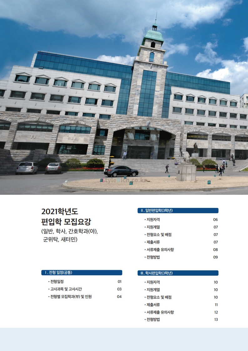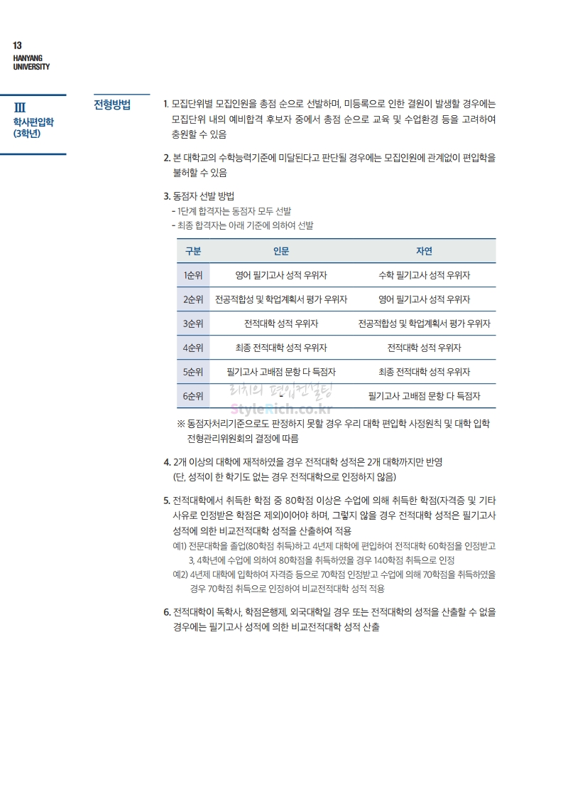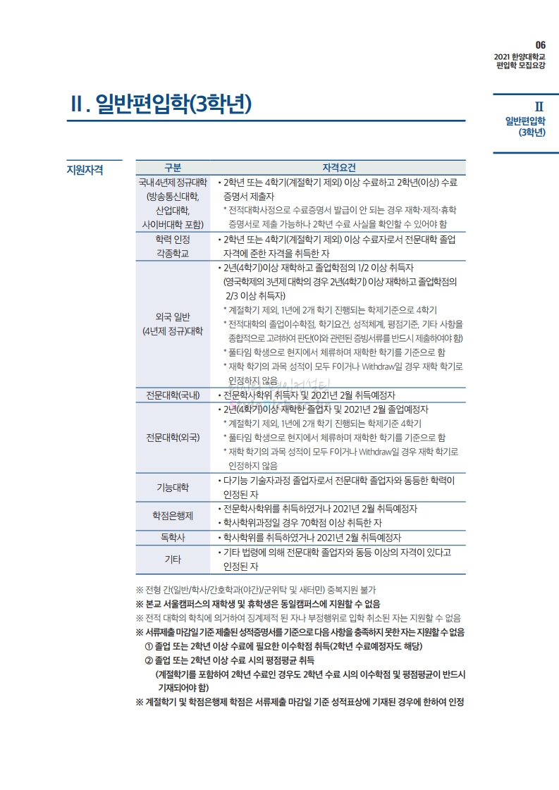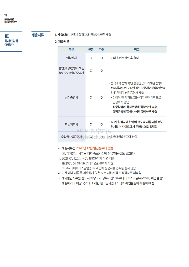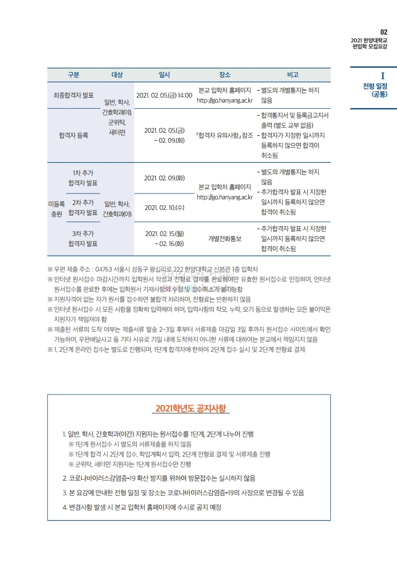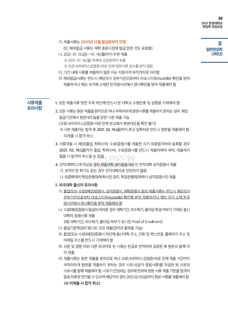한양대 편입 2021학년도 모집요강 간편하게 보자! 2020.12.16 22:22 편입 모집요강/2021학년도 모집요강 2021학년도 한양대 편입 모집요강(2020.12.31 수정기준)을 간편하게 확인하세요. PC나 모바일에서 이미지를 클릭(터치) 후 이미지의 좌우측을 클릭(터치)하면 모집요강의 순서를 앞뒤로 넘길 수 있습니다. 좌측 클릭(터치)는 이전 페이지, 우측 클릭(터치)는 다음 페이지입니다. * 최종 모집요강 발표 이후에도 내용의 일부가 변경될 수 있으니 지원 전 반드시 한양대 입학처의 모집요강을 확인바랍니다. 2021학년도 한양대 편입 모집요강 다운받기 2021학년도 편입학 전형 모집요강(수정)_20201231.pdf 3.96MB <출처: 한양대> 코로나 전 축제🎆의 한양 (Feat 2018 Hanyang Festival|대동제 라치오스 비상) 공유하기 게시글 관리 리치의 편입컨설팅 저작자표시 비영리 변경금지 (새창열림) '편입 모집요강 > 2021학년도 모집요강' 카테고리의 다른 글 성균관대 편입 2021학년도 모집요강 간편하게 보자! (0) 2020.12.18 동덕여대 편입 2021학년도 모집요강 간편하게 보자! (0) 2020.12.17 홍익대 편입 2021학년도 모집요강 간편하게 보자! (0) 2020.12.16 아주대 편입 2021학년도 모집요강 간편하게 보자! (0) 2020.12.16 상명대 편입 2021학년도 모집요강 간편하게 보자! (0) 2020.12.16 댓글 공유하기 다른 글 댓글 이 글 공유하기 구독하기 구독하기 카카오톡 카카오톡 라인 라인 트위터 트위터 Facebook Facebook 카카오스토리 카카오스토리 밴드 밴드 네이버 블로그 네이버 블로그 Pocket Pocket Evernote Evernote 다른 글 성균관대 편입 2021학년도 모집요강 간편하게 보자! 성균관대 편입 2021학년도 모집요강 간편하게 보자! 2020.12.18 동덕여대 편입 2021학년도 모집요강 간편하게 보자! 동덕여대 편입 2021학년도 모집요강 간편하게 보자! 2020.12.17 홍익대 편입 2021학년도 모집요강 간편하게 보자! 홍익대 편입 2021학년도 모집요강 간편하게 보자! 2020.12.16 아주대 편입 2021학년도 모집요강 간편하게 보자! 아주대 편입 2021학년도 모집요강 간편하게 보자! 2020.12.16 다른 글 더 둘러보기