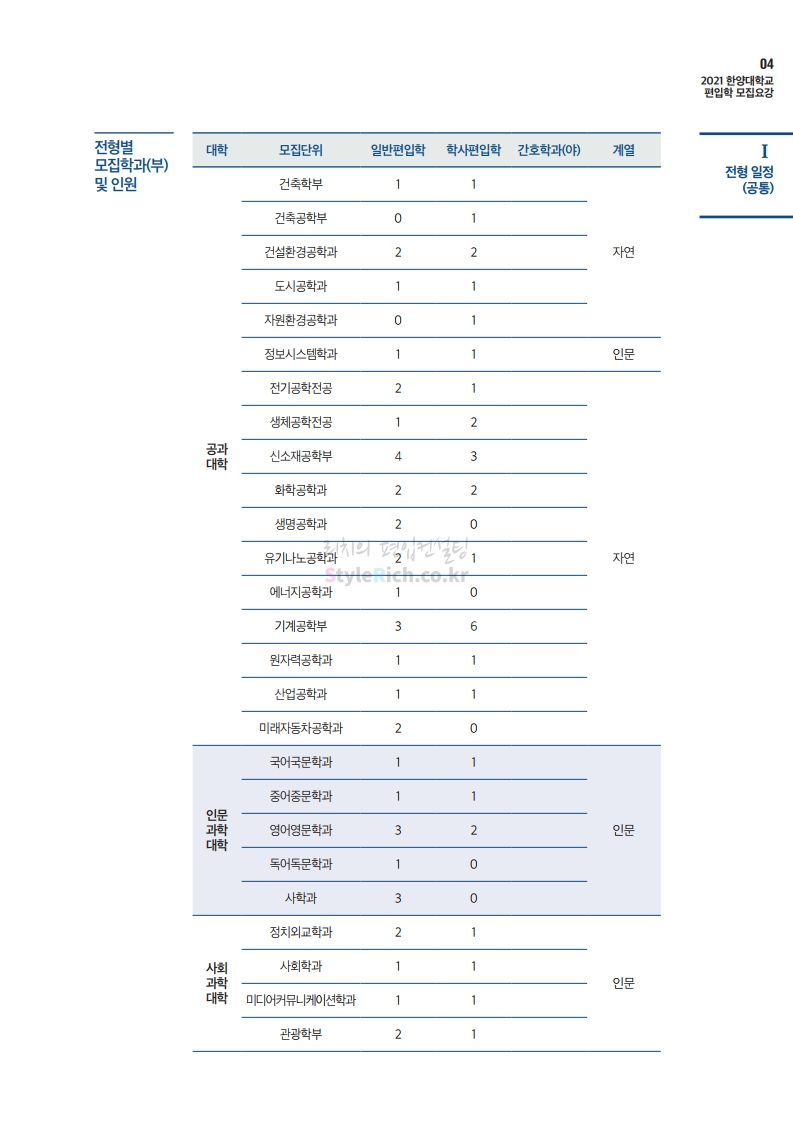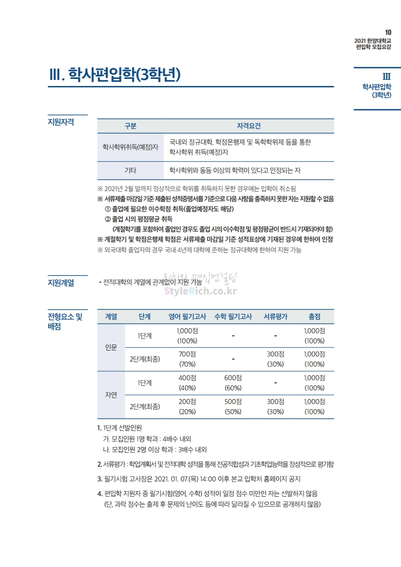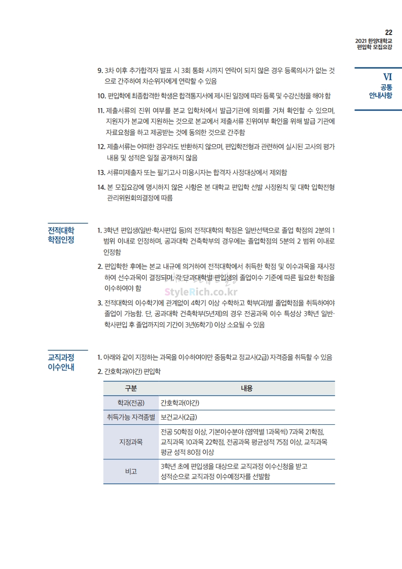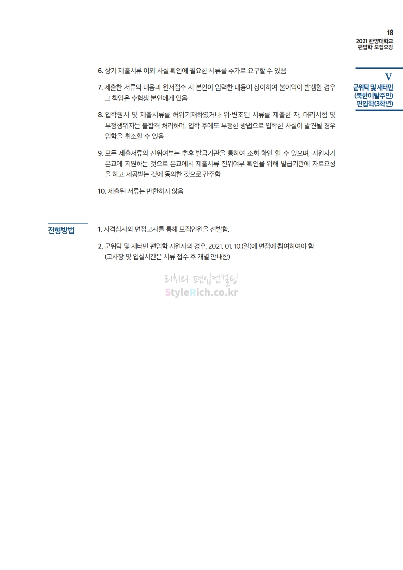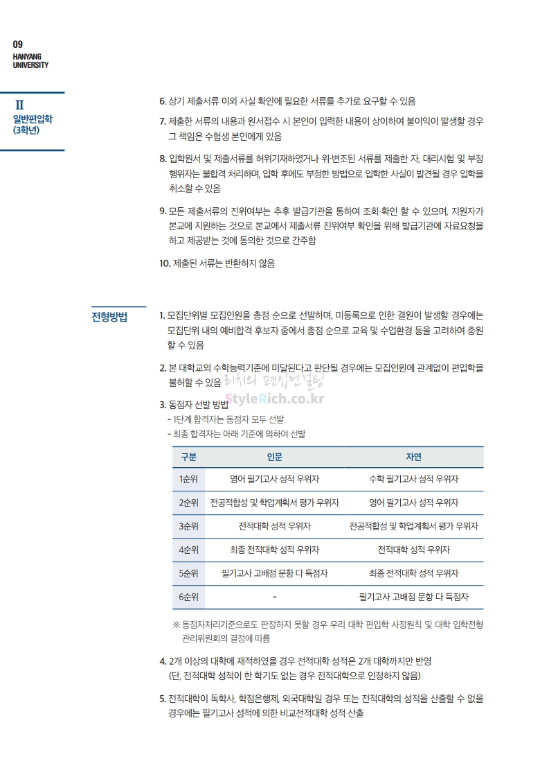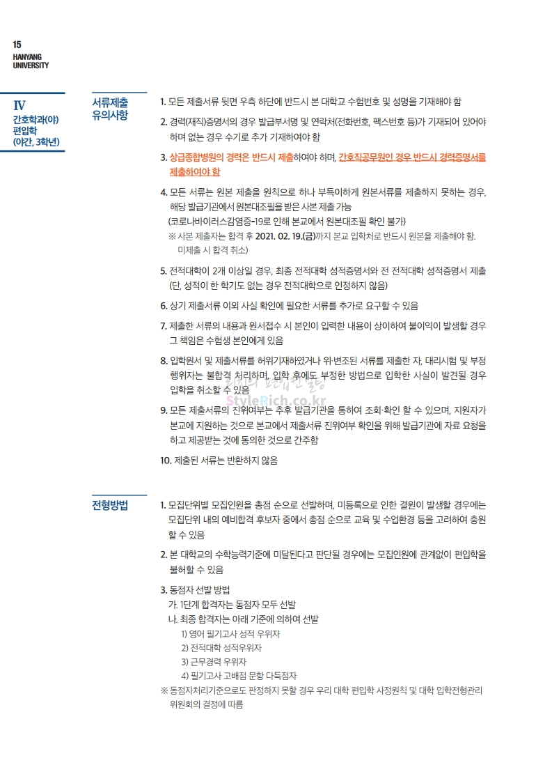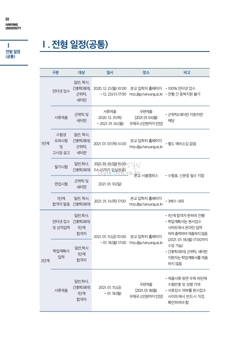 한양대 편입 2021학년도 모집요강 간편하게 보자! 2020.12.16 22:22 편입 모집요강/2021학년도 모집요강 2021학년도 한양대 편입 모집요강(2020.12.31 수정기준)을 간편하게 확인하세요. PC나 모바일에서 이미지를 클릭(터치) 후 이미지의 좌우측을 클릭(터치)하면 모집요강의 순서를 앞뒤로 넘길 수 있습니다. 좌측 클릭(터치)는 이전 페이지, 우측 클릭(터치)는 다음 페이지입니다. * 최종 모집요강 발표 이후에도 내용의 일부가 변경될 수 있으니 지원 전 반드시 한양대 입학처의 모집요강을 확인바랍니다. 2021학년도 한양대 편입 모집요강 다운받기 2021학년도 편입학 전형 모집요강(수정)_20201231.pdf 3.96MB <출처: 한양대> 코로나 전 축제🎆의 한양 (Feat 2018 Hanyang Festival|대동제 라치오스 비상) 공유하기 게시글 관리 리치의 편입컨설팅 저작자표시 비영리 변경금지 (새창열림) '편입 모집요강 > 2021학년도 모집요강' 카테고리의 다른 글 성균관대 편입 2021학년도 모집요강 간편하게 보자! (0) 2020.12.18 동덕여대 편입 2021학년도 모집요강 간편하게 보자! (0) 2020.12.17 홍익대 편입 2021학년도 모집요강 간편하게 보자! (0) 2020.12.16 아주대 편입 2021학년도 모집요강 간편하게 보자! (0) 2020.12.16 상명대 편입 2021학년도 모집요강 간편하게 보자! (0) 2020.12.16 댓글 공유하기 다른 글 댓글 이 글 공유하기 구독하기 구독하기 카카오톡 카카오톡 라인 라인 트위터 트위터 Facebook Facebook 카카오스토리 카카오스토리 밴드 밴드 네이버 블로그 네이버 블로그 Pocket Pocket Evernote Evernote 다른 글 성균관대 편입 2021학년도 모집요강 간편하게 보자! 성균관대 편입 2021학년도 모집요강 간편하게 보자! 2020.12.18 동덕여대 편입 2021학년도 모집요강 간편하게 보자! 동덕여대 편입 2021학년도 모집요강 간편하게 보자! 2020.12.17 홍익대 편입 2021학년도 모집요강 간편하게 보자! 홍익대 편입 2021학년도 모집요강 간편하게 보자! 2020.12.16 아주대 편입 2021학년도 모집요강 간편하게 보자! 아주대 편입 2021학년도 모집요강 간편하게 보자! 2020.12.16 다른 글 더 둘러보기