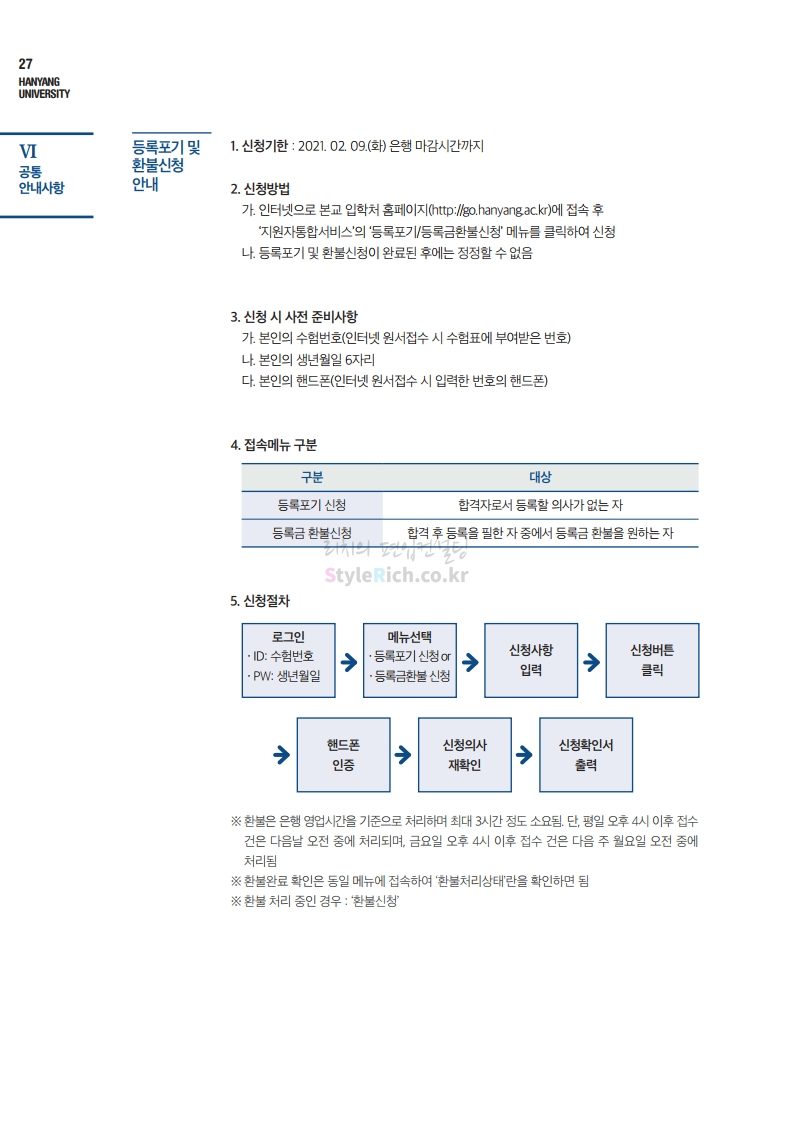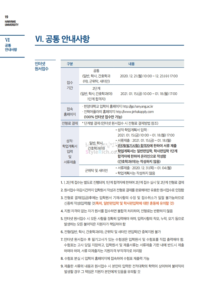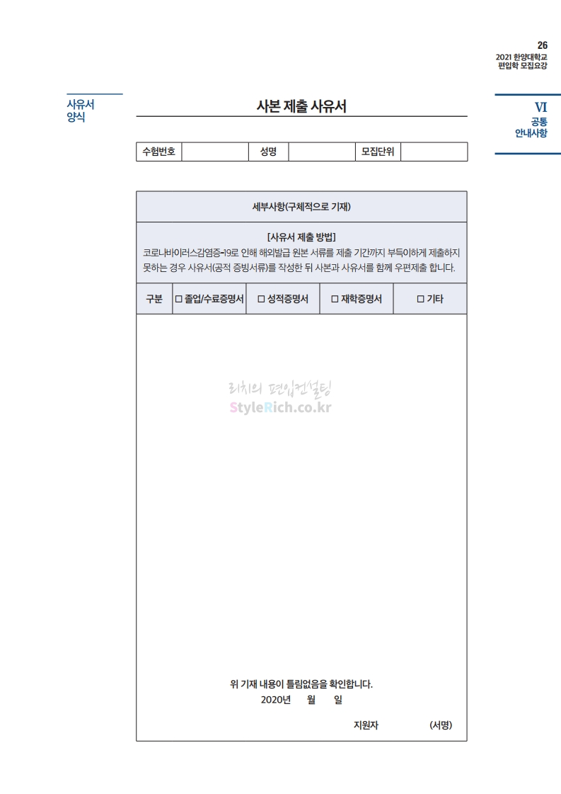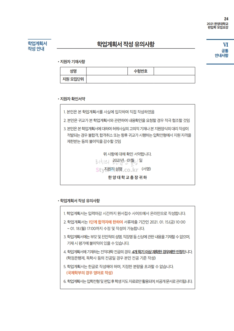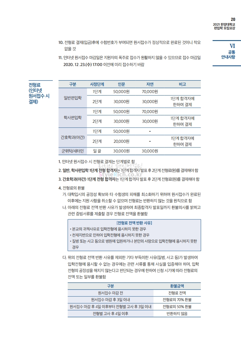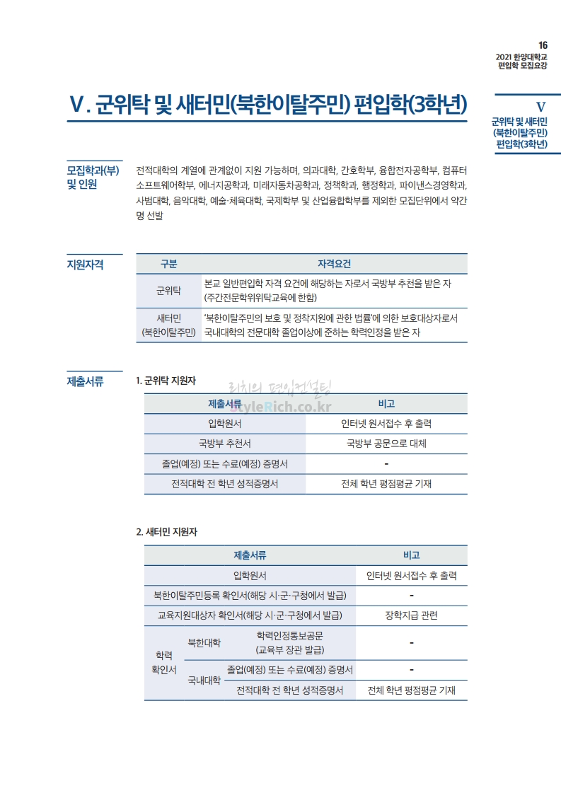 한양대 편입 2021학년도 모집요강 간편하게 보자! 2020.12.16 22:22 편입 모집요강/2021학년도 모집요강 2021학년도 한양대 편입 모집요강(2020.12.31 수정기준)을 간편하게 확인하세요. PC나 모바일에서 이미지를 클릭(터치) 후 이미지의 좌우측을 클릭(터치)하면 모집요강의 순서를 앞뒤로 넘길 수 있습니다. 좌측 클릭(터치)는 이전 페이지, 우측 클릭(터치)는 다음 페이지입니다. * 최종 모집요강 발표 이후에도 내용의 일부가 변경될 수 있으니 지원 전 반드시 한양대 입학처의 모집요강을 확인바랍니다. 2021학년도 한양대 편입 모집요강 다운받기 2021학년도 편입학 전형 모집요강(수정)_20201231.pdf 3.96MB <출처: 한양대> 코로나 전 축제🎆의 한양 (Feat 2018 Hanyang Festival|대동제 라치오스 비상) 공유하기 게시글 관리 리치의 편입컨설팅 저작자표시 비영리 변경금지 (새창열림) '편입 모집요강 > 2021학년도 모집요강' 카테고리의 다른 글 성균관대 편입 2021학년도 모집요강 간편하게 보자! (0) 2020.12.18 동덕여대 편입 2021학년도 모집요강 간편하게 보자! (0) 2020.12.17 홍익대 편입 2021학년도 모집요강 간편하게 보자! (0) 2020.12.16 아주대 편입 2021학년도 모집요강 간편하게 보자! (0) 2020.12.16 상명대 편입 2021학년도 모집요강 간편하게 보자! (0) 2020.12.16 댓글 공유하기 다른 글 댓글 이 글 공유하기 구독하기 구독하기 카카오톡 카카오톡 라인 라인 트위터 트위터 Facebook Facebook 카카오스토리 카카오스토리 밴드 밴드 네이버 블로그 네이버 블로그 Pocket Pocket Evernote Evernote 다른 글 성균관대 편입 2021학년도 모집요강 간편하게 보자! 성균관대 편입 2021학년도 모집요강 간편하게 보자! 2020.12.18 동덕여대 편입 2021학년도 모집요강 간편하게 보자! 동덕여대 편입 2021학년도 모집요강 간편하게 보자! 2020.12.17 홍익대 편입 2021학년도 모집요강 간편하게 보자! 홍익대 편입 2021학년도 모집요강 간편하게 보자! 2020.12.16 아주대 편입 2021학년도 모집요강 간편하게 보자! 아주대 편입 2021학년도 모집요강 간편하게 보자! 2020.12.16 다른 글 더 둘러보기
