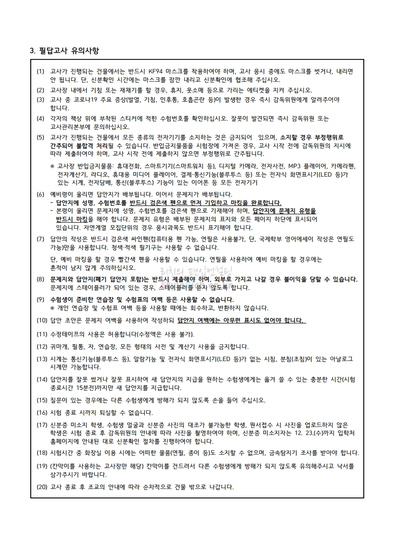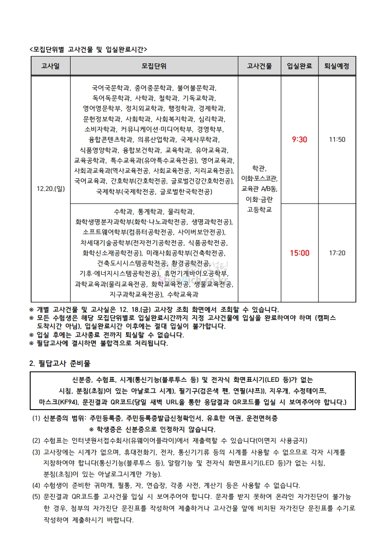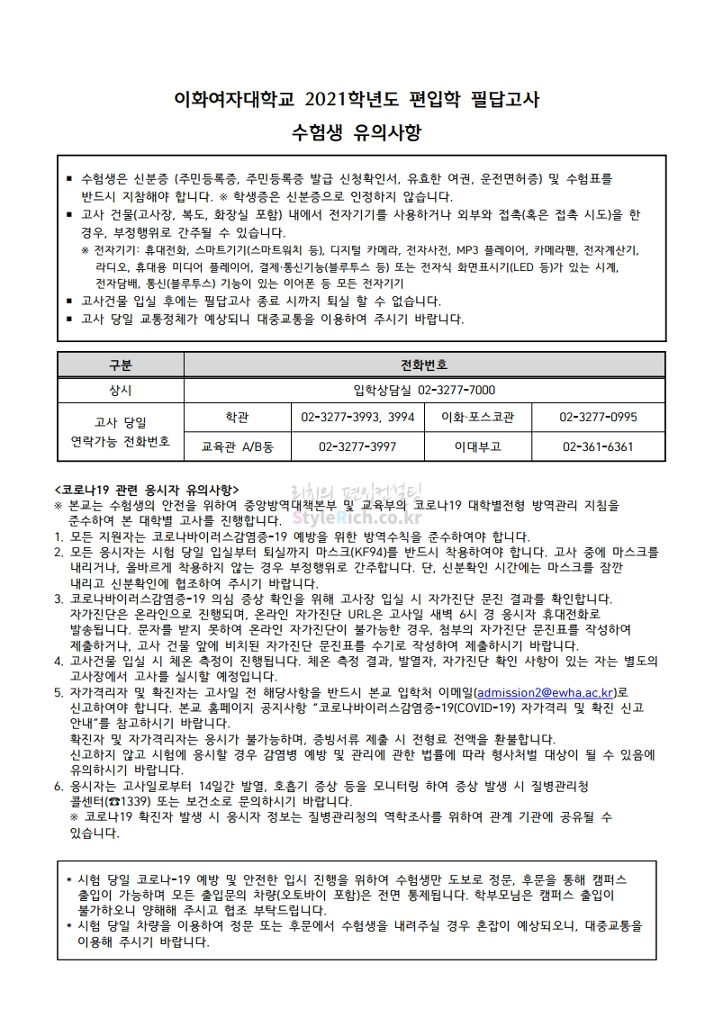 이화여대 편입 2021학년도 필답고사 유의사항 간편하게 보자! 2020.12.19 00:57 편입 유의사항/2021학년도 유의사항 2021학년도 이화여대 편입 필답고사 유의사항을 살펴보겠습니다. * 내용 일부가 변경되거나 오표기가 있을 수 있으므로 시험 전 반드시 이화여대 입학처 홈페이지에서 최종 확인바랍니다. <출처: 이화여대> [이화라떼tv] 그때 그 시절, 이화는? #8. 랜선 캠퍼스 투어: 중앙도서관 공유하기 게시글 관리 리치의 편입컨설팅 저작자표시 비영리 변경금지 (새창열림) '편입 유의사항 > 2021학년도 유의사항' 카테고리의 다른 글 경기대 편입 2021학년도 필기고사 유의사항 간편하게 보자! (0) 2020.12.25 단국대 편입 2021학년도 필기고사 유의사항 간편하게 보자! (0) 2020.12.25 고려대 편입 2021학년도 필기고사 유의사항 간편하게 보자! (0) 2020.12.25 국민대 편입 2021학년도 필답고사 유의사항 간편하게 보자! (0) 2020.12.19 숙명여대 편입 2021학년도 필답고사 유의사항 간편하게 보자! (0) 2020.12.16 댓글 공유하기 다른 글 댓글 이 글 공유하기 구독하기 구독하기 카카오톡 카카오톡 라인 라인 트위터 트위터 Facebook Facebook 카카오스토리 카카오스토리 밴드 밴드 네이버 블로그 네이버 블로그 Pocket Pocket Evernote Evernote 다른 글 단국대 편입 2021학년도 필기고사 유의사항 간편하게 보자! 단국대 편입 2021학년도 필기고사 유의사항 간편하게 보자! 2020.12.25 고려대 편입 2021학년도 필기고사 유의사항 간편하게 보자! 고려대 편입 2021학년도 필기고사 유의사항 간편하게 보자! 2020.12.25 국민대 편입 2021학년도 필답고사 유의사항 간편하게 보자! 국민대 편입 2021학년도 필답고사 유의사항 간편하게 보자! 2020.12.19 숙명여대 편입 2021학년도 필답고사 유의사항 간편하게 보자! 숙명여대 편입 2021학년도 필답고사 유의사항 간편하게 보자! 2020.12.16 다른 글 더 둘러보기