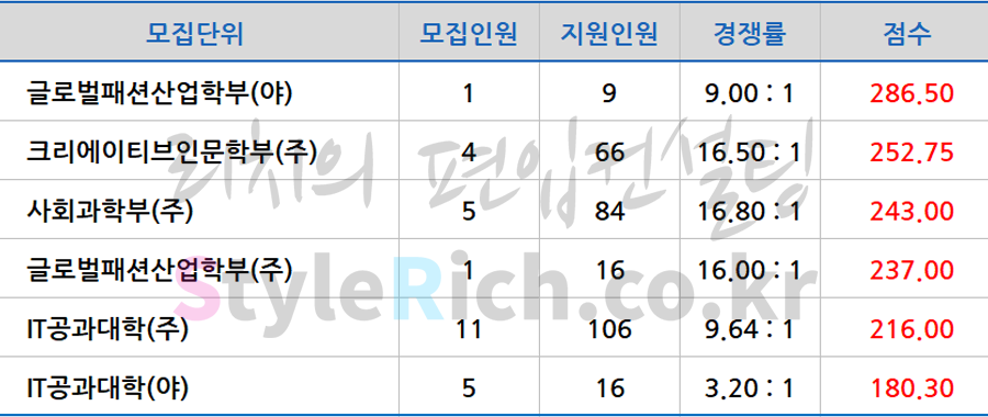 * 학사편입은 모두 영어전형이며, 합격점수가 높은 순으로 정렬