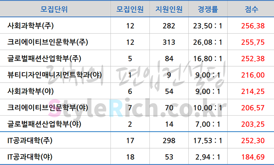 * 학사편입은 모두 영어전형이며, 합격점수가 높은 순으로 정렬