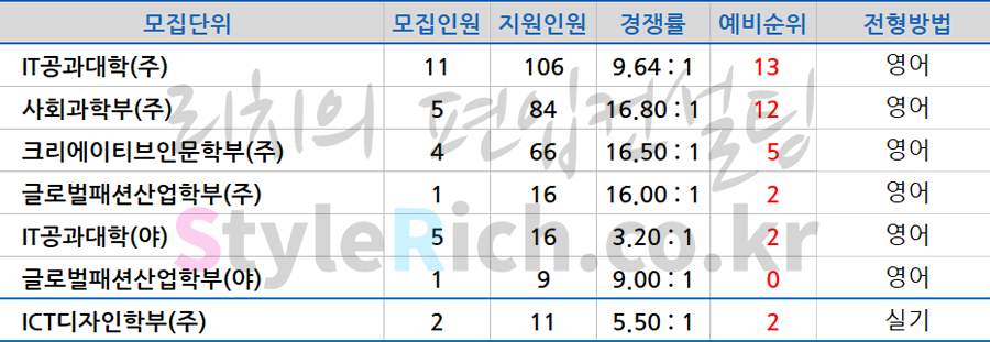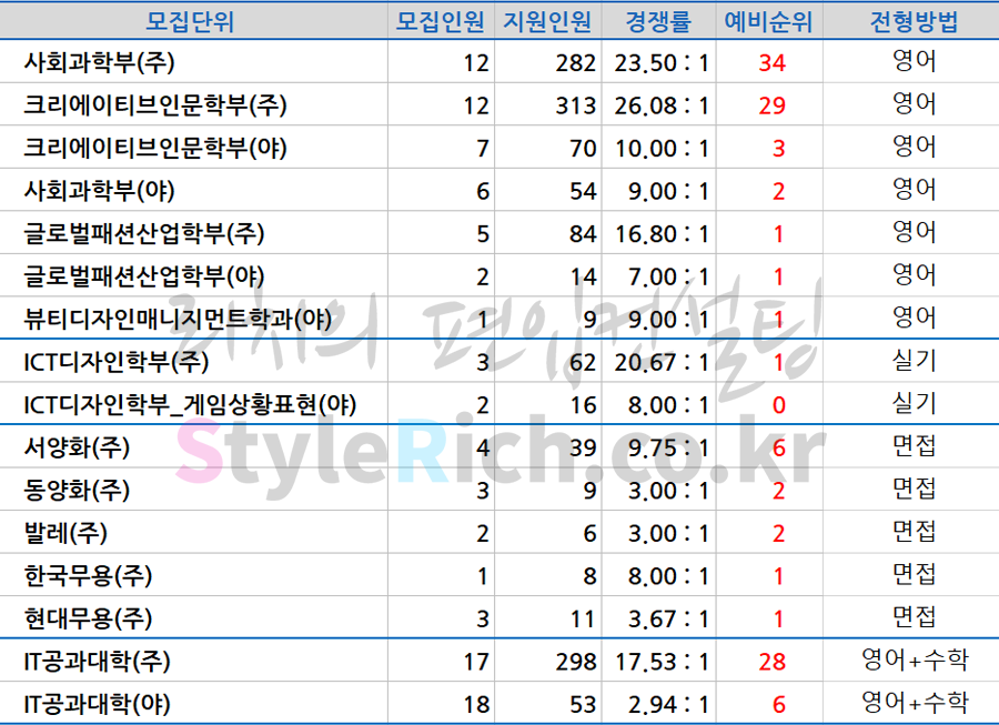 * 전형방법에 따라 영어, 영어+수학, 실기, 면접으로 분류 후 추가합격이 많은 순으로 정렬