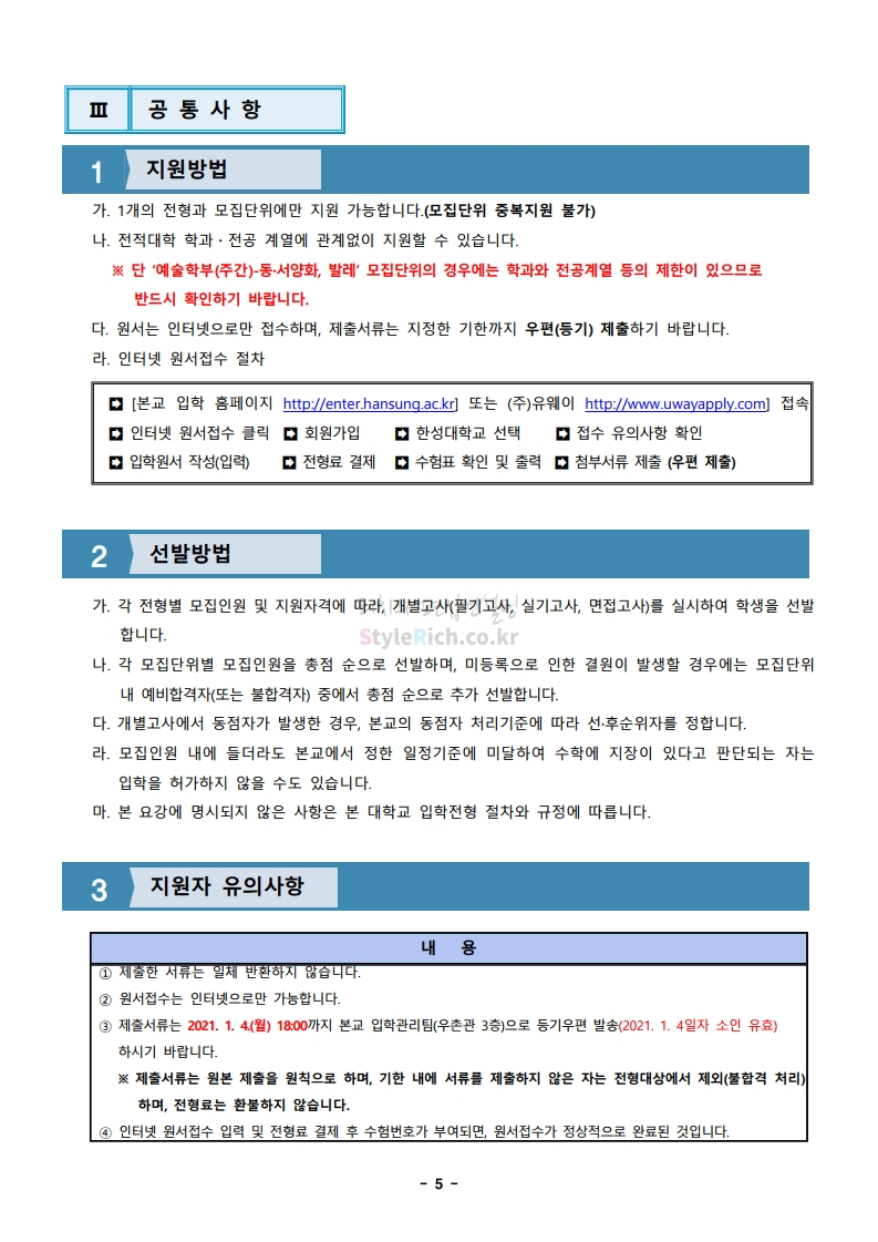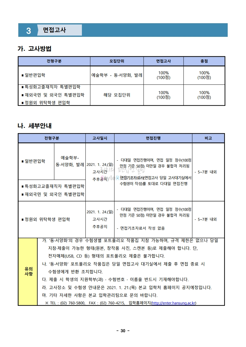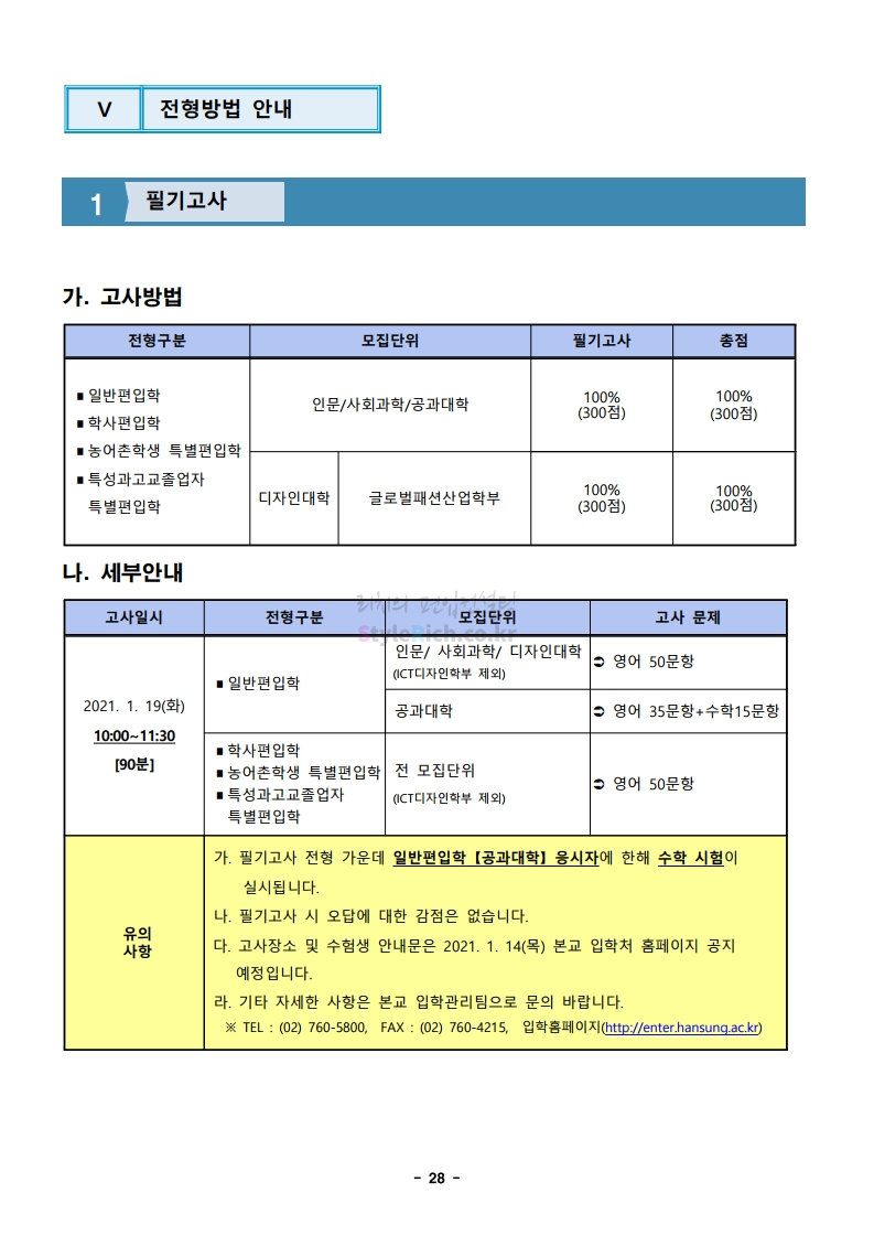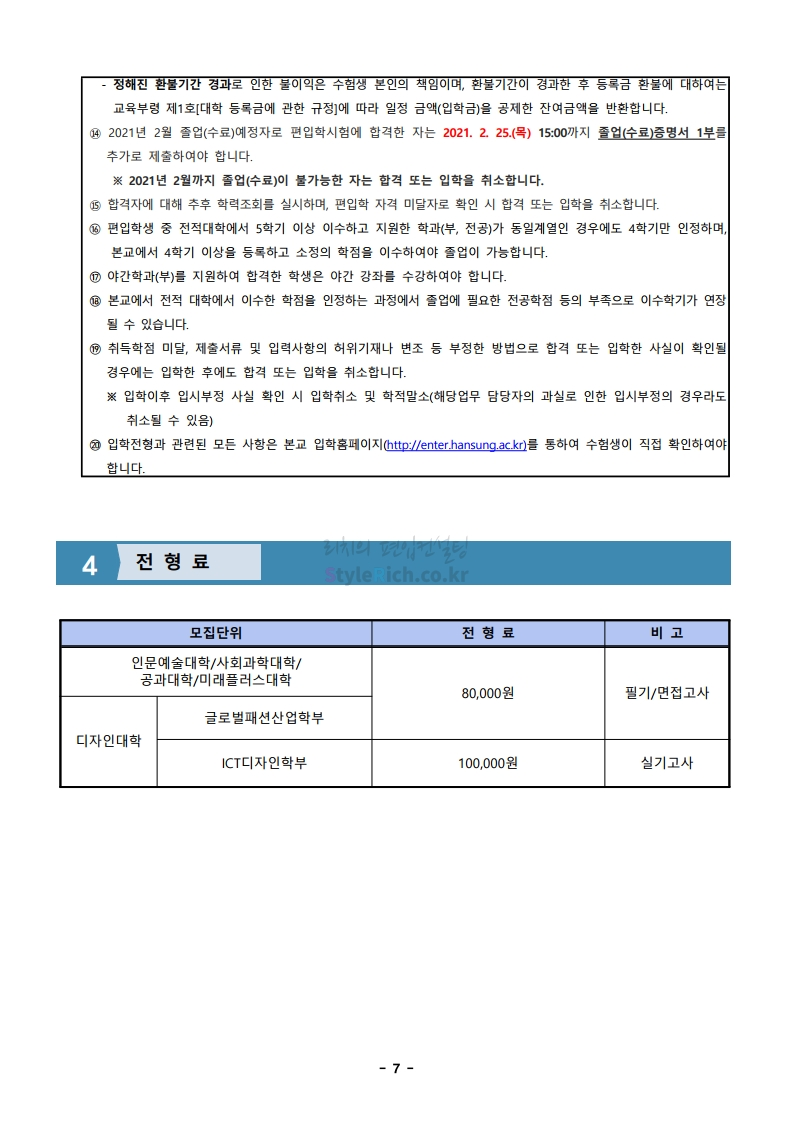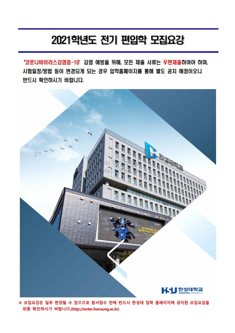 한성대 편입 2021학년도 모집요강 간편하게 보자! 2020.12.23 01:27 편입 모집요강/2021학년도 모집요강 2021학년도 한성대 편입 모집요강(2020.12.17 기준)을 간편하게 확인하세요. PC나 모바일에서 이미지를 클릭(터치) 후 이미지의 좌우측을 클릭(터치)하면 모집요강의 순서를 앞뒤로 넘길 수 있습니다. 좌측 클릭(터치)는 이전 페이지, 우측클릭(터치)는 다음 페이지입니다. * 최종 모집요강 발표 이후에도 내용의 일부가 변경될 수 있으니 지원 전 반드시 한성대 입학처 모집요강을 확인 바립니다. 2021학년도 한성대 편입 모집요강 다운받기 21 전기편입요강v5.pdf 0.96MB <출처: 한성대> 집에서🏠 스펙과 힐링을 동시에 일석이조 비대면 대학생활하기! 📚🌳 공유하기 게시글 관리 리치의 편입컨설팅 저작자표시 비영리 변경금지 (새창열림) '편입 모집요강 > 2021학년도 모집요강' 카테고리의 다른 글 덕성여대 편입 2021학년도 모집요강 간편하게 보자! (0) 2020.12.24 한양대(에리카) 편입 2021학년도 모집요강 간편하게 보자! (0) 2020.12.23 인천대 편입 2021학년도 모집요강 간편하게 보자! (0) 2020.12.20 성신여대 편입 2021학년도 모집요강 간편하게 보자! (0) 2020.12.20 성균관대 편입 2021학년도 모집요강 간편하게 보자! (0) 2020.12.18 댓글 공유하기 다른 글 댓글 이 글 공유하기 구독하기 구독하기 카카오톡 카카오톡 라인 라인 트위터 트위터 Facebook Facebook 카카오스토리 카카오스토리 밴드 밴드 네이버 블로그 네이버 블로그 Pocket Pocket Evernote Evernote 다른 글 덕성여대 편입 2021학년도 모집요강 간편하게 보자! 덕성여대 편입 2021학년도 모집요강 간편하게 보자! 2020.12.24 한양대(에리카) 편입 2021학년도 모집요강 간편하게 보자! 한양대(에리카) 편입 2021학년도 모집요강 간편하게 보자! 2020.12.23 인천대 편입 2021학년도 모집요강 간편하게 보자! 인천대 편입 2021학년도 모집요강 간편하게 보자! 2020.12.20 성신여대 편입 2021학년도 모집요강 간편하게 보자! 성신여대 편입 2021학년도 모집요강 간편하게 보자! 2020.12.20 다른 글 더 둘러보기