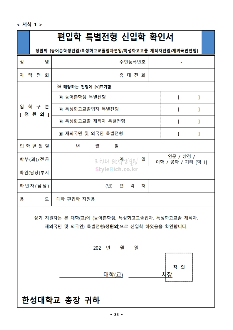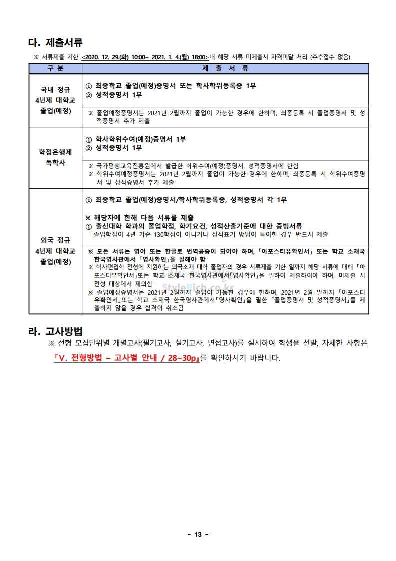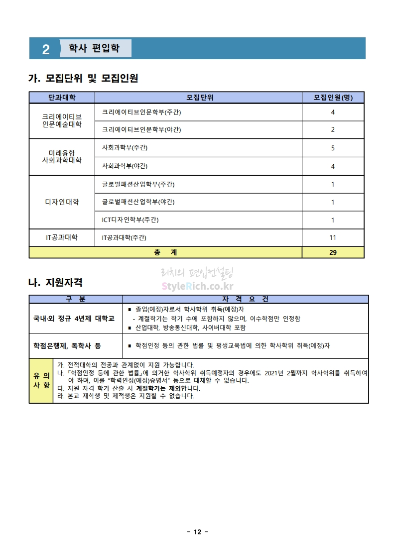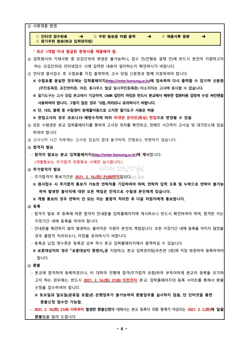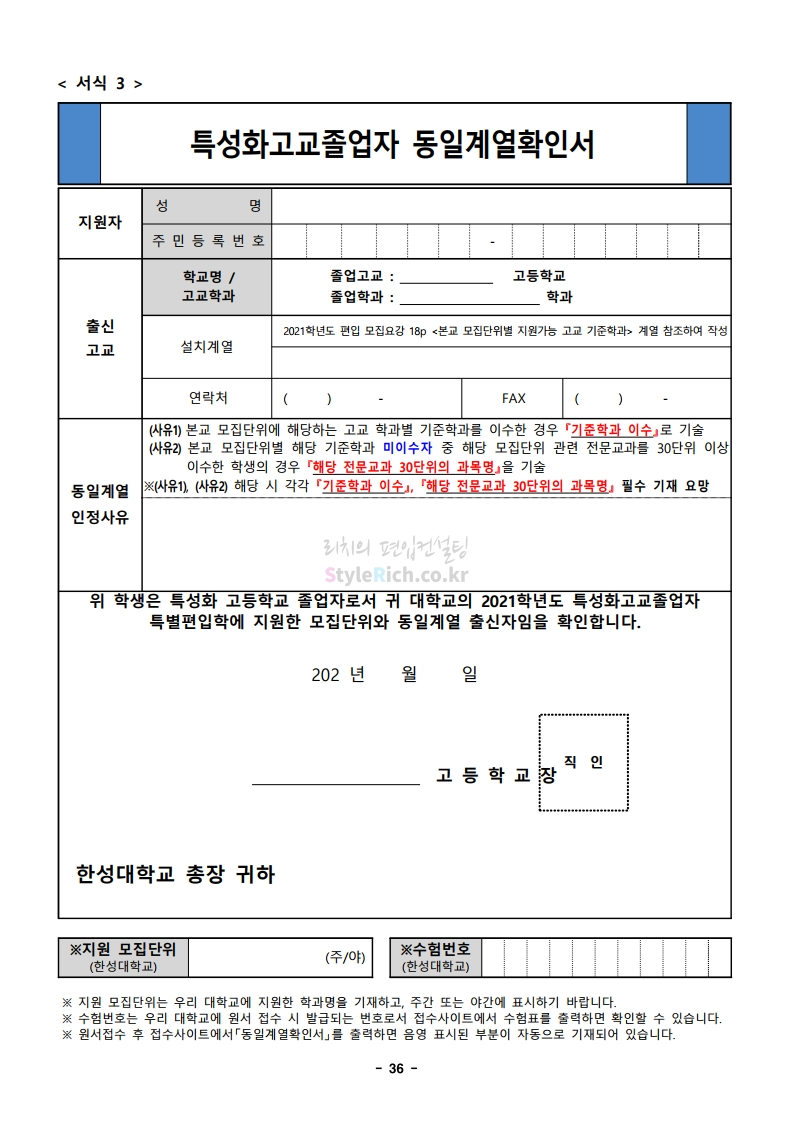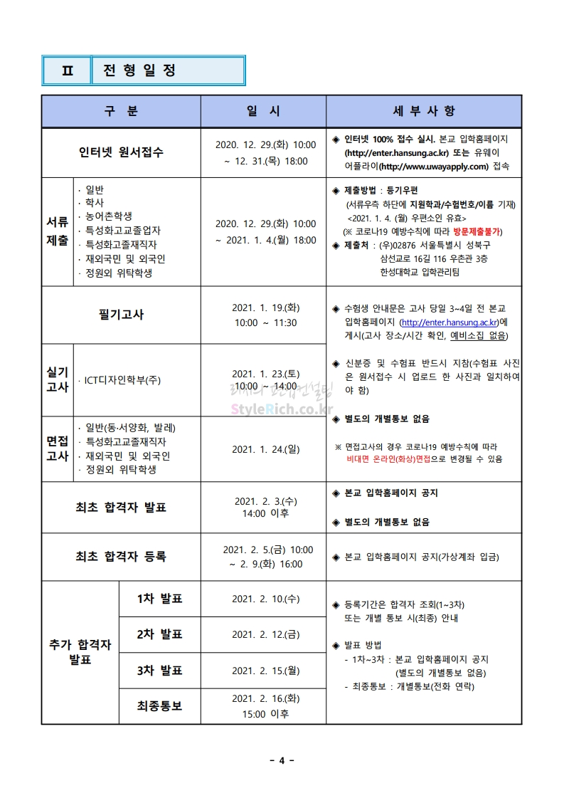 한성대 편입 2021학년도 모집요강 간편하게 보자! 2020.12.23 01:27 편입 모집요강/2021학년도 모집요강 2021학년도 한성대 편입 모집요강(2020.12.17 기준)을 간편하게 확인하세요. PC나 모바일에서 이미지를 클릭(터치) 후 이미지의 좌우측을 클릭(터치)하면 모집요강의 순서를 앞뒤로 넘길 수 있습니다. 좌측 클릭(터치)는 이전 페이지, 우측클릭(터치)는 다음 페이지입니다. * 최종 모집요강 발표 이후에도 내용의 일부가 변경될 수 있으니 지원 전 반드시 한성대 입학처 모집요강을 확인 바립니다. 2021학년도 한성대 편입 모집요강 다운받기 21 전기편입요강v5.pdf 0.96MB <출처: 한성대> 집에서🏠 스펙과 힐링을 동시에 일석이조 비대면 대학생활하기! 📚🌳 공유하기 게시글 관리 리치의 편입컨설팅 저작자표시 비영리 변경금지 (새창열림) '편입 모집요강 > 2021학년도 모집요강' 카테고리의 다른 글 덕성여대 편입 2021학년도 모집요강 간편하게 보자! (0) 2020.12.24 한양대(에리카) 편입 2021학년도 모집요강 간편하게 보자! (0) 2020.12.23 인천대 편입 2021학년도 모집요강 간편하게 보자! (0) 2020.12.20 성신여대 편입 2021학년도 모집요강 간편하게 보자! (0) 2020.12.20 성균관대 편입 2021학년도 모집요강 간편하게 보자! (0) 2020.12.18 댓글 공유하기 다른 글 댓글 이 글 공유하기 구독하기 구독하기 카카오톡 카카오톡 라인 라인 트위터 트위터 Facebook Facebook 카카오스토리 카카오스토리 밴드 밴드 네이버 블로그 네이버 블로그 Pocket Pocket Evernote Evernote 다른 글 덕성여대 편입 2021학년도 모집요강 간편하게 보자! 덕성여대 편입 2021학년도 모집요강 간편하게 보자! 2020.12.24 한양대(에리카) 편입 2021학년도 모집요강 간편하게 보자! 한양대(에리카) 편입 2021학년도 모집요강 간편하게 보자! 2020.12.23 인천대 편입 2021학년도 모집요강 간편하게 보자! 인천대 편입 2021학년도 모집요강 간편하게 보자! 2020.12.20 성신여대 편입 2021학년도 모집요강 간편하게 보자! 성신여대 편입 2021학년도 모집요강 간편하게 보자! 2020.12.20 다른 글 더 둘러보기