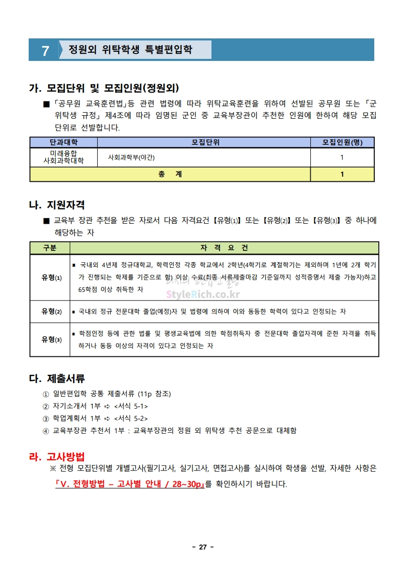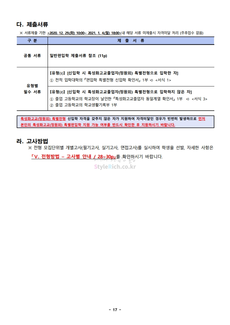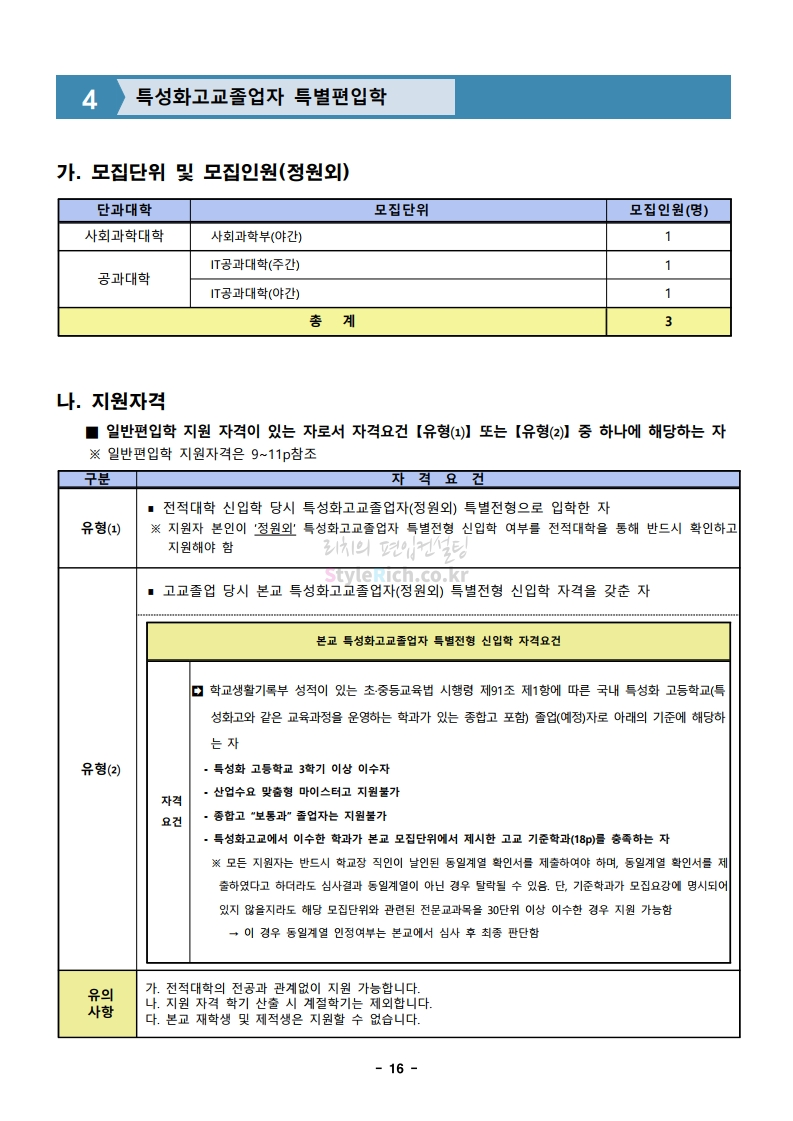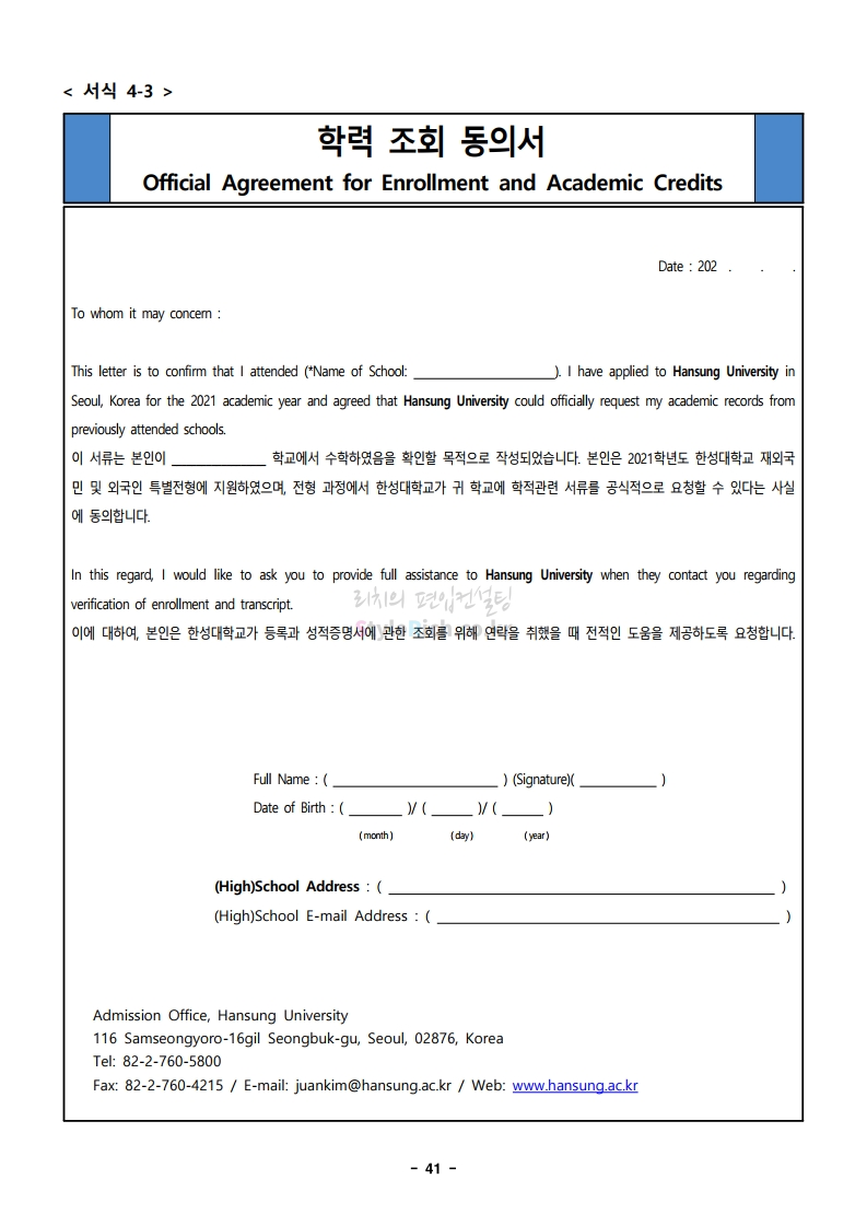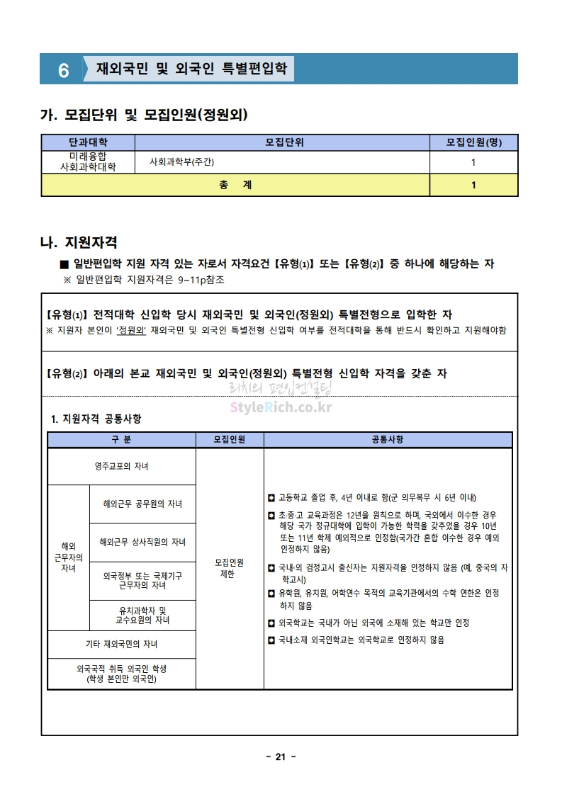 한성대 편입 2021학년도 모집요강 간편하게 보자! 2020.12.23 01:27 편입 모집요강/2021학년도 모집요강 2021학년도 한성대 편입 모집요강(2020.12.17 기준)을 간편하게 확인하세요. PC나 모바일에서 이미지를 클릭(터치) 후 이미지의 좌우측을 클릭(터치)하면 모집요강의 순서를 앞뒤로 넘길 수 있습니다. 좌측 클릭(터치)는 이전 페이지, 우측클릭(터치)는 다음 페이지입니다. * 최종 모집요강 발표 이후에도 내용의 일부가 변경될 수 있으니 지원 전 반드시 한성대 입학처 모집요강을 확인 바립니다. 2021학년도 한성대 편입 모집요강 다운받기 21 전기편입요강v5.pdf 0.96MB <출처: 한성대> 집에서🏠 스펙과 힐링을 동시에 일석이조 비대면 대학생활하기! 📚🌳 공유하기 게시글 관리 리치의 편입컨설팅 저작자표시 비영리 변경금지 (새창열림) '편입 모집요강 > 2021학년도 모집요강' 카테고리의 다른 글 덕성여대 편입 2021학년도 모집요강 간편하게 보자! (0) 2020.12.24 한양대(에리카) 편입 2021학년도 모집요강 간편하게 보자! (0) 2020.12.23 인천대 편입 2021학년도 모집요강 간편하게 보자! (0) 2020.12.20 성신여대 편입 2021학년도 모집요강 간편하게 보자! (0) 2020.12.20 성균관대 편입 2021학년도 모집요강 간편하게 보자! (0) 2020.12.18 댓글 공유하기 다른 글 댓글 이 글 공유하기 구독하기 구독하기 카카오톡 카카오톡 라인 라인 트위터 트위터 Facebook Facebook 카카오스토리 카카오스토리 밴드 밴드 네이버 블로그 네이버 블로그 Pocket Pocket Evernote Evernote 다른 글 덕성여대 편입 2021학년도 모집요강 간편하게 보자! 덕성여대 편입 2021학년도 모집요강 간편하게 보자! 2020.12.24 한양대(에리카) 편입 2021학년도 모집요강 간편하게 보자! 한양대(에리카) 편입 2021학년도 모집요강 간편하게 보자! 2020.12.23 인천대 편입 2021학년도 모집요강 간편하게 보자! 인천대 편입 2021학년도 모집요강 간편하게 보자! 2020.12.20 성신여대 편입 2021학년도 모집요강 간편하게 보자! 성신여대 편입 2021학년도 모집요강 간편하게 보자! 2020.12.20 다른 글 더 둘러보기