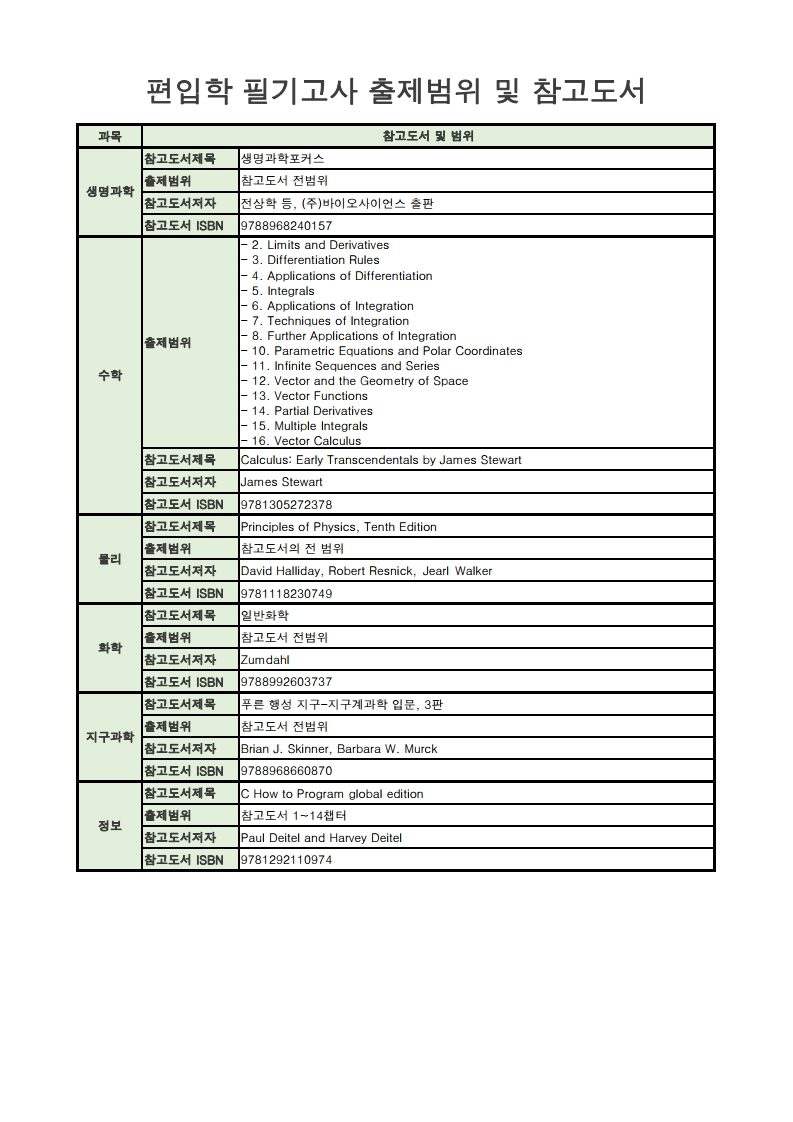 2021학년도 고려대 편입 자연계 필기고사 참고도서 및 출제범위