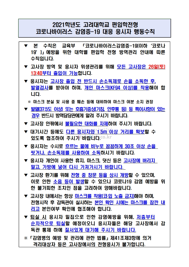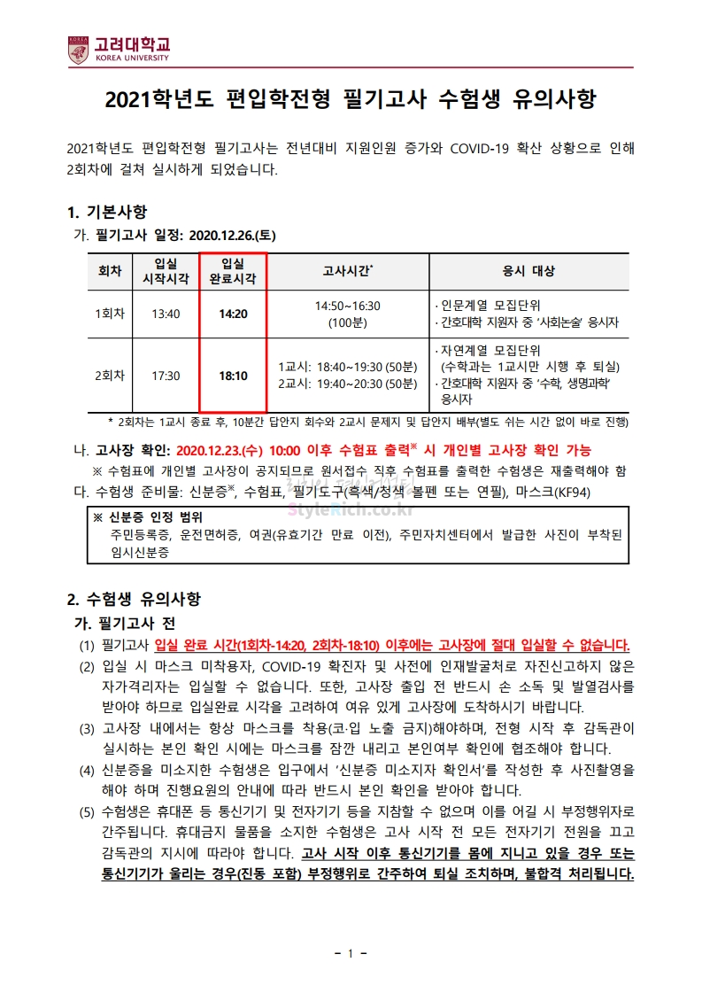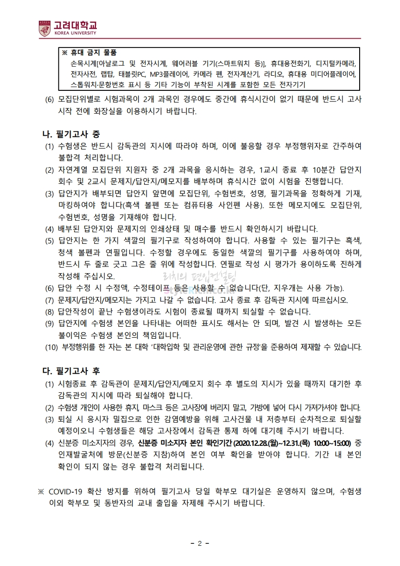 고려대 편입 2021학년도 필기고사 유의사항 간편하게 보자! 2020.12.25 16:18 편입 유의사항/2021학년도 유의사항 2021학년도 고려대 편입 필기고사 유의사항을 살펴보겠습니다. * 내용의 일부가 변경되거 오표기가 있을 수 있으므로 시험 전 반드시 고려대 입학처 홈페이지에서 최종적으로 확인바랍니다. <출처: 고려대> [고려대학교 Korea University] 2020 고려대학교 홍보영상 (2020.06 QS 수정) 공유하기 게시글 관리 리치의 편입컨설팅 저작자표시 비영리 변경금지 (새창열림) '편입 유의사항 > 2021학년도 유의사항' 카테고리의 다른 글 경기대 편입 2021학년도 필기고사 유의사항 간편하게 보자! (0) 2020.12.25 단국대 편입 2021학년도 필기고사 유의사항 간편하게 보자! (0) 2020.12.25 이화여대 편입 2021학년도 필답고사 유의사항 간편하게 보자! (0) 2020.12.19 국민대 편입 2021학년도 필답고사 유의사항 간편하게 보자! (0) 2020.12.19 숙명여대 편입 2021학년도 필답고사 유의사항 간편하게 보자! (0) 2020.12.16 댓글 공유하기 다른 글 댓글 이 글 공유하기 구독하기 구독하기 카카오톡 카카오톡 라인 라인 트위터 트위터 Facebook Facebook 카카오스토리 카카오스토리 밴드 밴드 네이버 블로그 네이버 블로그 Pocket Pocket Evernote Evernote 다른 글 경기대 편입 2021학년도 필기고사 유의사항 간편하게 보자! 경기대 편입 2021학년도 필기고사 유의사항 간편하게 보자! 2020.12.25 단국대 편입 2021학년도 필기고사 유의사항 간편하게 보자! 단국대 편입 2021학년도 필기고사 유의사항 간편하게 보자! 2020.12.25 이화여대 편입 2021학년도 필답고사 유의사항 간편하게 보자! 이화여대 편입 2021학년도 필답고사 유의사항 간편하게 보자! 2020.12.19 국민대 편입 2021학년도 필답고사 유의사항 간편하게 보자! 국민대 편입 2021학년도 필답고사 유의사항 간편하게 보자! 2020.12.19 다른 글 더 둘러보기