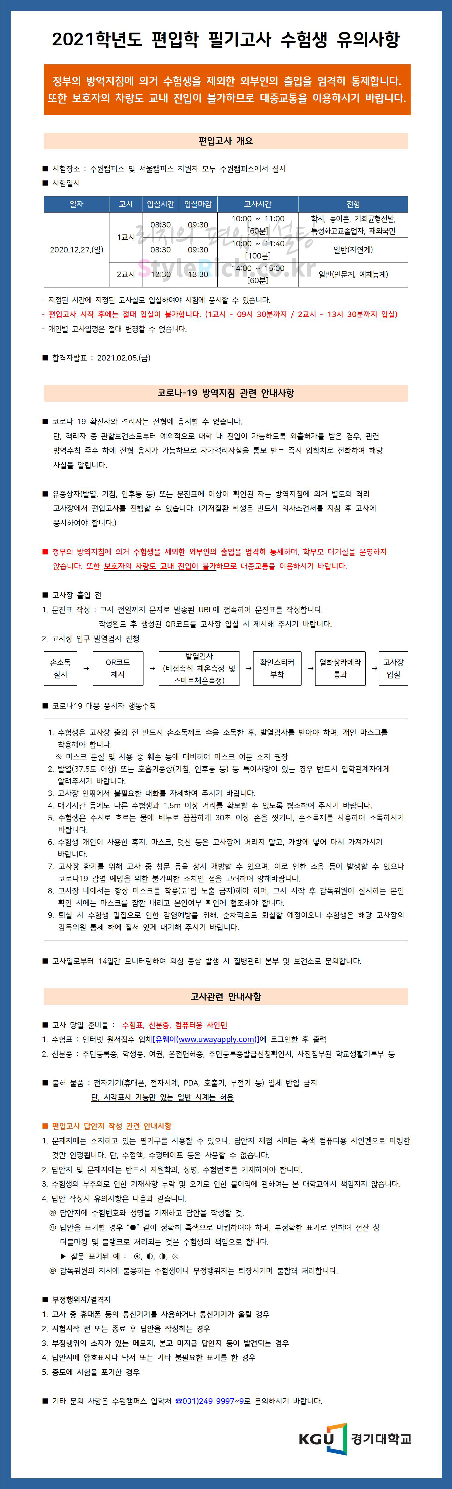 경기대 편입 2021학년도 필기고사 유의사항 간편하게 보자! 2020.12.25 17:39 편입 유의사항/2021학년도 유의사항 2021학년도 경기대 편입 필기고사 유의사항을 살펴보겠습니다. * 내용 일부가 변경되거나 오표기가 있을 수 있으므로 시험 전 반드시 경기대 입학처 홈페이지에서 최종 확인바랍니다. 2021학년도 경기대 편입 필기고사 유의사항 <출처: 경기대> 2020년도 경기대학교 온라인 캠퍼스투어(수원캠퍼스) 공유하기 게시글 관리 리치의 편입컨설팅 저작자표시 비영리 변경금지 (새창열림) '편입 유의사항 > 2021학년도 유의사항' 카테고리의 다른 글 세종대 편입 2021학년도 필기고사 유의사항 간편하게 보자! (0) 2020.12.30 건국대 편입 2021학년도 필기고사 유의사항 간편하게 보자 (0) 2020.12.29 단국대 편입 2021학년도 필기고사 유의사항 간편하게 보자! (0) 2020.12.25 고려대 편입 2021학년도 필기고사 유의사항 간편하게 보자! (0) 2020.12.25 이화여대 편입 2021학년도 필답고사 유의사항 간편하게 보자! (0) 2020.12.19 댓글 공유하기 다른 글 댓글 이 글 공유하기 구독하기 구독하기 카카오톡 카카오톡 라인 라인 트위터 트위터 Facebook Facebook 카카오스토리 카카오스토리 밴드 밴드 네이버 블로그 네이버 블로그 Pocket Pocket Evernote Evernote 다른 글 세종대 편입 2021학년도 필기고사 유의사항 간편하게 보자! 세종대 편입 2021학년도 필기고사 유의사항 간편하게 보자! 2020.12.30 건국대 편입 2021학년도 필기고사 유의사항 간편하게 보자 건국대 편입 2021학년도 필기고사 유의사항 간편하게 보자 2020.12.29 단국대 편입 2021학년도 필기고사 유의사항 간편하게 보자! 단국대 편입 2021학년도 필기고사 유의사항 간편하게 보자! 2020.12.25 고려대 편입 2021학년도 필기고사 유의사항 간편하게 보자! 고려대 편입 2021학년도 필기고사 유의사항 간편하게 보자! 2020.12.25 다른 글 더 둘러보기
