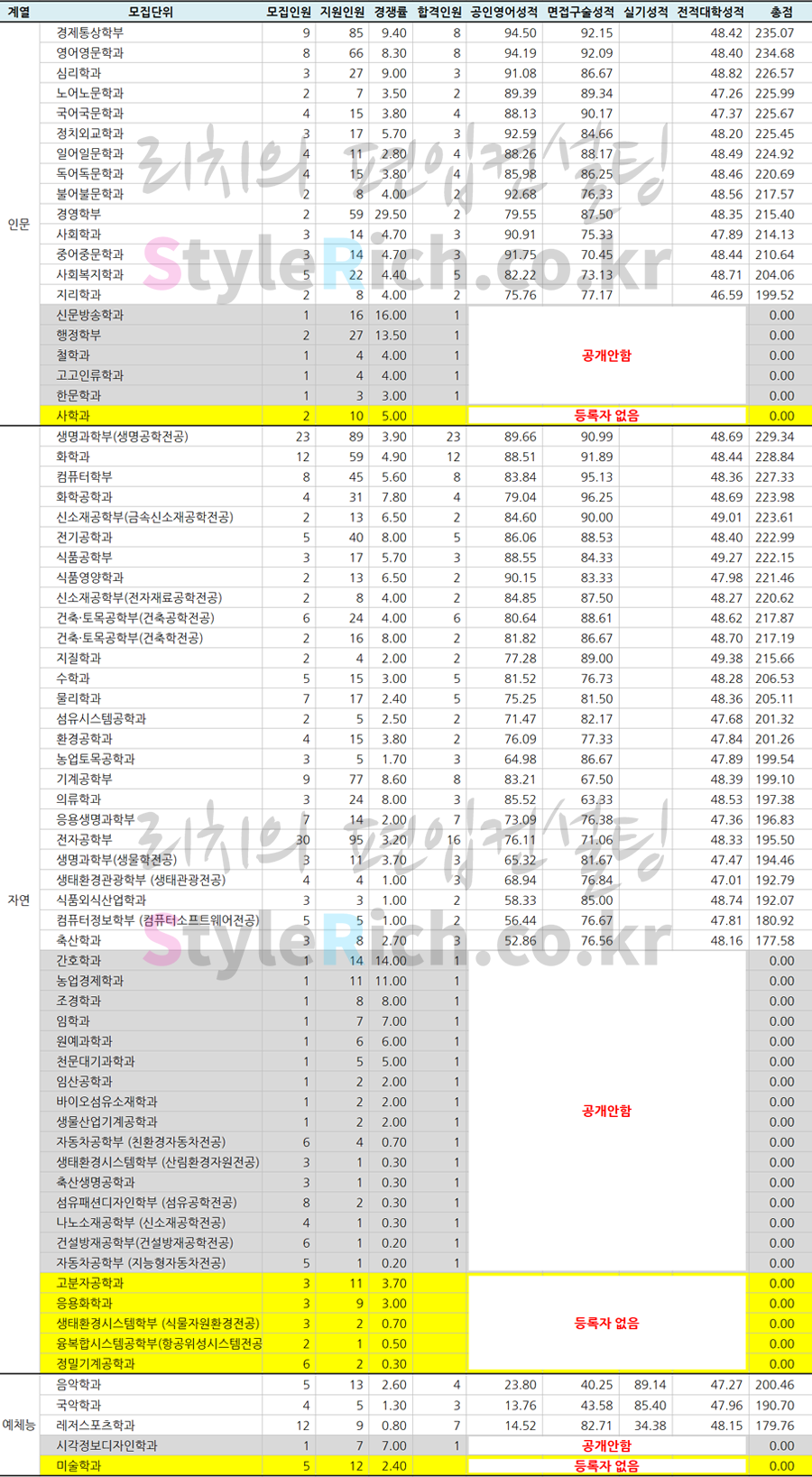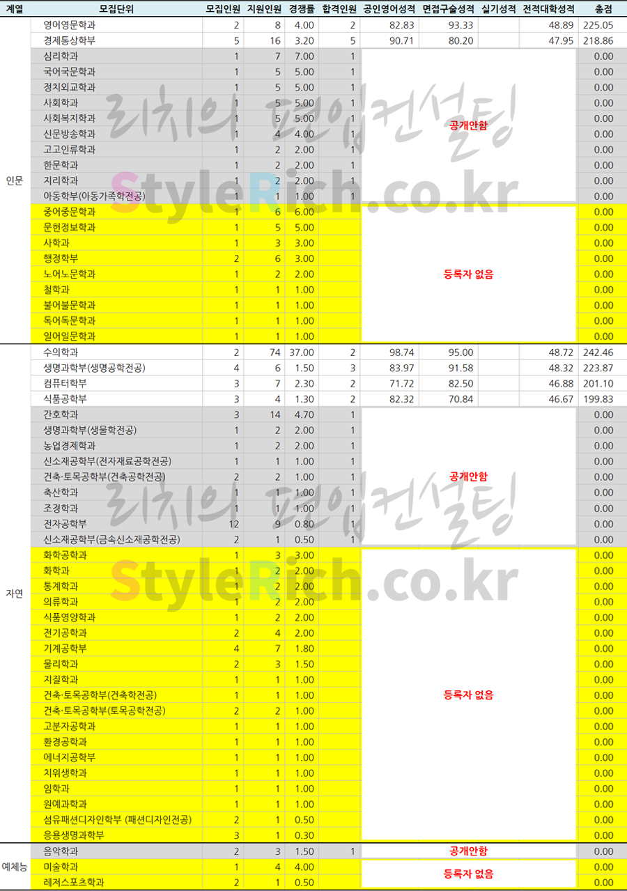 * 인문, 자연, 예체능으로 분류 후 공인영어, 면접구술, 실기, 전적대 성적을 합산한 점수가 높은 순으로 정렬
