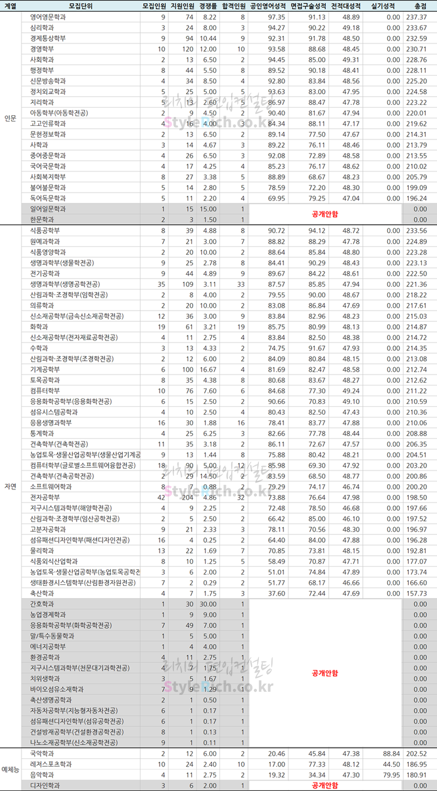 * 인문, 자연, 예체능으로 분류 후 공인영어, 면접구술, 전적대 성적을 합산한 점수가 높은 순으로 정렬