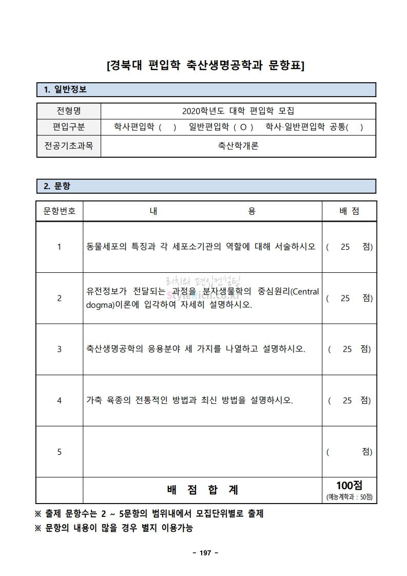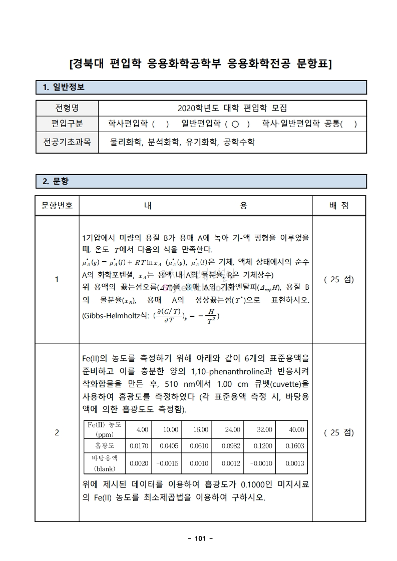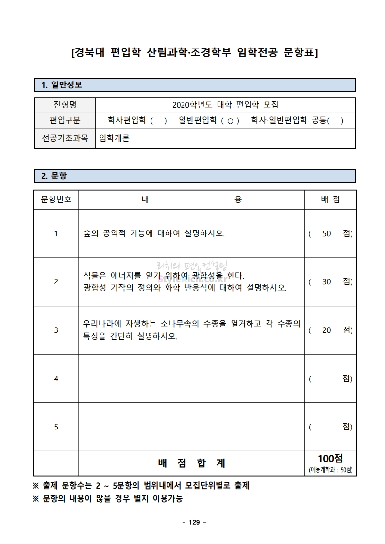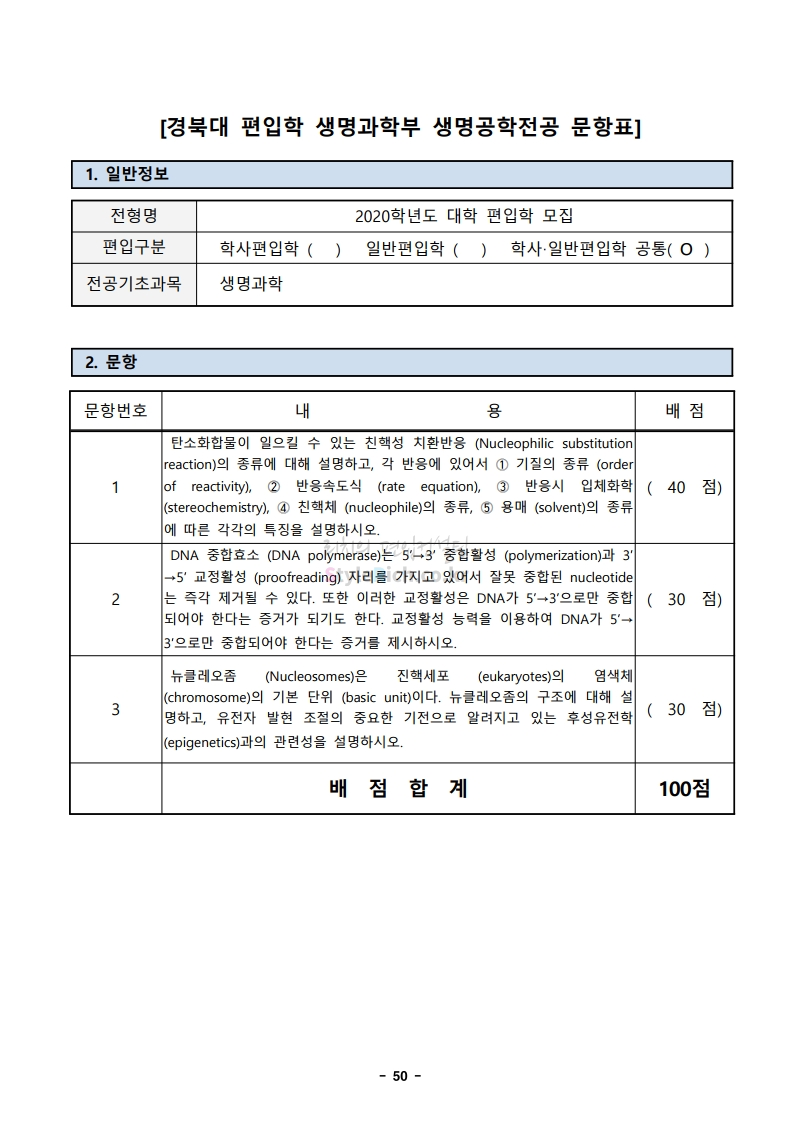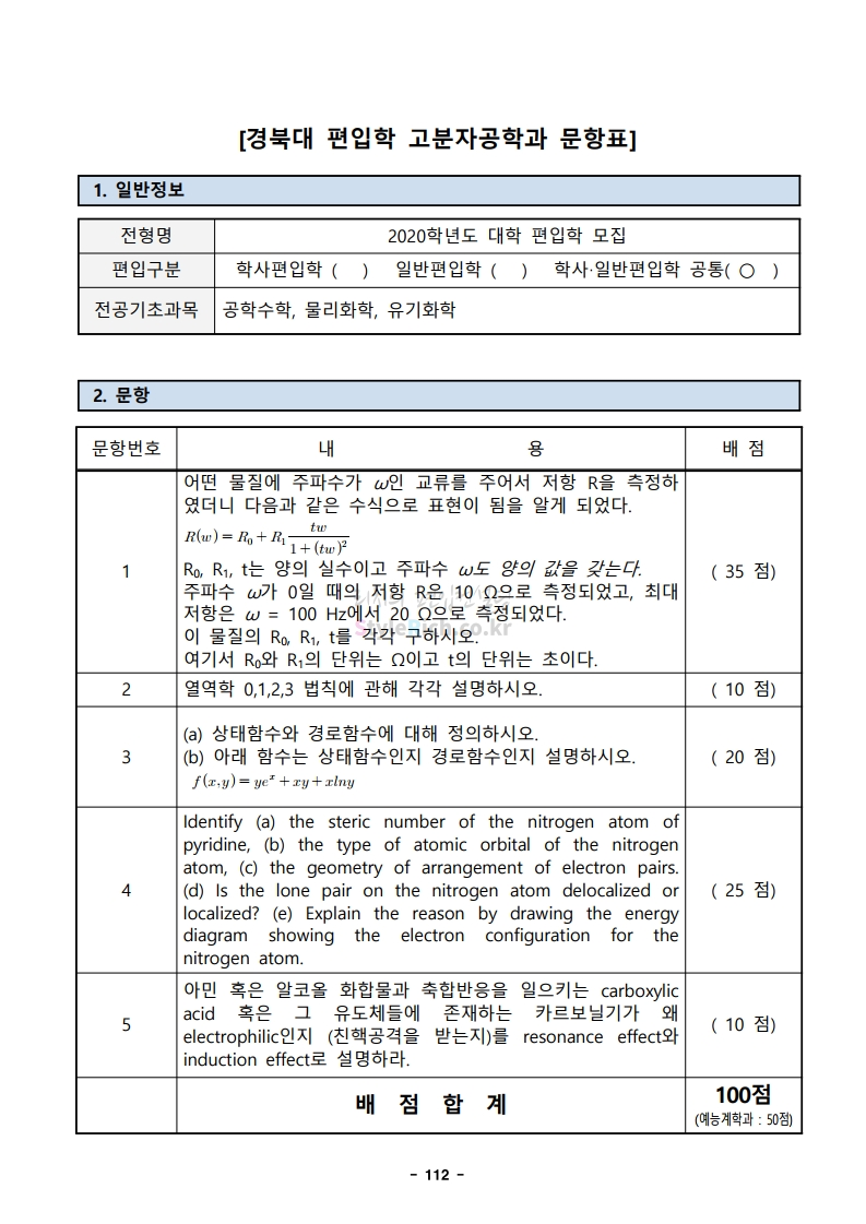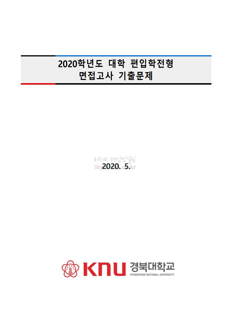 2020학년도 경북대 편입 면접 기출문제가 궁금하다면? 2021.01.07 23:05 편입 기출문제/2020학년도 기출문제 2020학년도 경북대 편입 면접기출문제를 살펴보겠습니다. * 수학과 1번 답안 오류 수정 반영하였습니다. * 기출문제가 없는 학과(부)는 모집하지 않았거나 응시자가 없는 모집단위입니다. <출처: 경북대> [2020학년도 경북대 학부모 설명회] 장학제도 및 취업 프로그램 안내 공유하기 게시글 관리 리치의 편입컨설팅 저작자표시 비영리 변경금지 (새창열림) '편입 기출문제 > 2020학년도 기출문제' 카테고리의 다른 글 2020학년도 영남대 편입 기출문제가 궁금하다면? (0) 2021.01.09 2020학년도 세종대 편입 기출문제가 궁금하다면? (0) 2020.09.27 2020학년도 한국산업기술대 편입 기출문제가 궁금하다면? (0) 2020.09.13 2020학년도 중앙대 편입 기출문제가 궁금하다면? (0) 2020.09.06 2020학년도 명지대 편입 기출문제가 궁금하다면? (0) 2020.08.30 댓글 공유하기 다른 글 댓글 이 글 공유하기 구독하기 구독하기 카카오톡 카카오톡 라인 라인 트위터 트위터 Facebook Facebook 카카오스토리 카카오스토리 밴드 밴드 네이버 블로그 네이버 블로그 Pocket Pocket Evernote Evernote 다른 글 2020학년도 영남대 편입 기출문제가 궁금하다면? 2020학년도 영남대 편입 기출문제가 궁금하다면? 2021.01.09 2020학년도 세종대 편입 기출문제가 궁금하다면? 2020학년도 세종대 편입 기출문제가 궁금하다면? 2020.09.27 2020학년도 한국산업기술대 편입 기출문제가 궁금하다면? 2020학년도 한국산업기술대 편입 기출문제가 궁금하다면? 2020.09.13 2020학년도 중앙대 편입 기출문제가 궁금하다면? 2020학년도 중앙대 편입 기출문제가 궁금하다면? 2020.09.06 다른 글 더 둘러보기