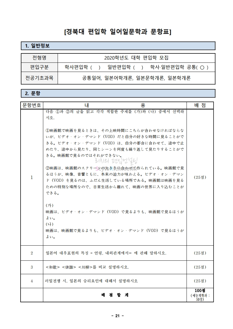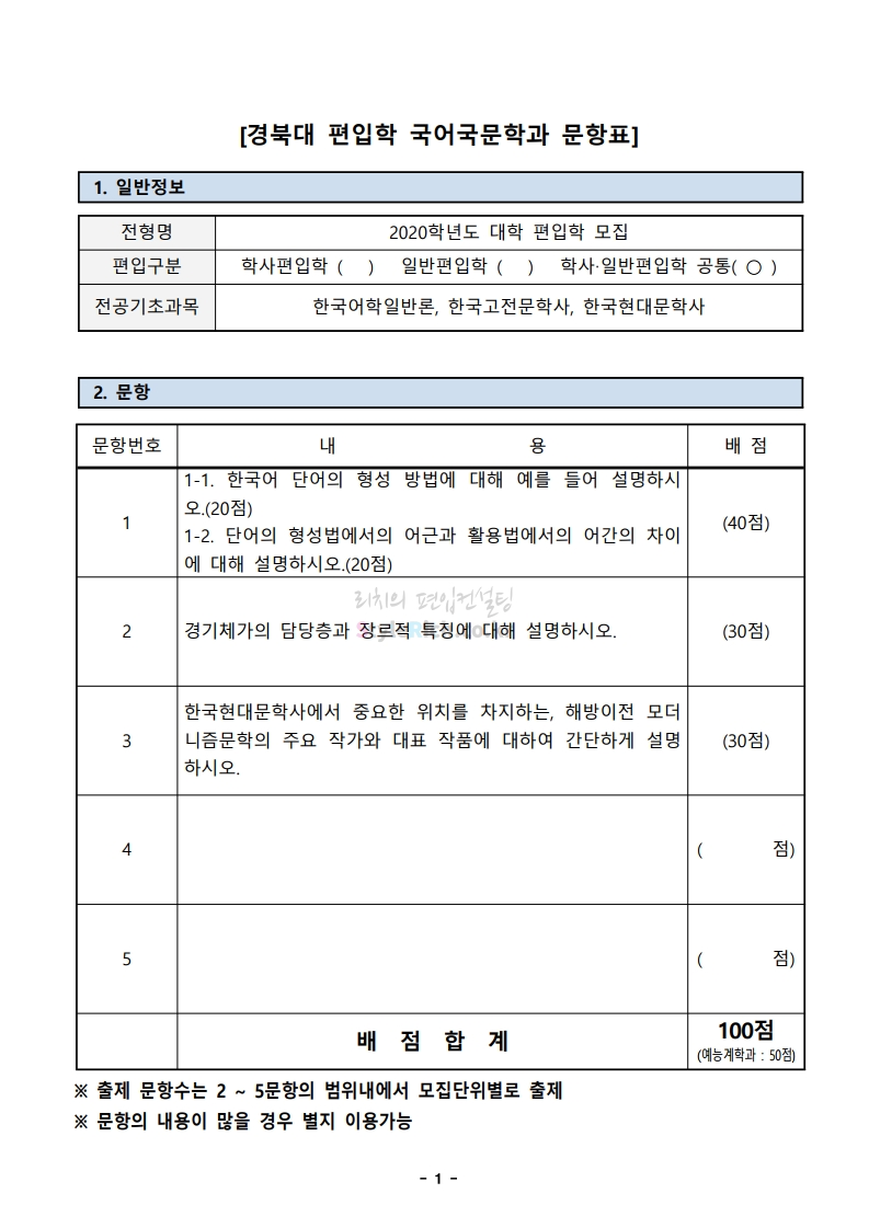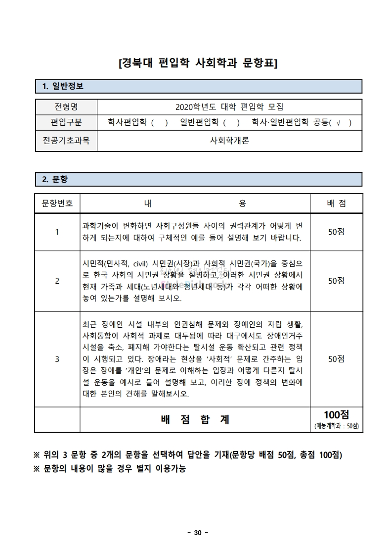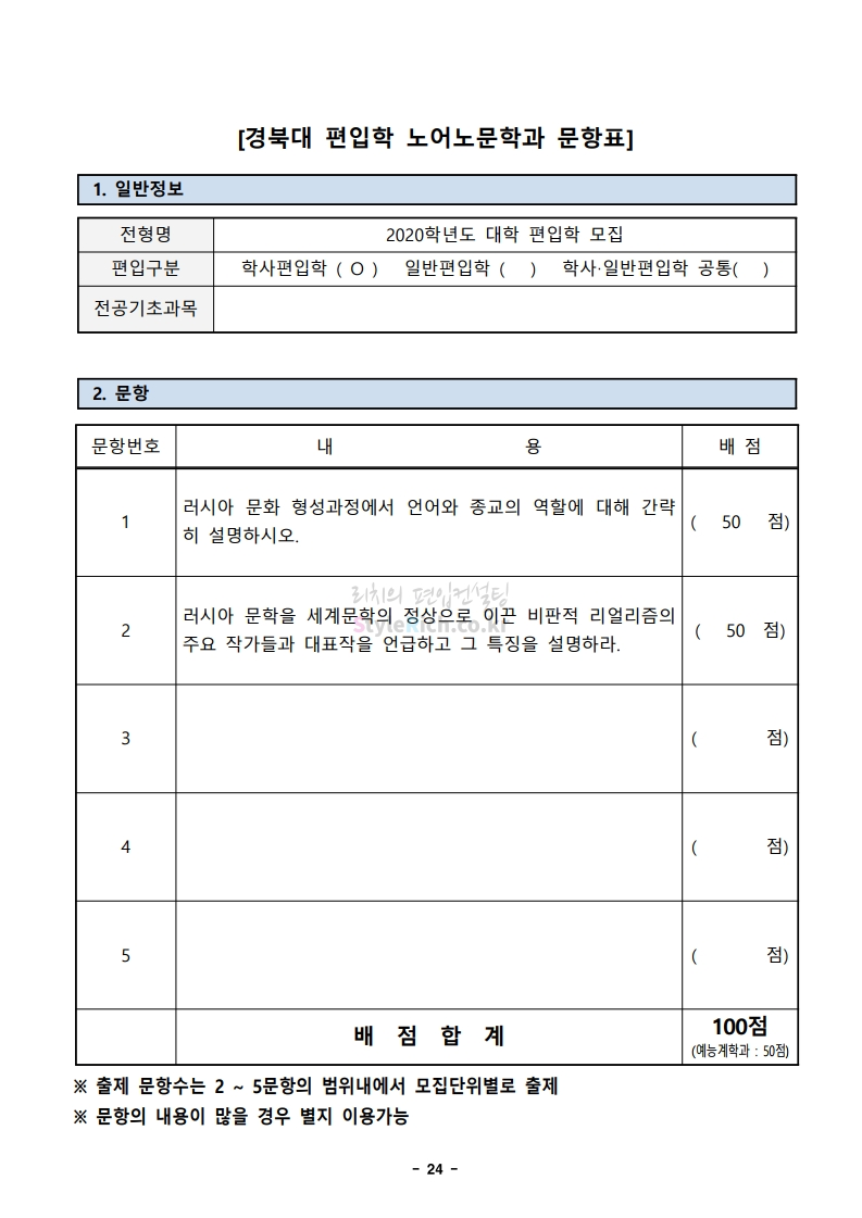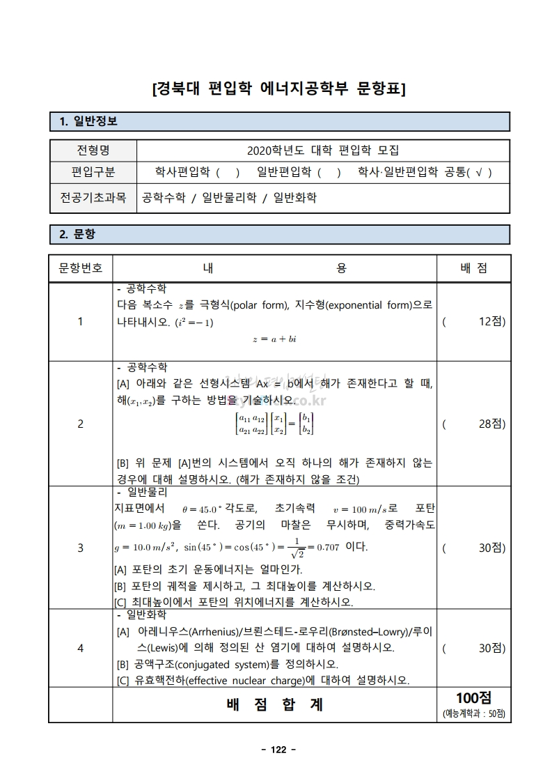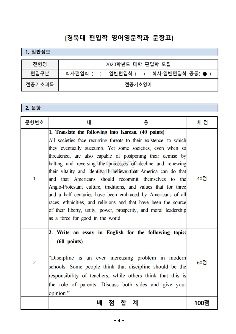 2020학년도 경북대 편입 면접 기출문제가 궁금하다면? 2021.01.07 23:05 편입 기출문제/2020학년도 기출문제 2020학년도 경북대 편입 면접기출문제를 살펴보겠습니다. * 수학과 1번 답안 오류 수정 반영하였습니다. * 기출문제가 없는 학과(부)는 모집하지 않았거나 응시자가 없는 모집단위입니다. <출처: 경북대> [2020학년도 경북대 학부모 설명회] 장학제도 및 취업 프로그램 안내 공유하기 게시글 관리 리치의 편입컨설팅 저작자표시 비영리 변경금지 (새창열림) '편입 기출문제 > 2020학년도 기출문제' 카테고리의 다른 글 2020학년도 영남대 편입 기출문제가 궁금하다면? (0) 2021.01.09 2020학년도 세종대 편입 기출문제가 궁금하다면? (0) 2020.09.27 2020학년도 한국산업기술대 편입 기출문제가 궁금하다면? (0) 2020.09.13 2020학년도 중앙대 편입 기출문제가 궁금하다면? (0) 2020.09.06 2020학년도 명지대 편입 기출문제가 궁금하다면? (0) 2020.08.30 댓글 공유하기 다른 글 댓글 이 글 공유하기 구독하기 구독하기 카카오톡 카카오톡 라인 라인 트위터 트위터 Facebook Facebook 카카오스토리 카카오스토리 밴드 밴드 네이버 블로그 네이버 블로그 Pocket Pocket Evernote Evernote 다른 글 2020학년도 영남대 편입 기출문제가 궁금하다면? 2020학년도 영남대 편입 기출문제가 궁금하다면? 2021.01.09 2020학년도 세종대 편입 기출문제가 궁금하다면? 2020학년도 세종대 편입 기출문제가 궁금하다면? 2020.09.27 2020학년도 한국산업기술대 편입 기출문제가 궁금하다면? 2020학년도 한국산업기술대 편입 기출문제가 궁금하다면? 2020.09.13 2020학년도 중앙대 편입 기출문제가 궁금하다면? 2020학년도 중앙대 편입 기출문제가 궁금하다면? 2020.09.06 다른 글 더 둘러보기