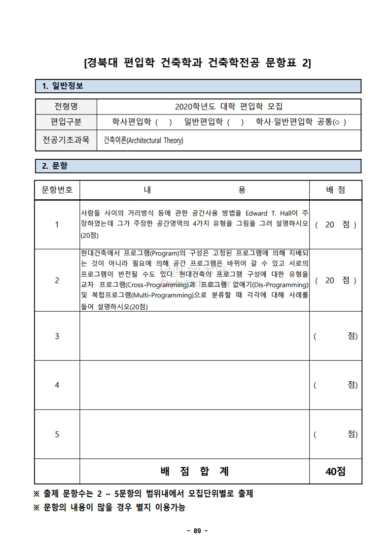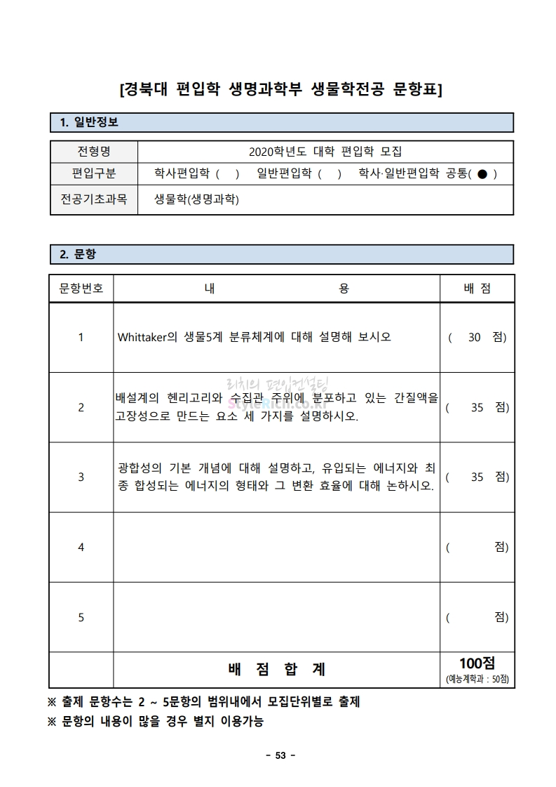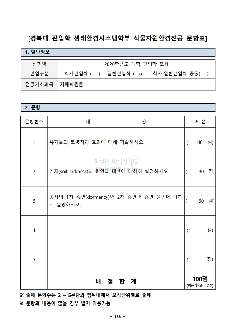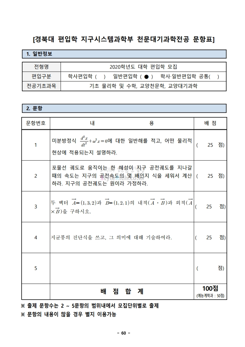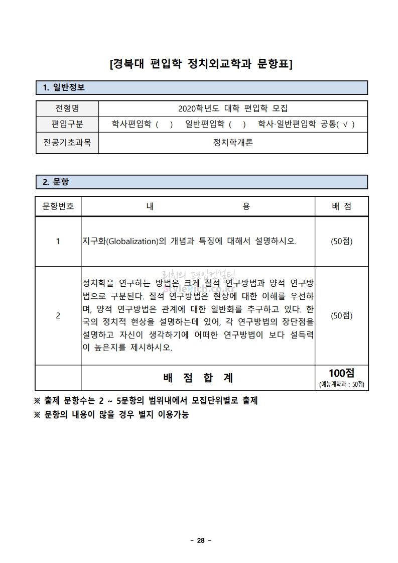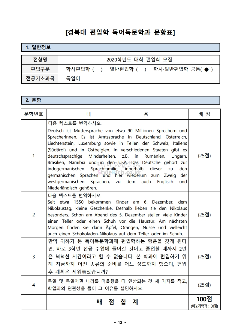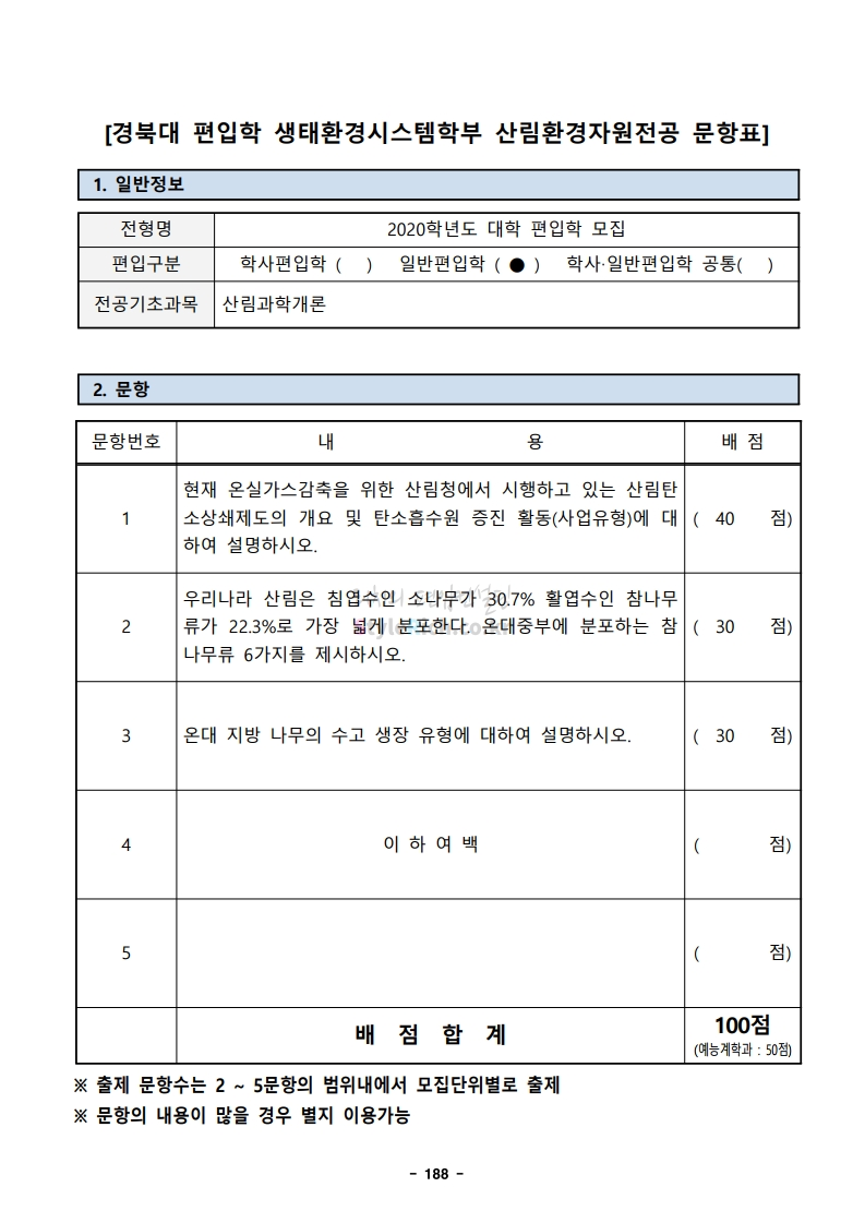 2020학년도 경북대 편입 면접 기출문제가 궁금하다면? 2021.01.07 23:05 편입 기출문제/2020학년도 기출문제 2020학년도 경북대 편입 면접기출문제를 살펴보겠습니다. * 수학과 1번 답안 오류 수정 반영하였습니다. * 기출문제가 없는 학과(부)는 모집하지 않았거나 응시자가 없는 모집단위입니다. <출처: 경북대> [2020학년도 경북대 학부모 설명회] 장학제도 및 취업 프로그램 안내 공유하기 게시글 관리 리치의 편입컨설팅 저작자표시 비영리 변경금지 (새창열림) '편입 기출문제 > 2020학년도 기출문제' 카테고리의 다른 글 2020학년도 영남대 편입 기출문제가 궁금하다면? (0) 2021.01.09 2020학년도 세종대 편입 기출문제가 궁금하다면? (0) 2020.09.27 2020학년도 한국산업기술대 편입 기출문제가 궁금하다면? (0) 2020.09.13 2020학년도 중앙대 편입 기출문제가 궁금하다면? (0) 2020.09.06 2020학년도 명지대 편입 기출문제가 궁금하다면? (0) 2020.08.30 댓글 공유하기 다른 글 댓글 이 글 공유하기 구독하기 구독하기 카카오톡 카카오톡 라인 라인 트위터 트위터 Facebook Facebook 카카오스토리 카카오스토리 밴드 밴드 네이버 블로그 네이버 블로그 Pocket Pocket Evernote Evernote 다른 글 2020학년도 영남대 편입 기출문제가 궁금하다면? 2020학년도 영남대 편입 기출문제가 궁금하다면? 2021.01.09 2020학년도 세종대 편입 기출문제가 궁금하다면? 2020학년도 세종대 편입 기출문제가 궁금하다면? 2020.09.27 2020학년도 한국산업기술대 편입 기출문제가 궁금하다면? 2020학년도 한국산업기술대 편입 기출문제가 궁금하다면? 2020.09.13 2020학년도 중앙대 편입 기출문제가 궁금하다면? 2020학년도 중앙대 편입 기출문제가 궁금하다면? 2020.09.06 다른 글 더 둘러보기