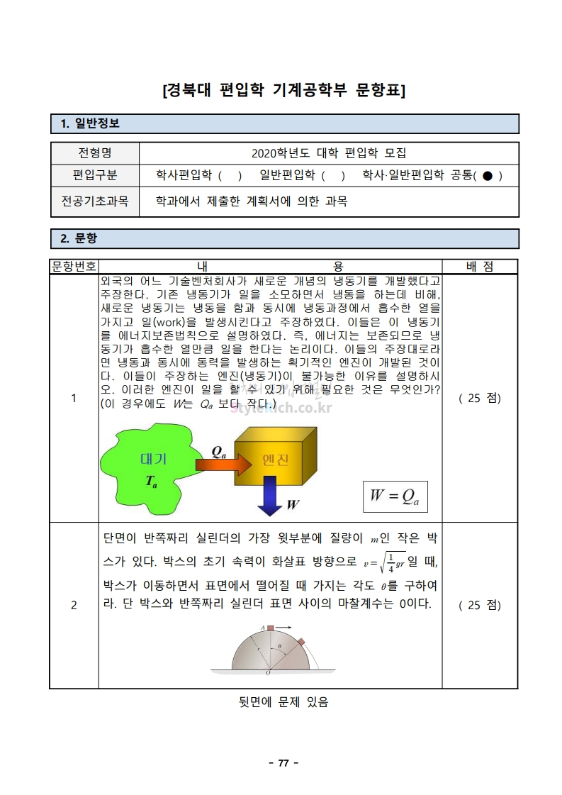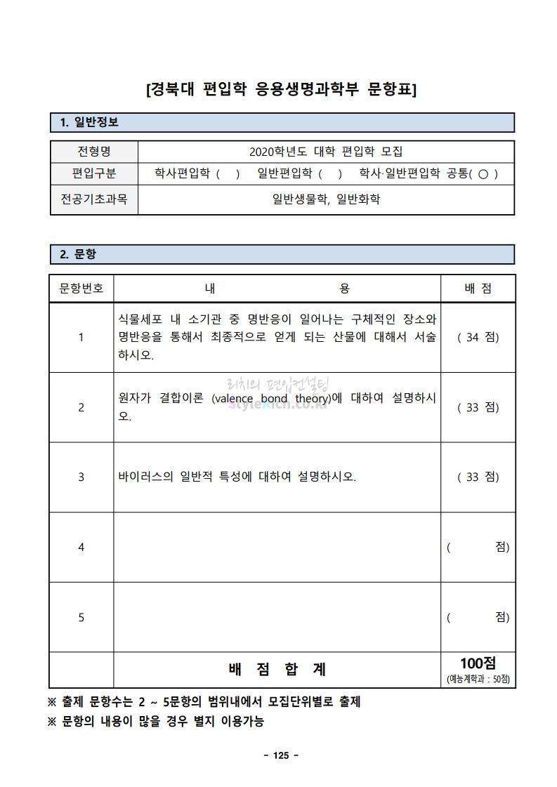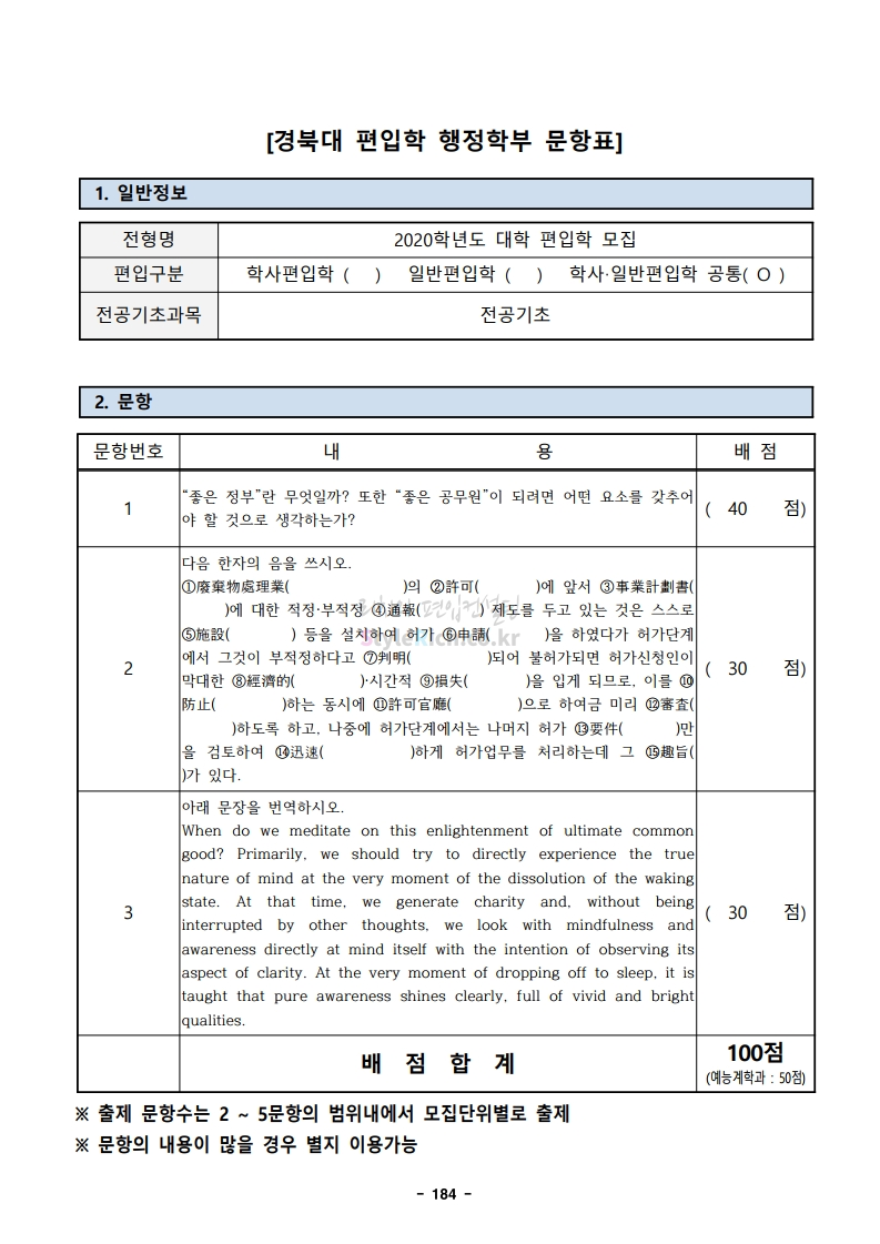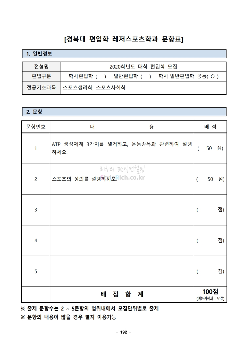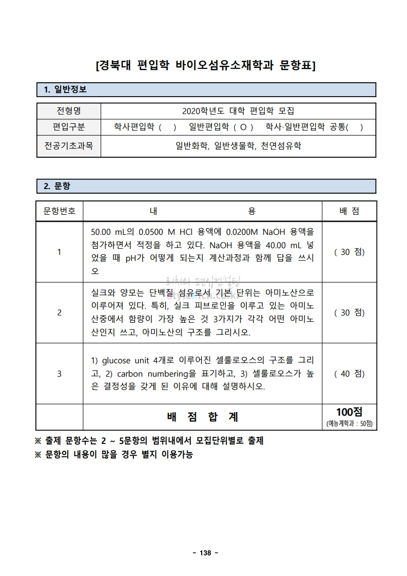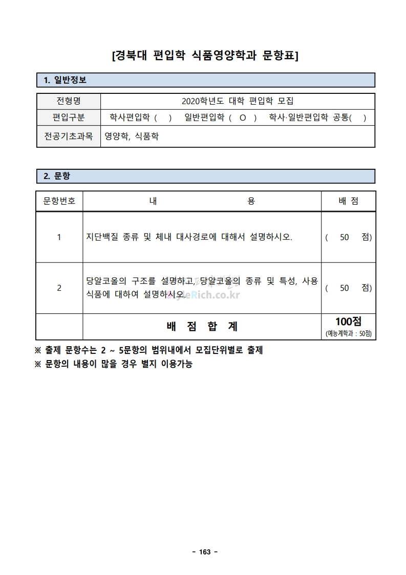 2020학년도 경북대 편입 면접 기출문제가 궁금하다면? 2021.01.07 23:05 편입 기출문제/2020학년도 기출문제 2020학년도 경북대 편입 면접기출문제를 살펴보겠습니다. * 수학과 1번 답안 오류 수정 반영하였습니다. * 기출문제가 없는 학과(부)는 모집하지 않았거나 응시자가 없는 모집단위입니다. <출처: 경북대> [2020학년도 경북대 학부모 설명회] 장학제도 및 취업 프로그램 안내 공유하기 게시글 관리 리치의 편입컨설팅 저작자표시 비영리 변경금지 (새창열림) '편입 기출문제 > 2020학년도 기출문제' 카테고리의 다른 글 2020학년도 영남대 편입 기출문제가 궁금하다면? (0) 2021.01.09 2020학년도 세종대 편입 기출문제가 궁금하다면? (0) 2020.09.27 2020학년도 한국산업기술대 편입 기출문제가 궁금하다면? (0) 2020.09.13 2020학년도 중앙대 편입 기출문제가 궁금하다면? (0) 2020.09.06 2020학년도 명지대 편입 기출문제가 궁금하다면? (0) 2020.08.30 댓글 공유하기 다른 글 댓글 이 글 공유하기 구독하기 구독하기 카카오톡 카카오톡 라인 라인 트위터 트위터 Facebook Facebook 카카오스토리 카카오스토리 밴드 밴드 네이버 블로그 네이버 블로그 Pocket Pocket Evernote Evernote 다른 글 2020학년도 영남대 편입 기출문제가 궁금하다면? 2020학년도 영남대 편입 기출문제가 궁금하다면? 2021.01.09 2020학년도 세종대 편입 기출문제가 궁금하다면? 2020학년도 세종대 편입 기출문제가 궁금하다면? 2020.09.27 2020학년도 한국산업기술대 편입 기출문제가 궁금하다면? 2020학년도 한국산업기술대 편입 기출문제가 궁금하다면? 2020.09.13 2020학년도 중앙대 편입 기출문제가 궁금하다면? 2020학년도 중앙대 편입 기출문제가 궁금하다면? 2020.09.06 다른 글 더 둘러보기