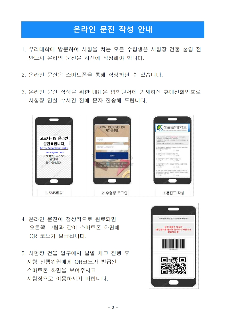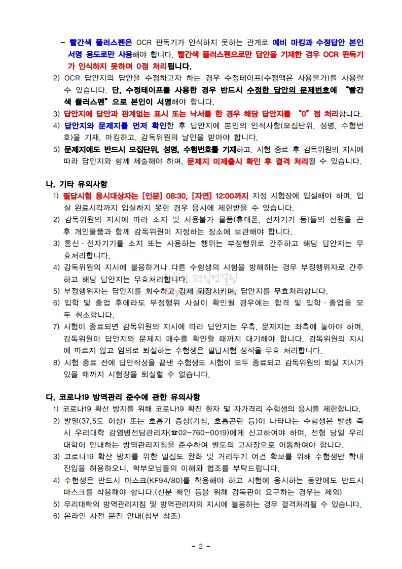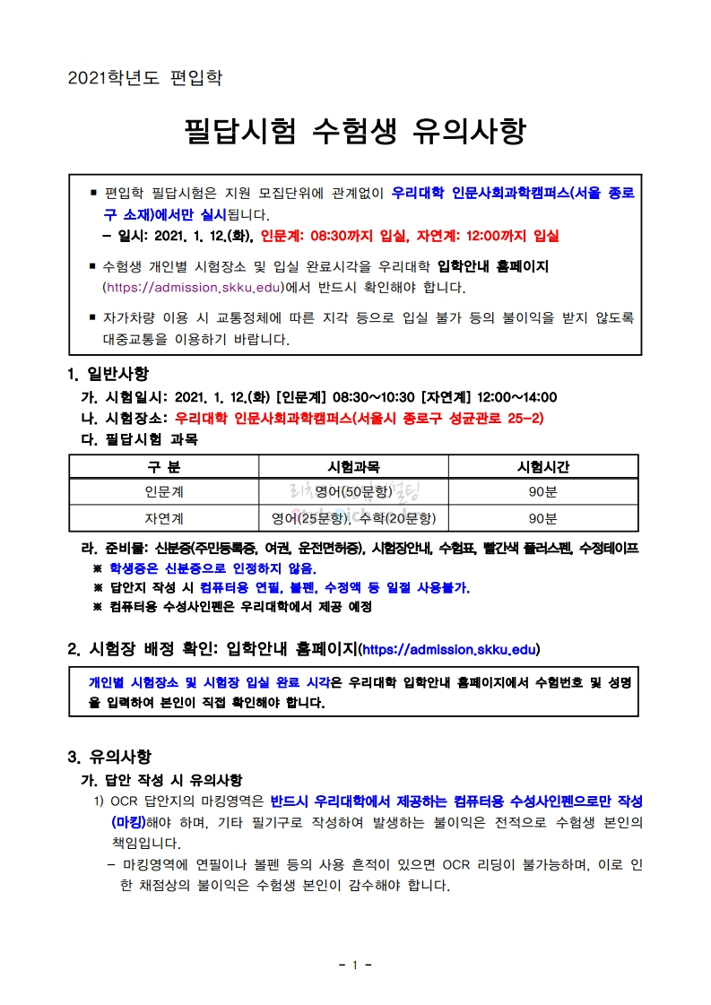 성균관대 편입 2021학년도 필답시험 유의사항 간편하게 보자! 2021.01.09 03:33 편입 유의사항/2021학년도 유의사항 2021학년도 성균관대 편입 필답시험 유의사항을 살펴보겠습니다. * 내용의 일부가 변경되거나 오표기가 있을 수 있으므로 시험 전 반드시 성균관대 입학처에서 최종적으로 확인바랍니다. <출처: 성균관대> 공유하기 게시글 관리 리치의 편입컨설팅 저작자표시 비영리 변경금지 (새창열림) '편입 유의사항 > 2021학년도 유의사항' 카테고리의 다른 글 덕성여대 편입 2021학년도 필기고사 안내사항 간편하게 보자! (0) 2021.01.16 수원대 편입 2021학년도 필기고사 유의사항 간편하게 보자! (0) 2021.01.09 한국외대 편입 2021학년도 필기고사 유의사항 간편하게 보자! (0) 2021.01.09 한국항공대 편입 2021학년도 필기고사 안내사항 간편하게 보자! (0) 2021.01.08 인하대 편입 2021학년도 필기고사 유의사항 간편하게 보자! (0) 2021.01.08 댓글 공유하기 다른 글 댓글 이 글 공유하기 구독하기 구독하기 카카오톡 카카오톡 라인 라인 트위터 트위터 Facebook Facebook 카카오스토리 카카오스토리 밴드 밴드 네이버 블로그 네이버 블로그 Pocket Pocket Evernote Evernote 다른 글 덕성여대 편입 2021학년도 필기고사 안내사항 간편하게 보자! 덕성여대 편입 2021학년도 필기고사 안내사항 간편하게 보자! 2021.01.16 수원대 편입 2021학년도 필기고사 유의사항 간편하게 보자! 수원대 편입 2021학년도 필기고사 유의사항 간편하게 보자! 2021.01.09 한국외대 편입 2021학년도 필기고사 유의사항 간편하게 보자! 한국외대 편입 2021학년도 필기고사 유의사항 간편하게 보자! 2021.01.09 한국항공대 편입 2021학년도 필기고사 안내사항 간편하게 보자! 한국항공대 편입 2021학년도 필기고사 안내사항 간편하게 보자! 2021.01.08 다른 글 더 둘러보기