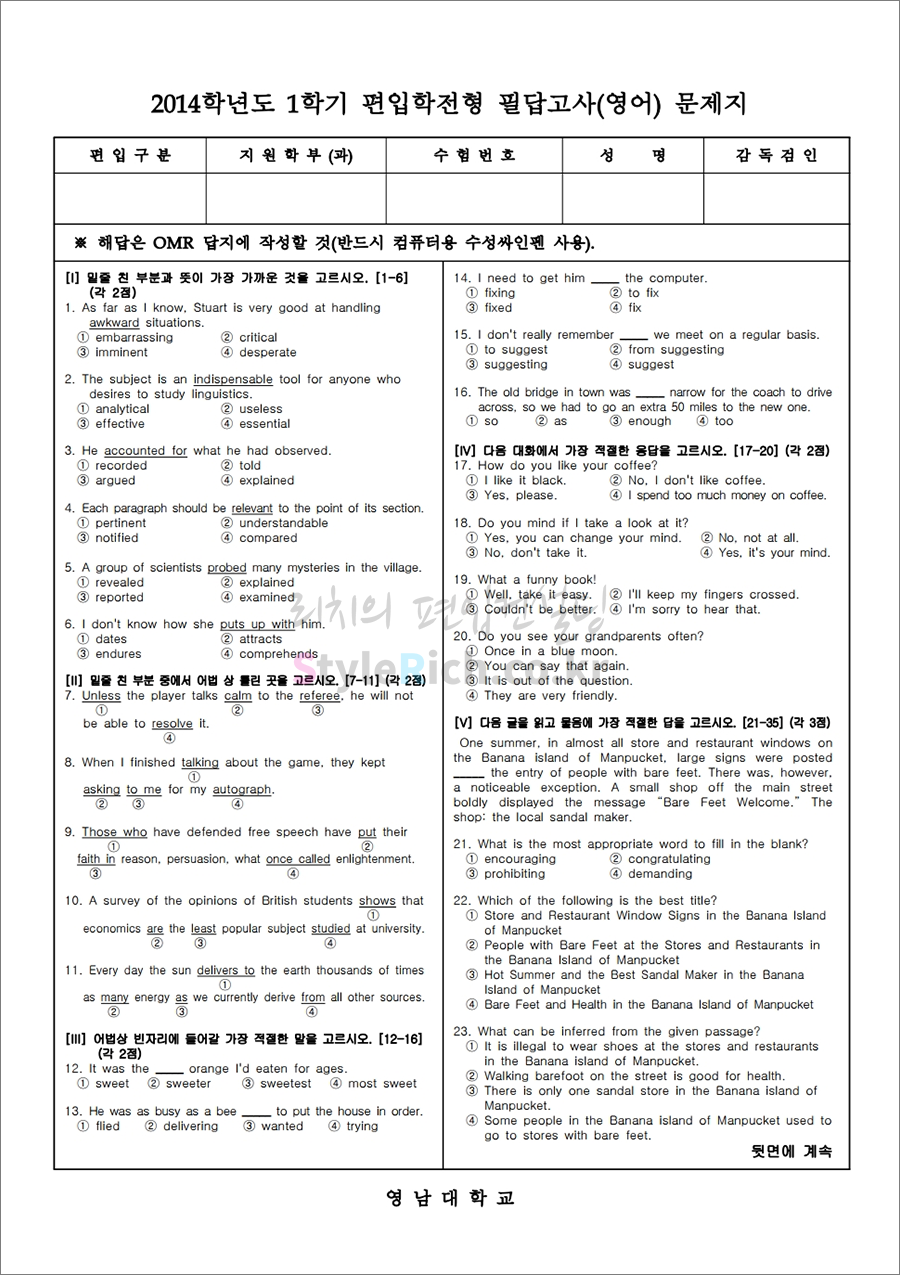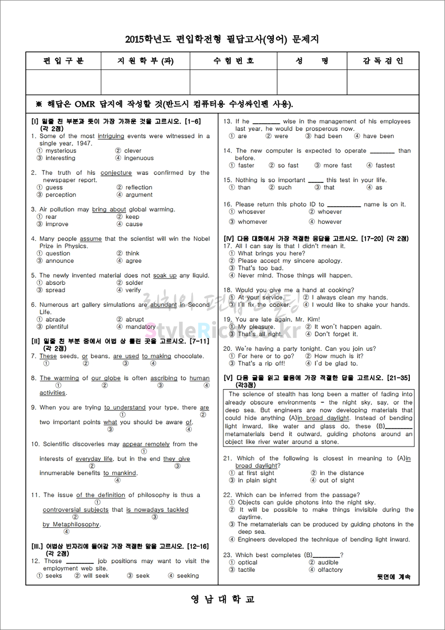 2013~2015학년도 영남대 편입 기출문제 다운받기