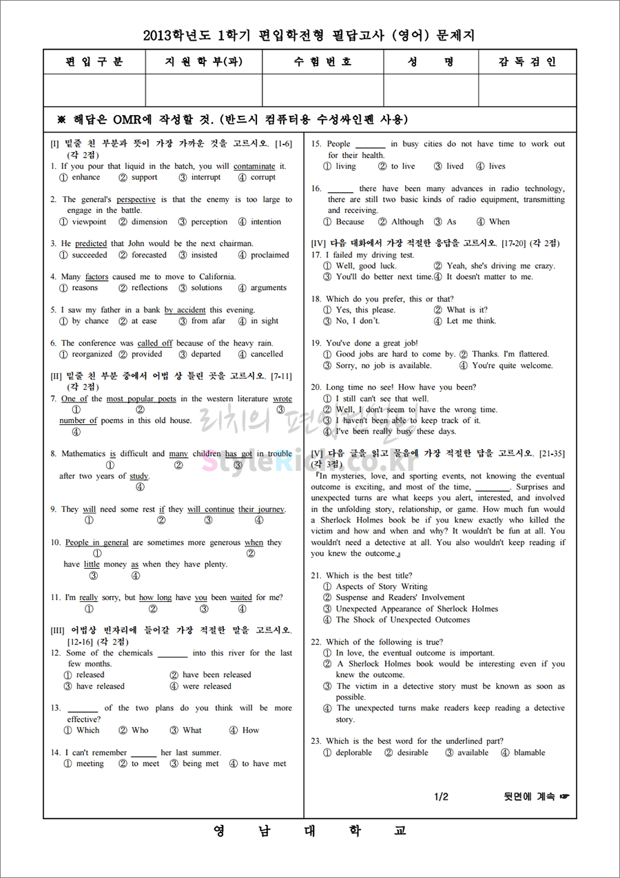 2013~2015학년도 영남대 영어 기출문제는 40문항/60분, 객관식 4지선다형, 100점 만점에 문항당 배점은 2점과 3점으로 구성되어 있습니다. 실제 전형비율 점수는 140점이기 때문에 별도 환산해 봐야 합니다.