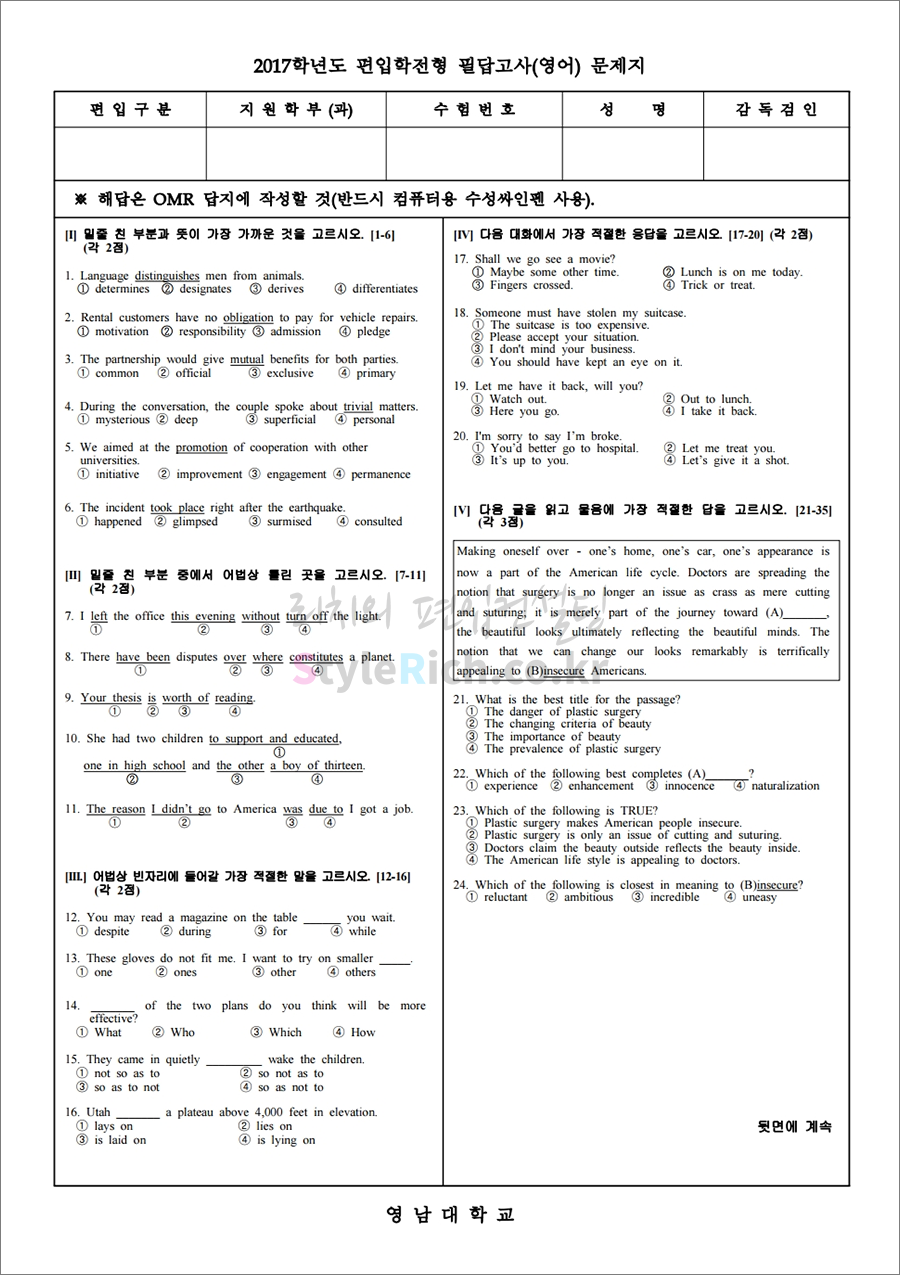 2017학년도 영남대 편입 기출문제가 궁금하다면? 2021.01.09 21:42 편입 기출문제/2017학년도 기출문제 2017학년도 영남대 편입 기출문제를 살펴보겠습니다. 2017학년도 영남대 편입 영어 기출문제는 40문항/60분, 객관식 4지선다형, 100점 만점에 문항당 배점은 1~20번까지 2점, 21~40번까지 3점으로 구성되어 있습니다. 2017학년도 영남대 편입 영어 가출문제 2017학년도 영남대 편입 기출문제 다운받기 2017학년도 편입학전형 필답고사_영어.hwp 0.03MB <출처: 영남대> 영남대 재경총동창회, 취업동문 환영회 8년째 개최 공유하기 게시글 관리 리치의 편입컨설팅 저작자표시 비영리 변경금지 (새창열림) '편입 기출문제 > 2017학년도 기출문제' 카테고리의 다른 글 단국대(천안) 편입, 2017학년도 편입 기출문제 (0) 2018.02.18 세종대 편입, 2017학년도 편입 기출문제(편입영어, 편입수학) (0) 2018.01.03 명지대 편입, 2017학년도 편입 기출문제(편입영어, 편입수학) (0) 2017.12.06 강남대 편입, 2017학년도 강남대 편입 기출문제 (0) 2017.11.25 가천대 편입, 2017학년도 가천대 편입 기출문제 (0) 2017.11.21 댓글 공유하기 다른 글 댓글 이 글 공유하기 구독하기 구독하기 카카오톡 카카오톡 라인 라인 트위터 트위터 Facebook Facebook 카카오스토리 카카오스토리 밴드 밴드 네이버 블로그 네이버 블로그 Pocket Pocket Evernote Evernote 다른 글 단국대(천안) 편입, 2017학년도 편입 기출문제 단국대(천안) 편입, 2017학년도 편입 기출문제 2018.02.18 세종대 편입, 2017학년도 편입 기출문제(편입영어, 편입수학) 세종대 편입, 2017학년도 편입 기출문제(편입영어, 편입수학) 2018.01.03 명지대 편입, 2017학년도 편입 기출문제(편입영어, 편입수학) 명지대 편입, 2017학년도 편입 기출문제(편입영어, 편입수학) 2017.12.06 강남대 편입, 2017학년도 강남대 편입 기출문제 강남대 편입, 2017학년도 강남대 편입 기출문제 2017.11.25 다른 글 더 둘러보기