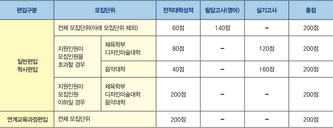 영남대 편입 전형비율은 일부 모집단위를 제외하고 총 200점 만점 중 편입영어 140점, 전적대 성적 60점입니다.