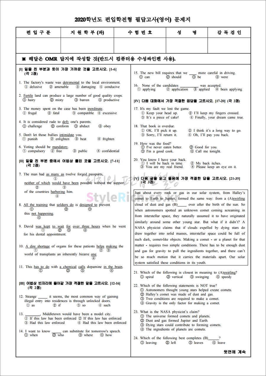 2020학년도 영남대 편입 영어 기출문제는 40문항/60분, 객관식 4지선다형, 100점 만점에 문항당 배점은 1~20번까지 2점, 21~40번까지 3점으로 구성되어 있습니다. 뒷 부분의 배점이 높기 때문에 앞의 문항에 너무 치중하여 뒷 문항을 놓치지 않도록 유의하세요. 실제 전형비율 점수가 140점이기 때문에 별도의 환산이 필요합니다.