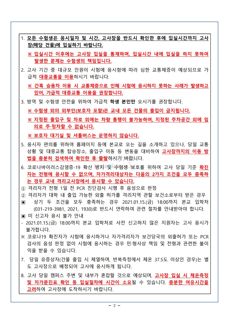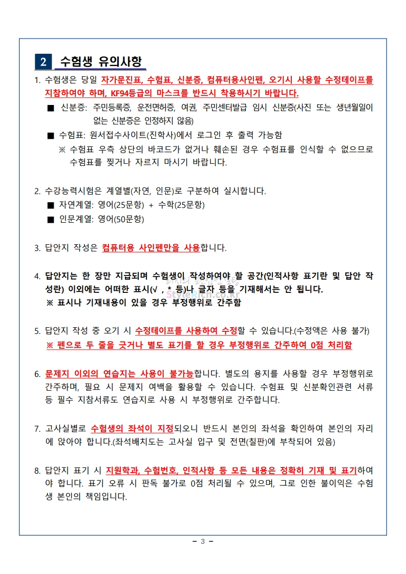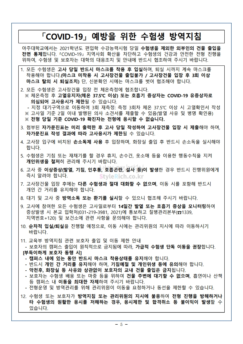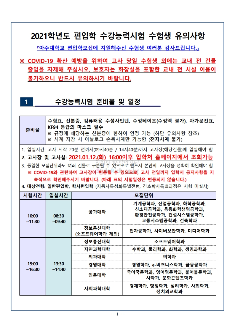 아주대 편입 2021학년도 필기시험 유의사항 간편하게 보자! 2021.01.16 14:49 편입 유의사항/2021학년도 유의사항 2021학년도 아주대 편입 필기시험 유의사항을 살펴보겠습니다. * 내용의 일부가 변경되거나 오표기가 있을 수 있으므로 시험 전 반드시 아주대 입학처에서 최종적으로 확인바랍니다. <출처: 아주대> [랜선 캠퍼스투어 1편] 누워서 아주대 한바퀴! | 아주대학교 온라인 캠퍼스투어 영상 | 아주대학교 홍보대사 AURA 공유하기 게시글 관리 리치의 편입컨설팅 저작자표시 비영리 변경금지 (새창열림) '편입 유의사항 > 2021학년도 유의사항' 카테고리의 다른 글 서울시립대 편입 2021학년도 전공적성 안내사항 간편하게 보자! (0) 2021.01.16 한성대 편입 2021학년도 필기시험 안내사항 간편하게 보자! (0) 2021.01.16 덕성여대 편입 2021학년도 필기고사 안내사항 간편하게 보자! (0) 2021.01.16 수원대 편입 2021학년도 필기고사 유의사항 간편하게 보자! (0) 2021.01.09 성균관대 편입 2021학년도 필답시험 유의사항 간편하게 보자! (0) 2021.01.09 댓글 공유하기 다른 글 댓글 이 글 공유하기 구독하기 구독하기 카카오톡 카카오톡 라인 라인 트위터 트위터 Facebook Facebook 카카오스토리 카카오스토리 밴드 밴드 네이버 블로그 네이버 블로그 Pocket Pocket Evernote Evernote 다른 글 서울시립대 편입 2021학년도 전공적성 안내사항 간편하게 보자! 서울시립대 편입 2021학년도 전공적성 안내사항 간편하게 보자! 2021.01.16 한성대 편입 2021학년도 필기시험 안내사항 간편하게 보자! 한성대 편입 2021학년도 필기시험 안내사항 간편하게 보자! 2021.01.16 덕성여대 편입 2021학년도 필기고사 안내사항 간편하게 보자! 덕성여대 편입 2021학년도 필기고사 안내사항 간편하게 보자! 2021.01.16 수원대 편입 2021학년도 필기고사 유의사항 간편하게 보자! 수원대 편입 2021학년도 필기고사 유의사항 간편하게 보자! 2021.01.09 다른 글 더 둘러보기