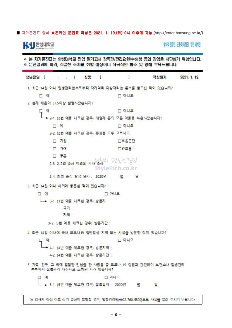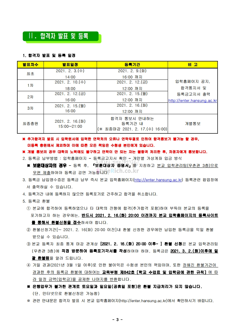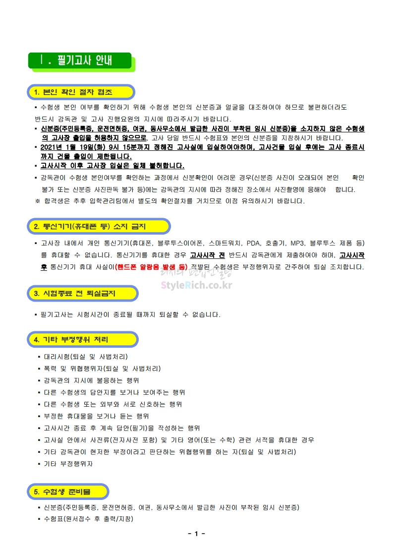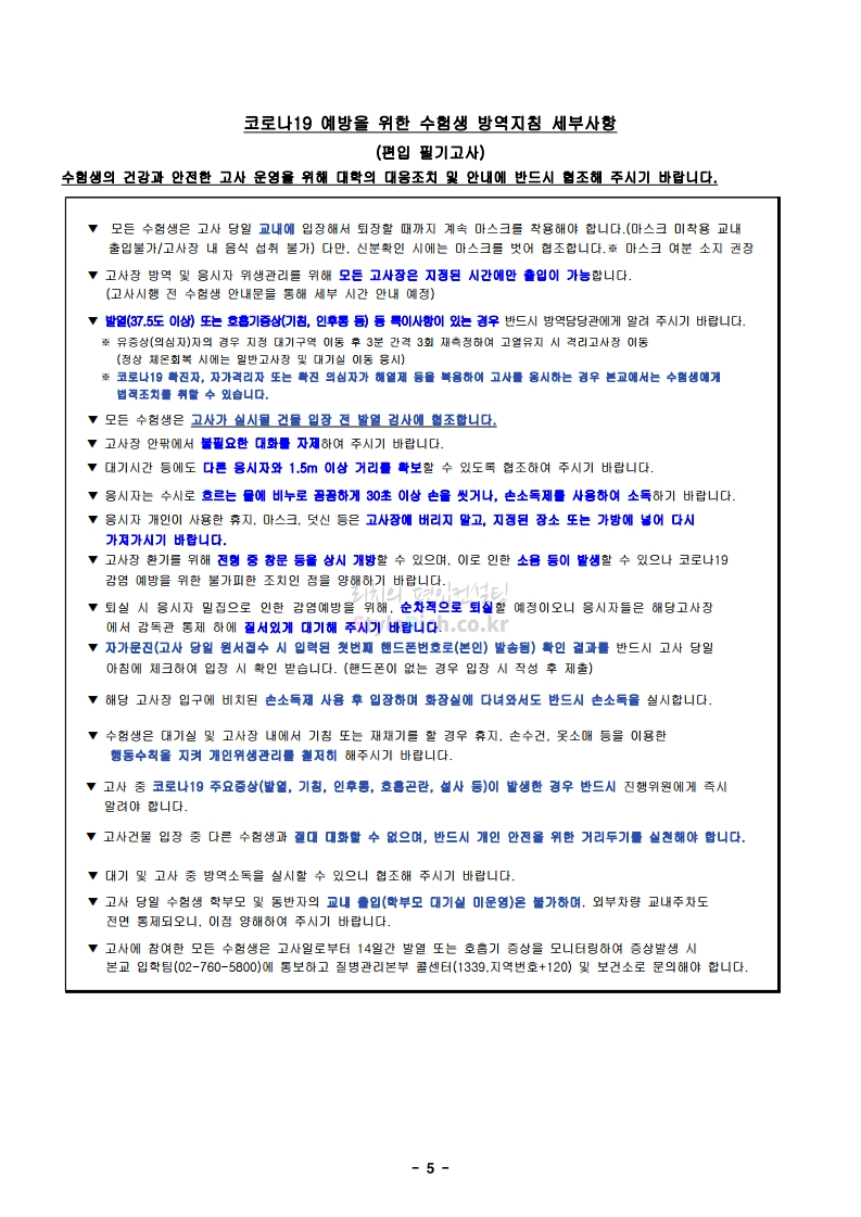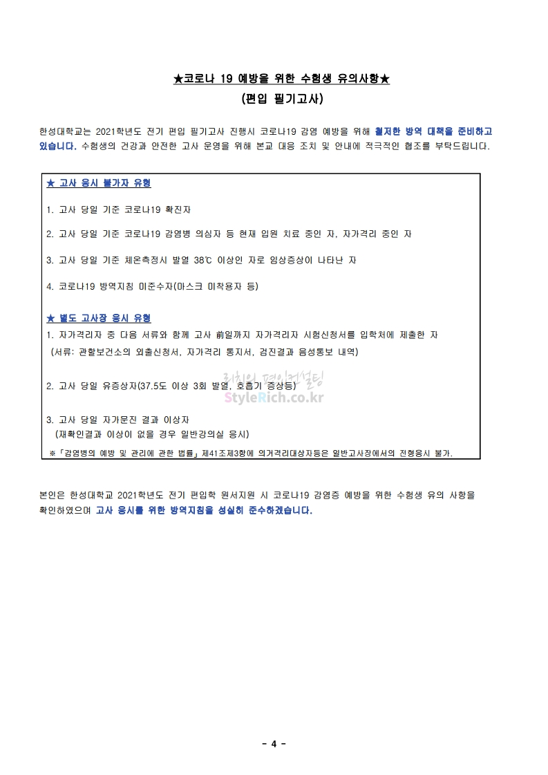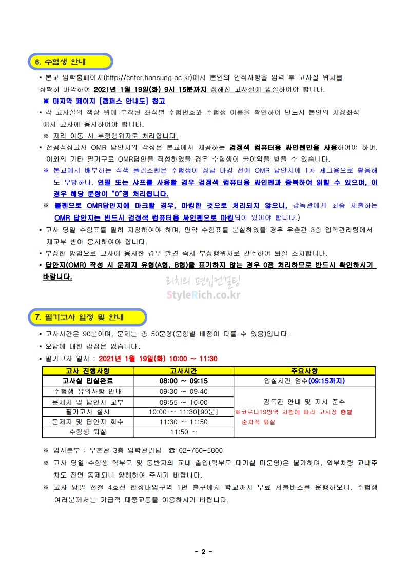 한성대 편입 2021학년도 필기시험 안내사항 간편하게 보자! 2021.01.16 16:51 편입 유의사항/2021학년도 유의사항 2021학년도 한성대 편입 필기시험 안내사항을 살펴보겠습니다. * 내용의 일부가 변경되거나 오표기가 있을 수 있으므로 시험 전 반드시 한성대 입학처에서 최종적으로 확인바랍니다. <출처: 한성대> 2021학년도 신입생 오리엔테이션 예고편 공유하기 게시글 관리 리치의 편입컨설팅 저작자표시 비영리 변경금지 (새창열림) '편입 유의사항 > 2021학년도 유의사항' 카테고리의 다른 글 상명대 편입 2021학년도 필기고사 안내사항 간편하게 보자! (0) 2021.01.16 서울시립대 편입 2021학년도 전공적성 안내사항 간편하게 보자! (0) 2021.01.16 아주대 편입 2021학년도 필기시험 유의사항 간편하게 보자! (0) 2021.01.16 덕성여대 편입 2021학년도 필기고사 안내사항 간편하게 보자! (0) 2021.01.16 수원대 편입 2021학년도 필기고사 유의사항 간편하게 보자! (0) 2021.01.09 댓글 공유하기 다른 글 댓글 이 글 공유하기 구독하기 구독하기 카카오톡 카카오톡 라인 라인 트위터 트위터 Facebook Facebook 카카오스토리 카카오스토리 밴드 밴드 네이버 블로그 네이버 블로그 Pocket Pocket Evernote Evernote 다른 글 상명대 편입 2021학년도 필기고사 안내사항 간편하게 보자! 상명대 편입 2021학년도 필기고사 안내사항 간편하게 보자! 2021.01.16 서울시립대 편입 2021학년도 전공적성 안내사항 간편하게 보자! 서울시립대 편입 2021학년도 전공적성 안내사항 간편하게 보자! 2021.01.16 아주대 편입 2021학년도 필기시험 유의사항 간편하게 보자! 아주대 편입 2021학년도 필기시험 유의사항 간편하게 보자! 2021.01.16 덕성여대 편입 2021학년도 필기고사 안내사항 간편하게 보자! 덕성여대 편입 2021학년도 필기고사 안내사항 간편하게 보자! 2021.01.16 다른 글 더 둘러보기